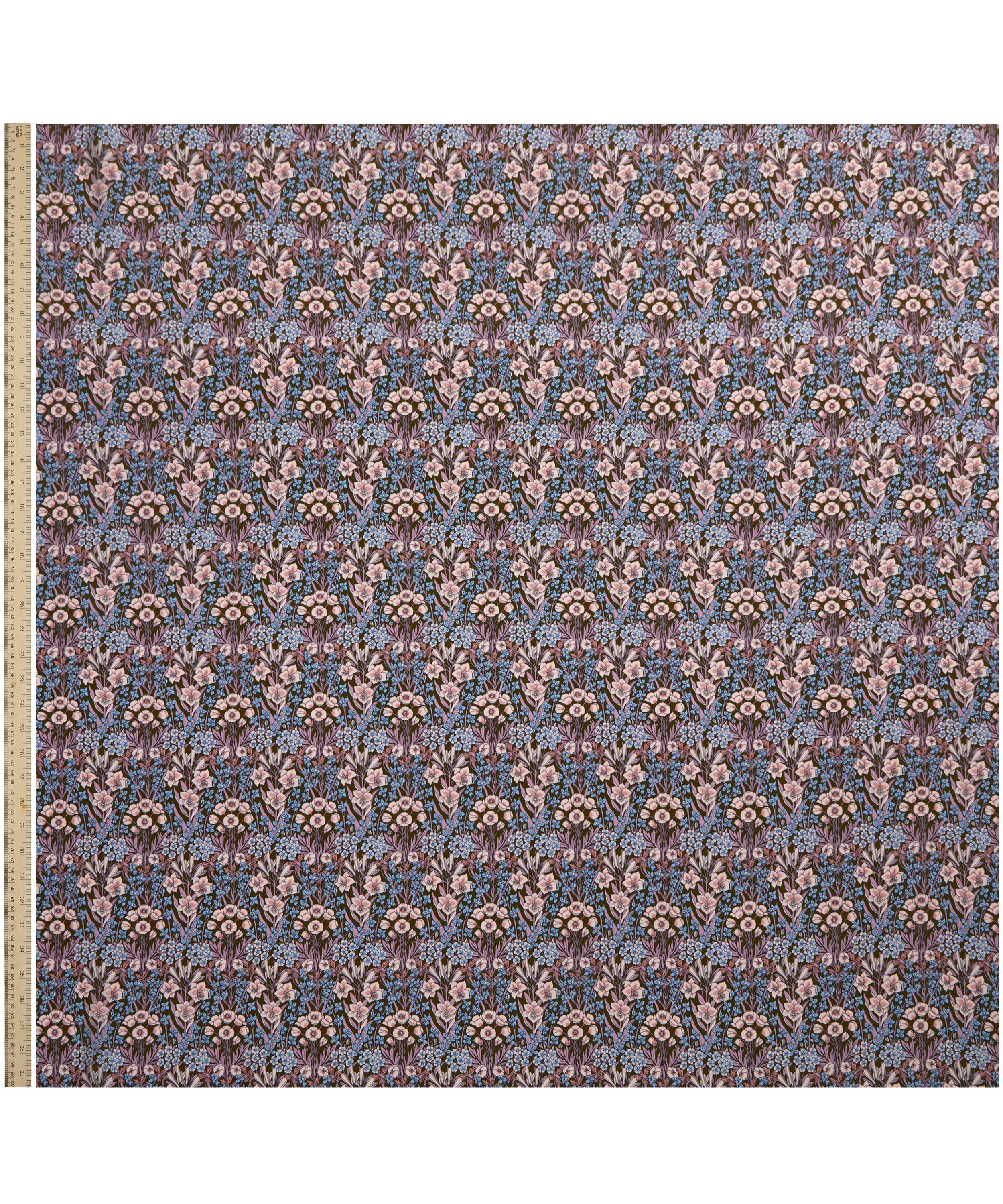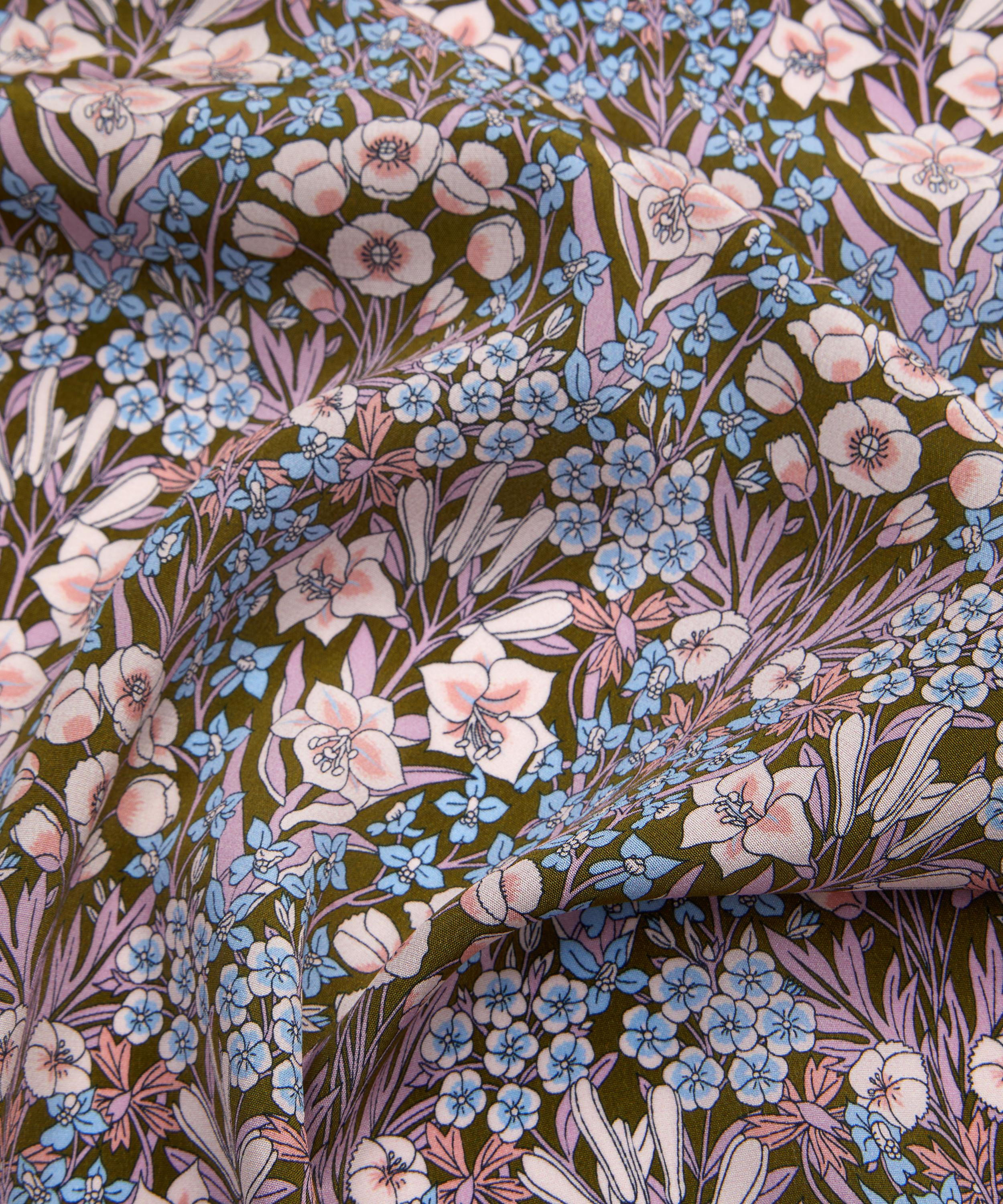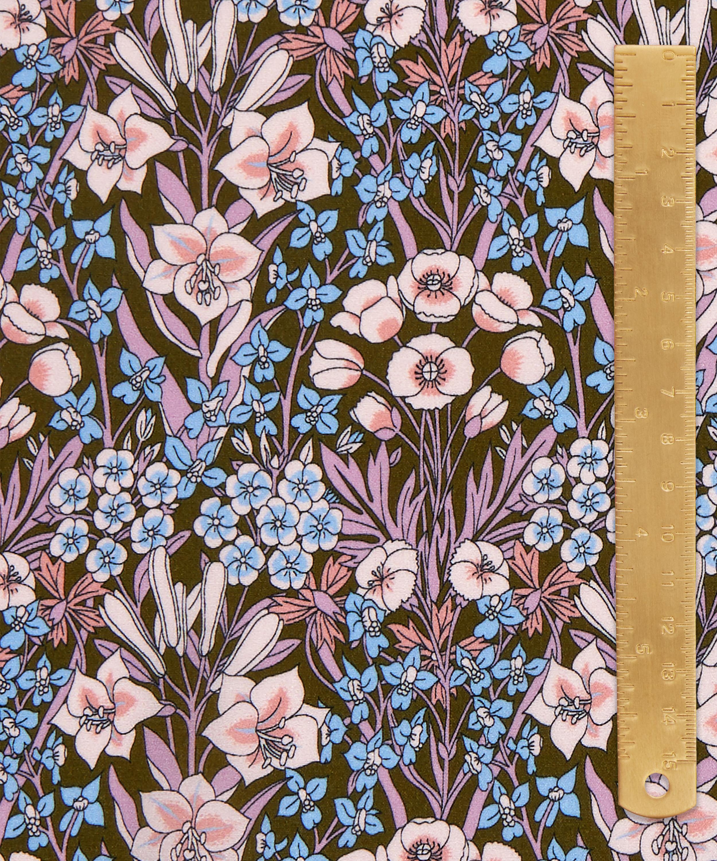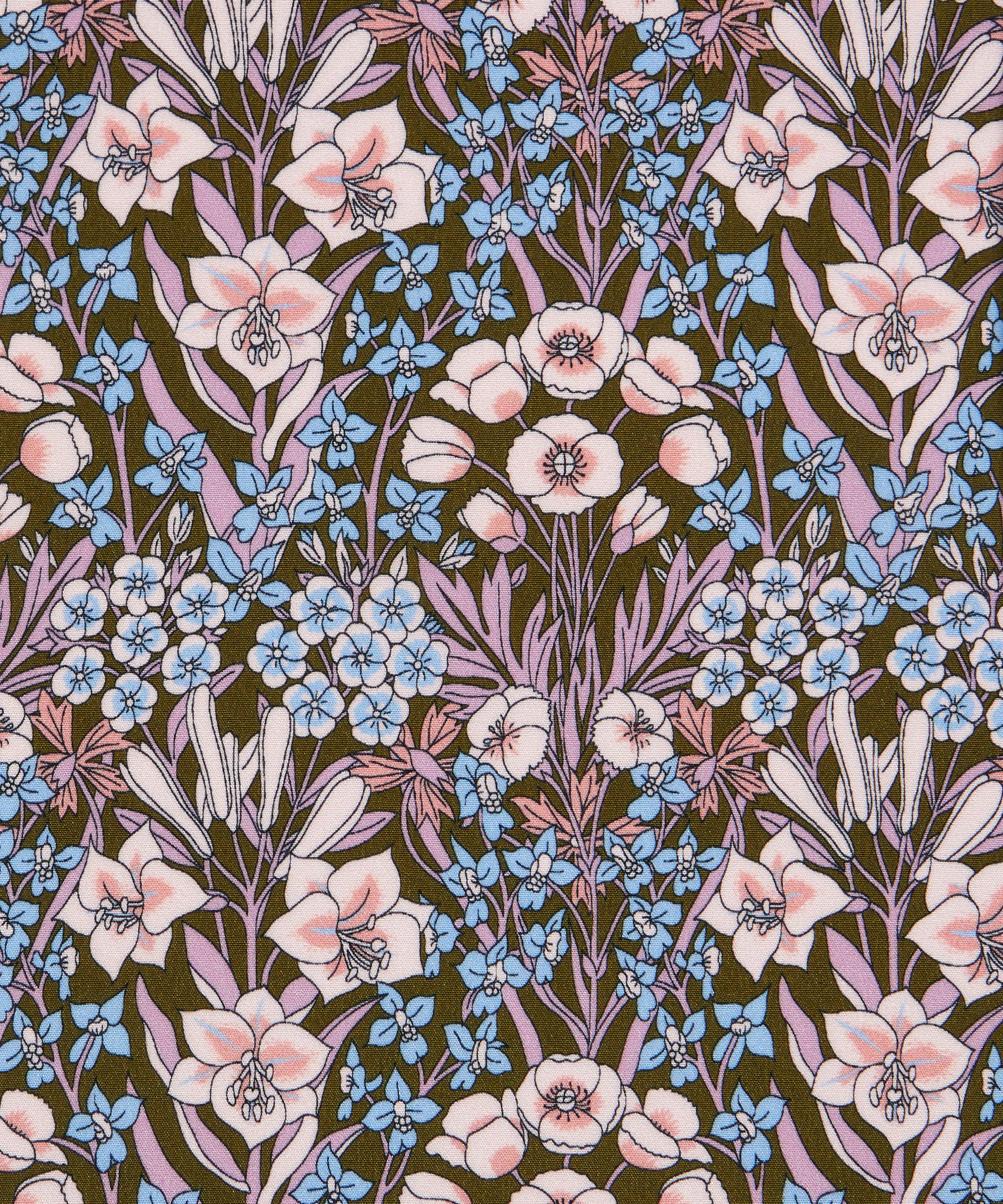 Mountain Primrose is a dense, highly stylised floral print inspired by an archival Liberty design. Drawn in an Art Nouveau style and rotary printed in seven colours, it has an ogee-shaped layout of lilies, anemones and dianthus.