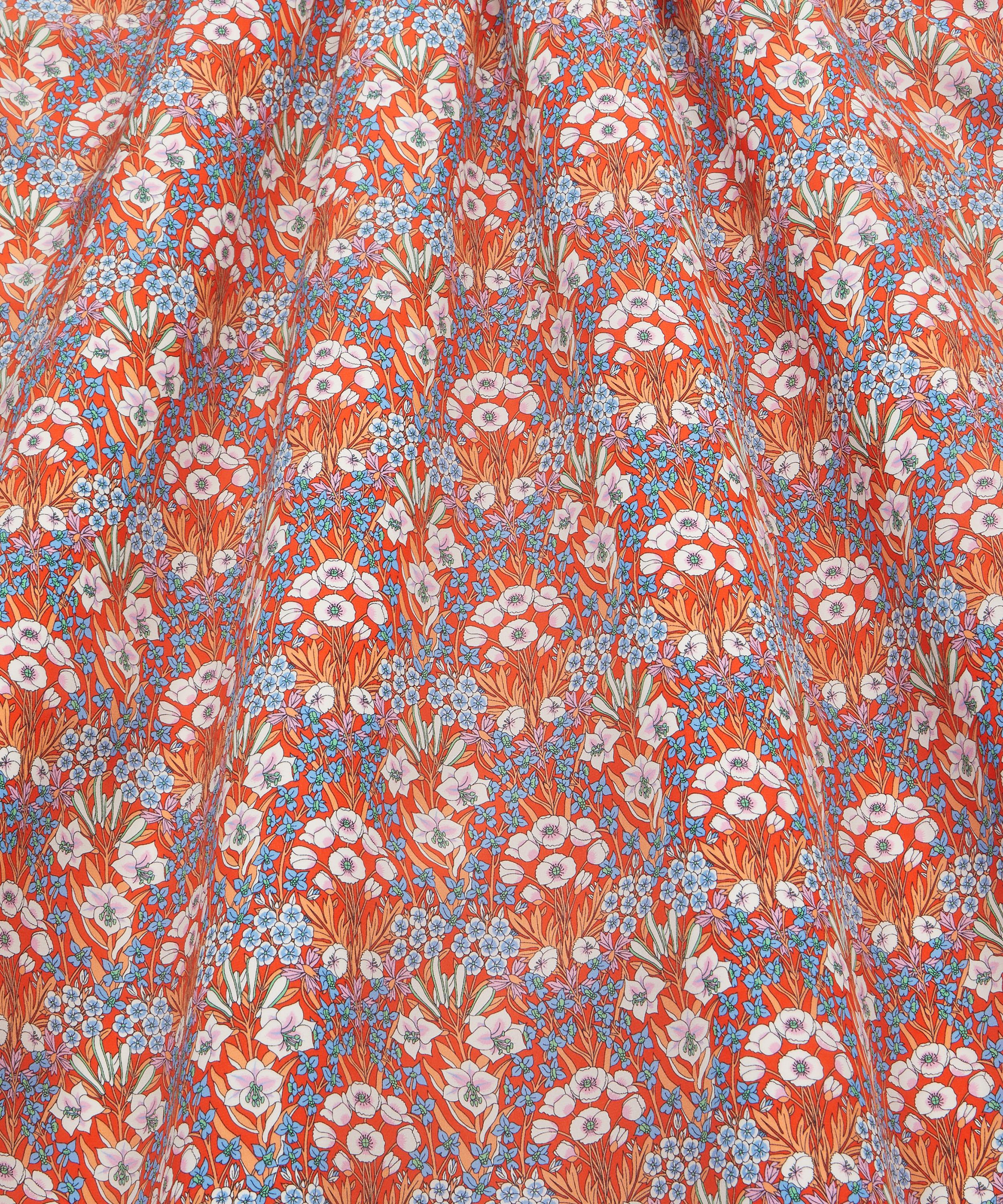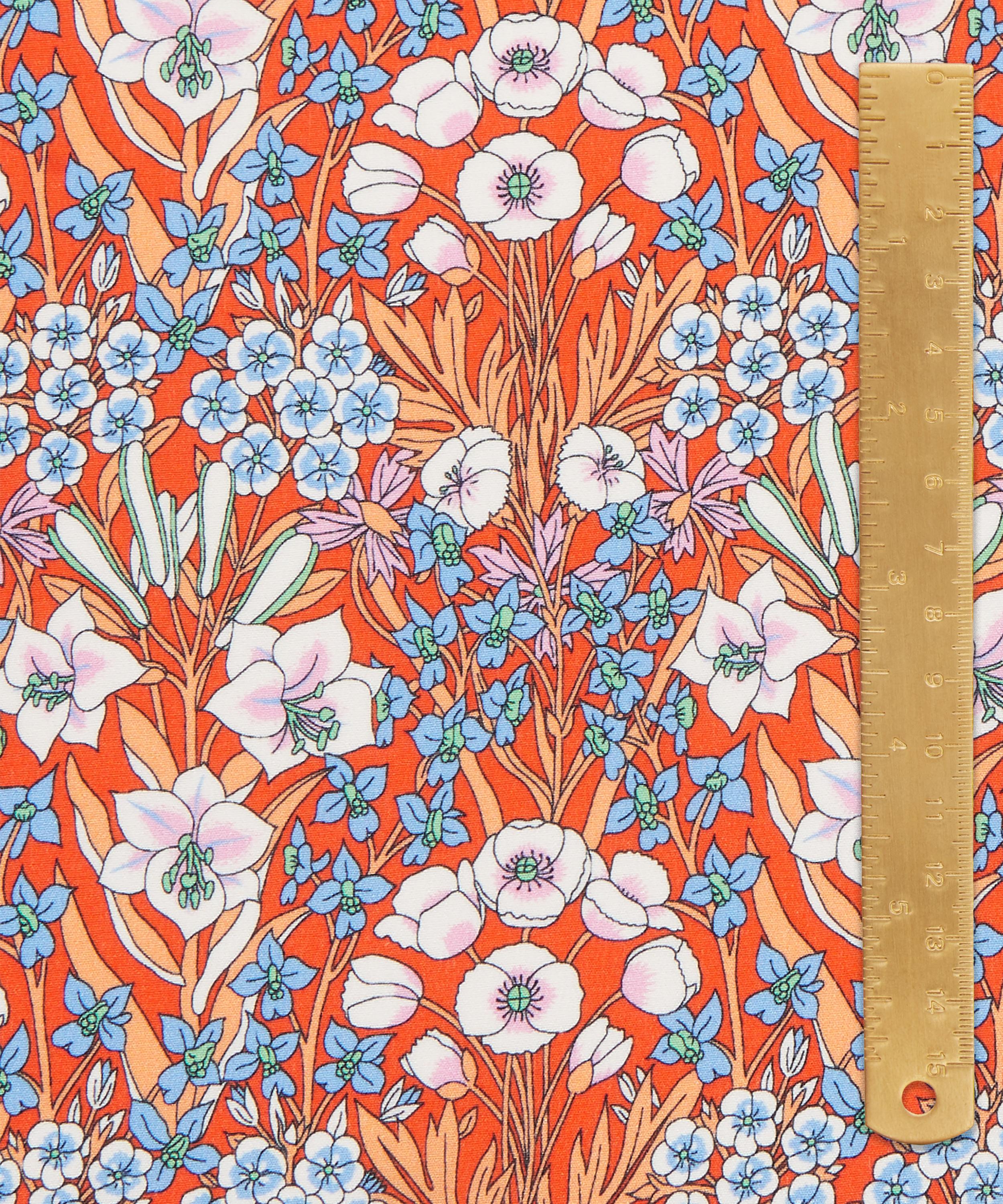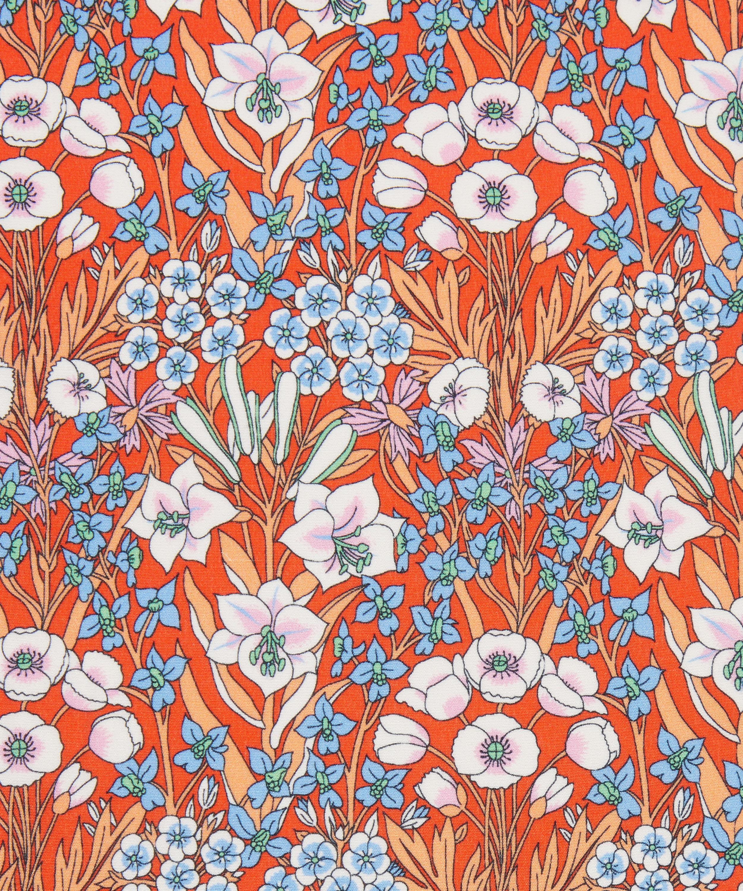 Mountain Primrose is a dense, highly stylised floral print inspired by an archival Liberty design. Drawn in an Art Nouveau style and rotary printed in seven colours, it has an ogee-shaped layout of lilies, anemones and dianthus.