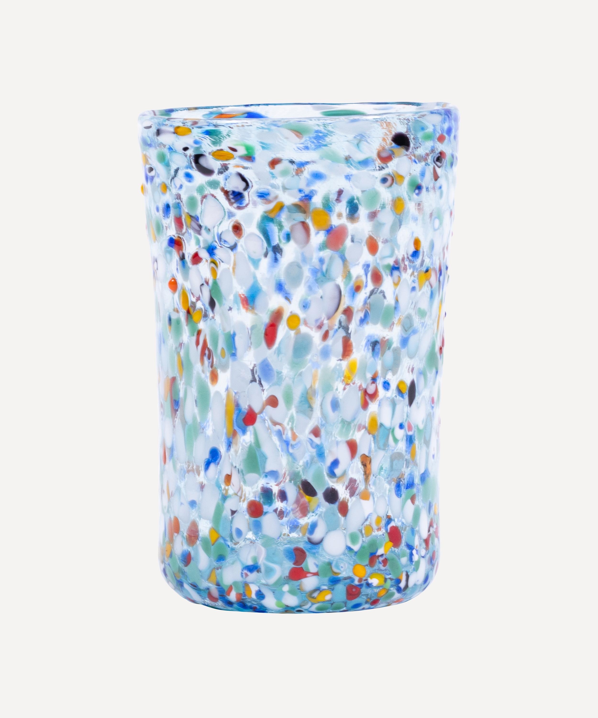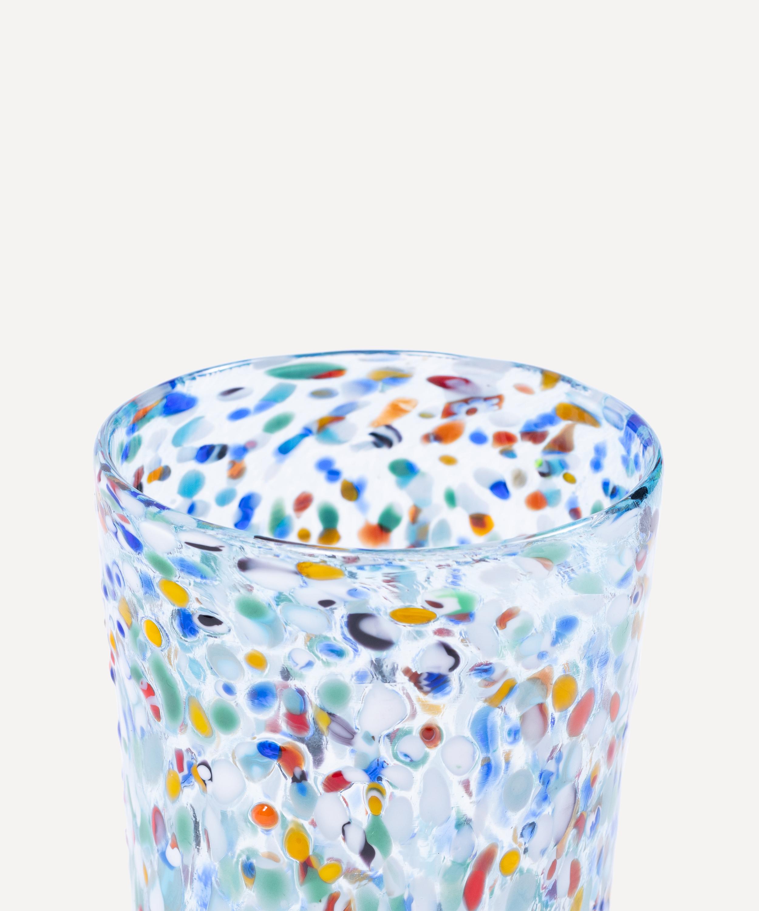 Mouth-blown by master glass blowers in Murano, Italy, this tumbler is shaped by hand and accented with thousands of tiny fragments of murrina glass that produce a unique, textured effect. Use to serve homemade cocktails to visiting guests, or mix and match with your existing glassware for a personal dining curation.
