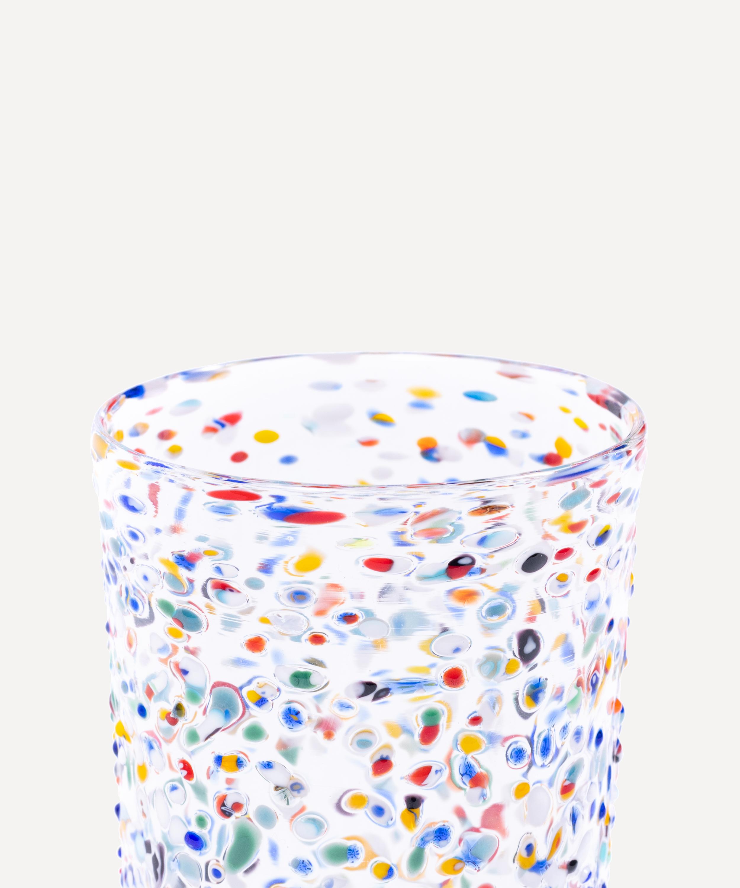 Mouth-blown by master glass blowers in Murano, Italy, this tumbler is shaped by hand and accented with thousands of tiny fragments of murrina glass that produce a unique, textured effect. Use to serve homemade cocktails to visiting guests, or mix and match with your existing glassware for a personal dining curation.