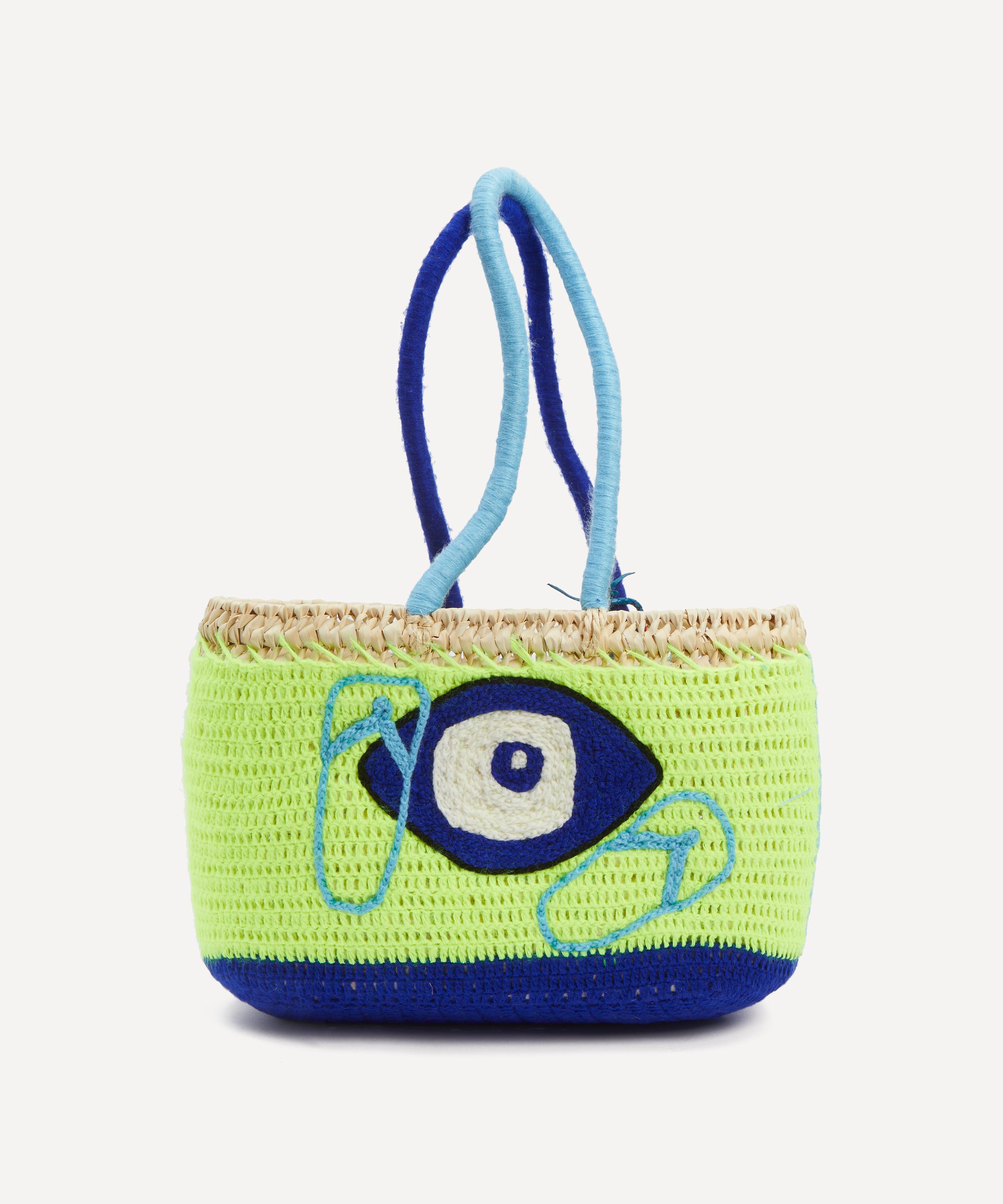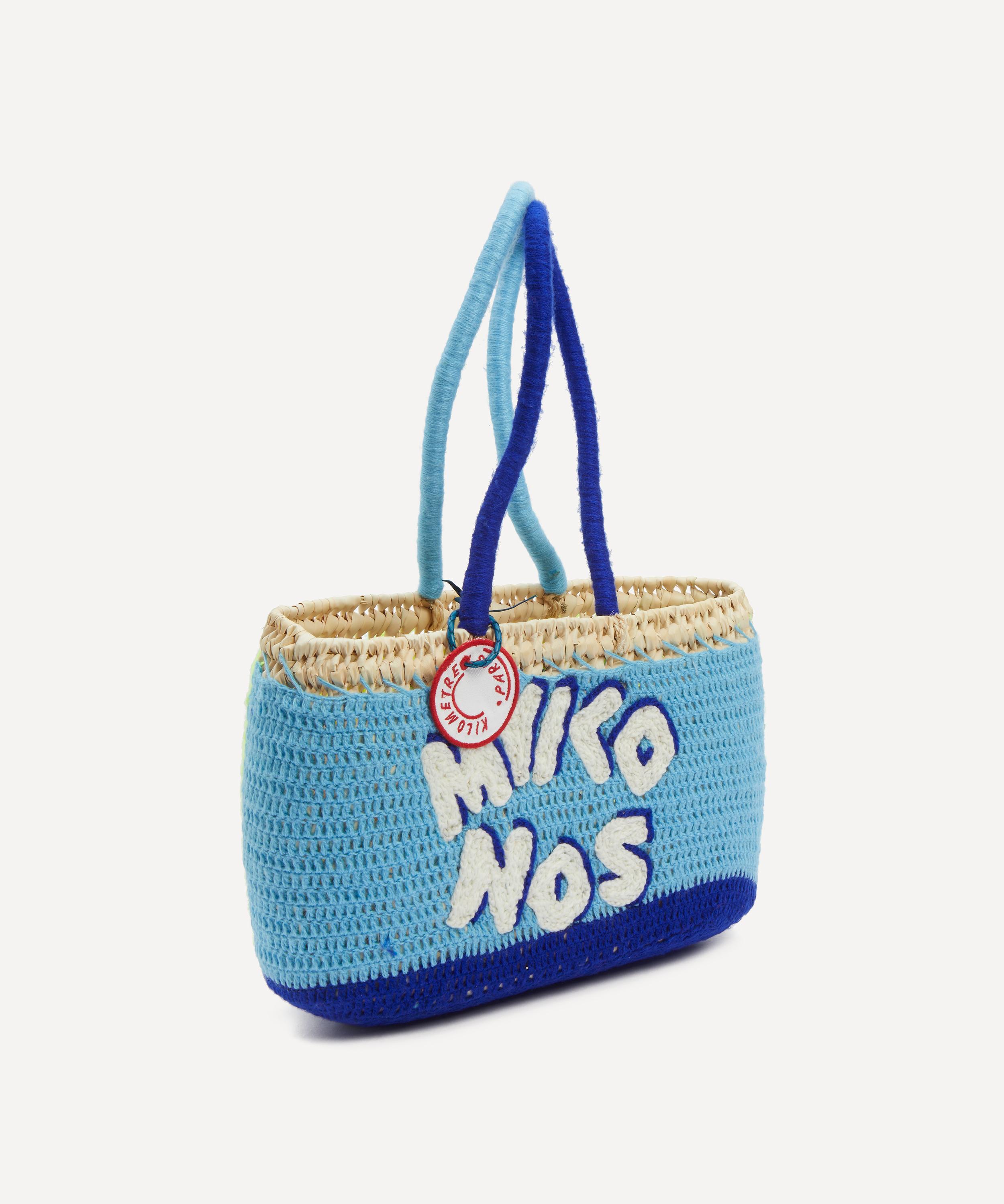 Made using time-honoured, traditional techniques cherished in Moroccan artisanship, this meticulously hand-woven palm straw bag features a colourful design, with 'Mykonos' text at the front, an eye motif at the back, and two long top handles – ideal for enhancing your everyday look on trips to the market, city strolls, or balmy beach days.