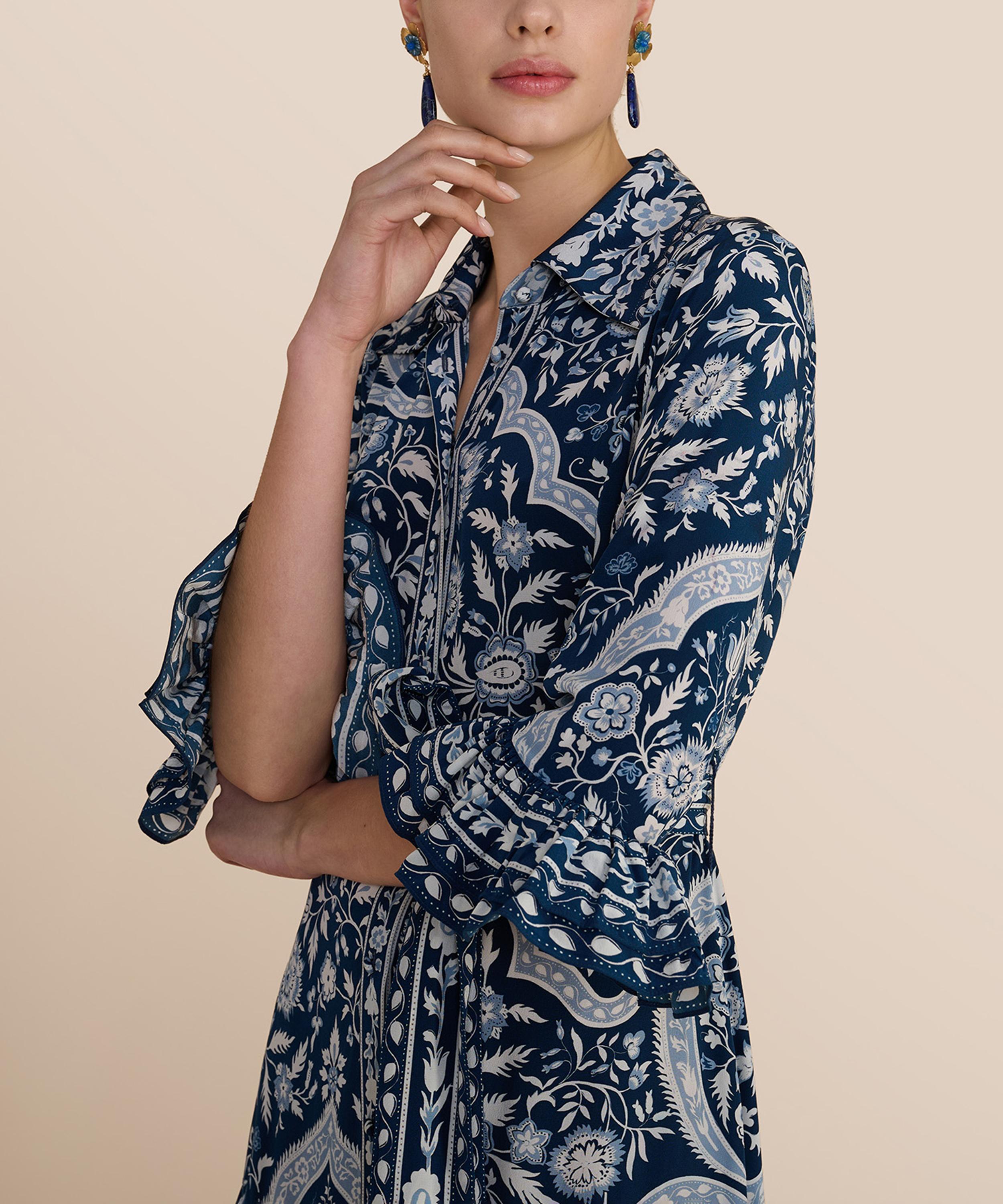 A signature silhouette, the Nalini Dress is reimagined this season in an elegant Jaipur tile print. Crafted from pure silk crepe de chine, it features a classic collar, tie-waist detailing, and cropped, soft ruffle sleeves - finished with thoughtfully placed print for a refined, occasion-ready look.