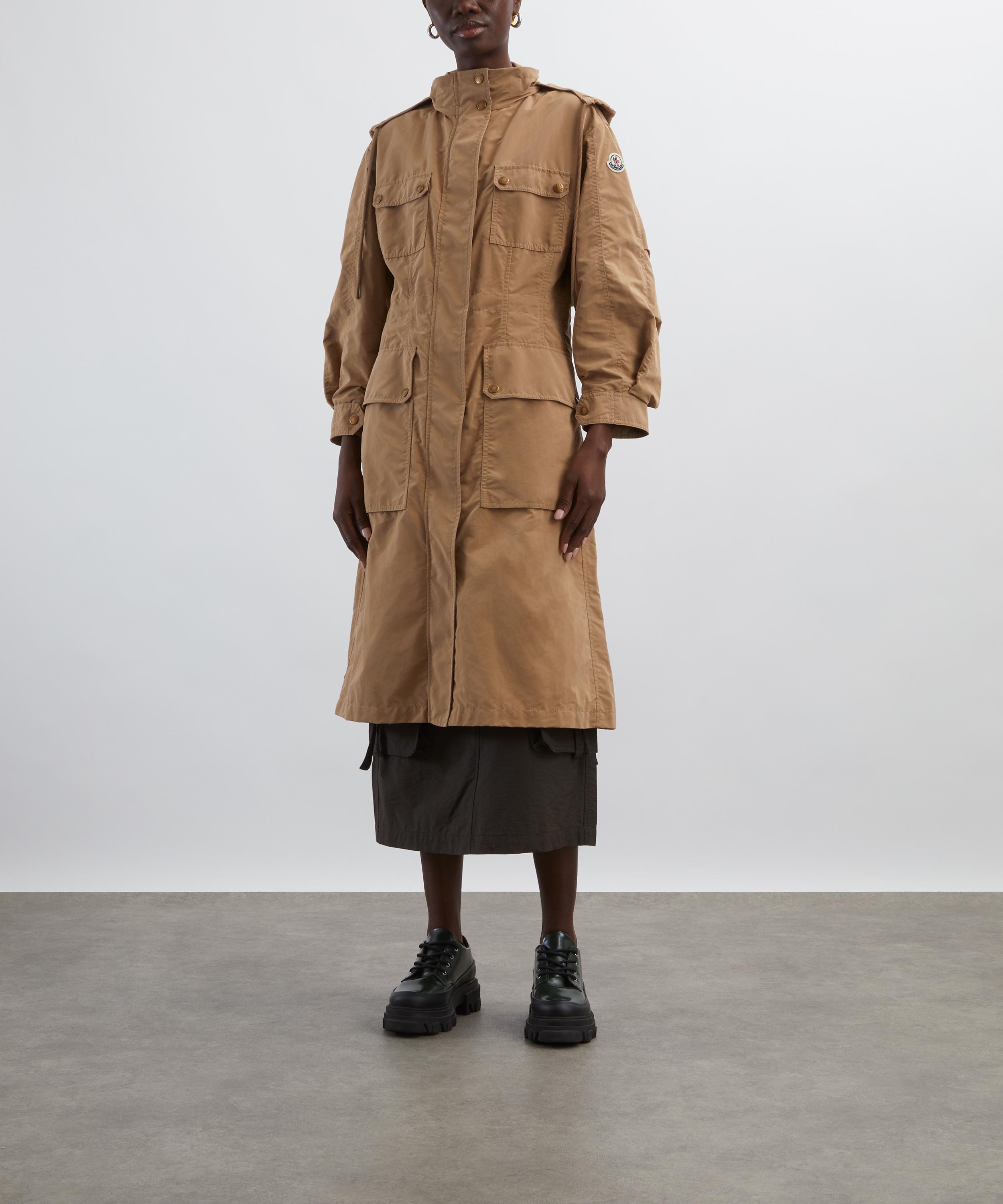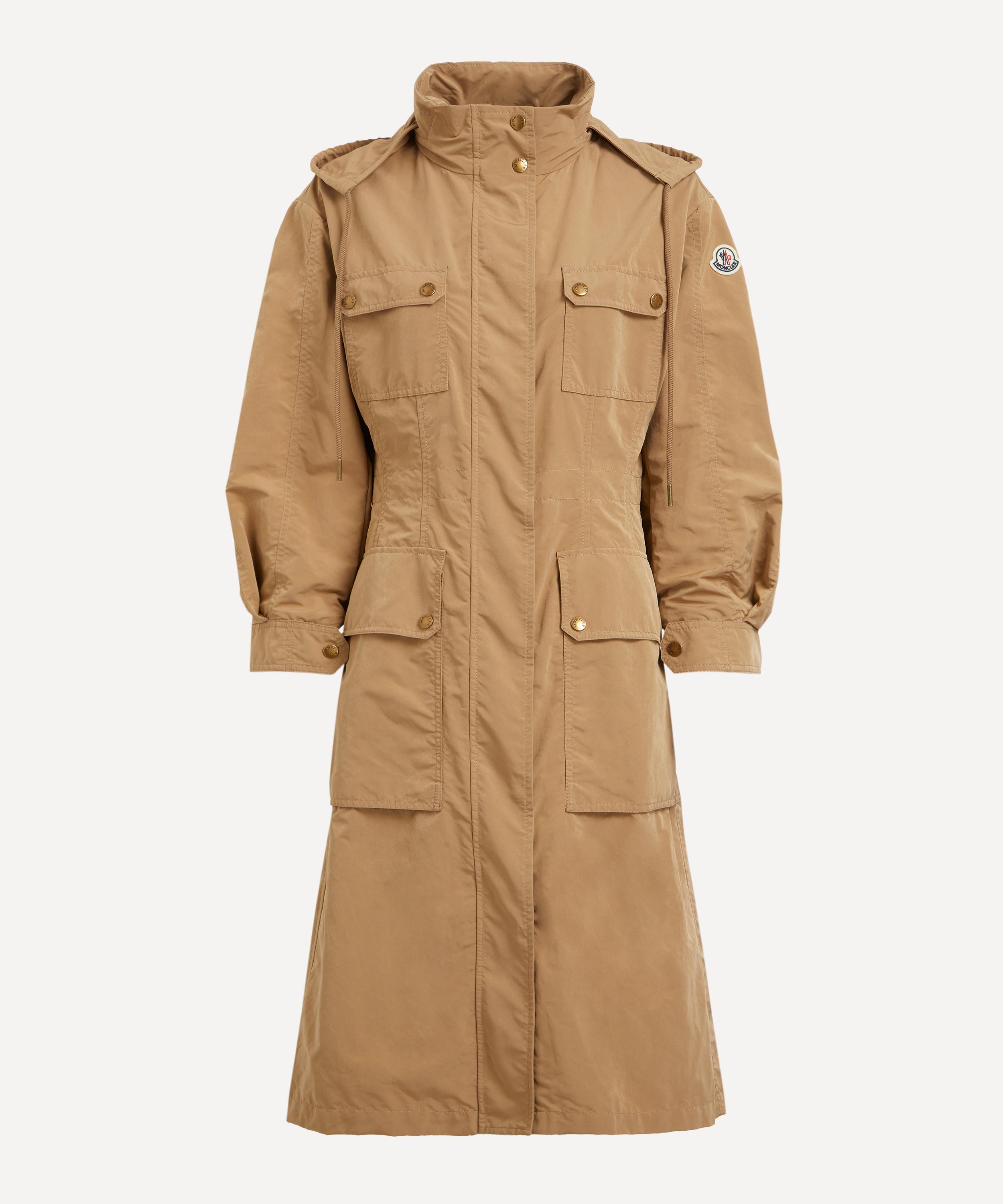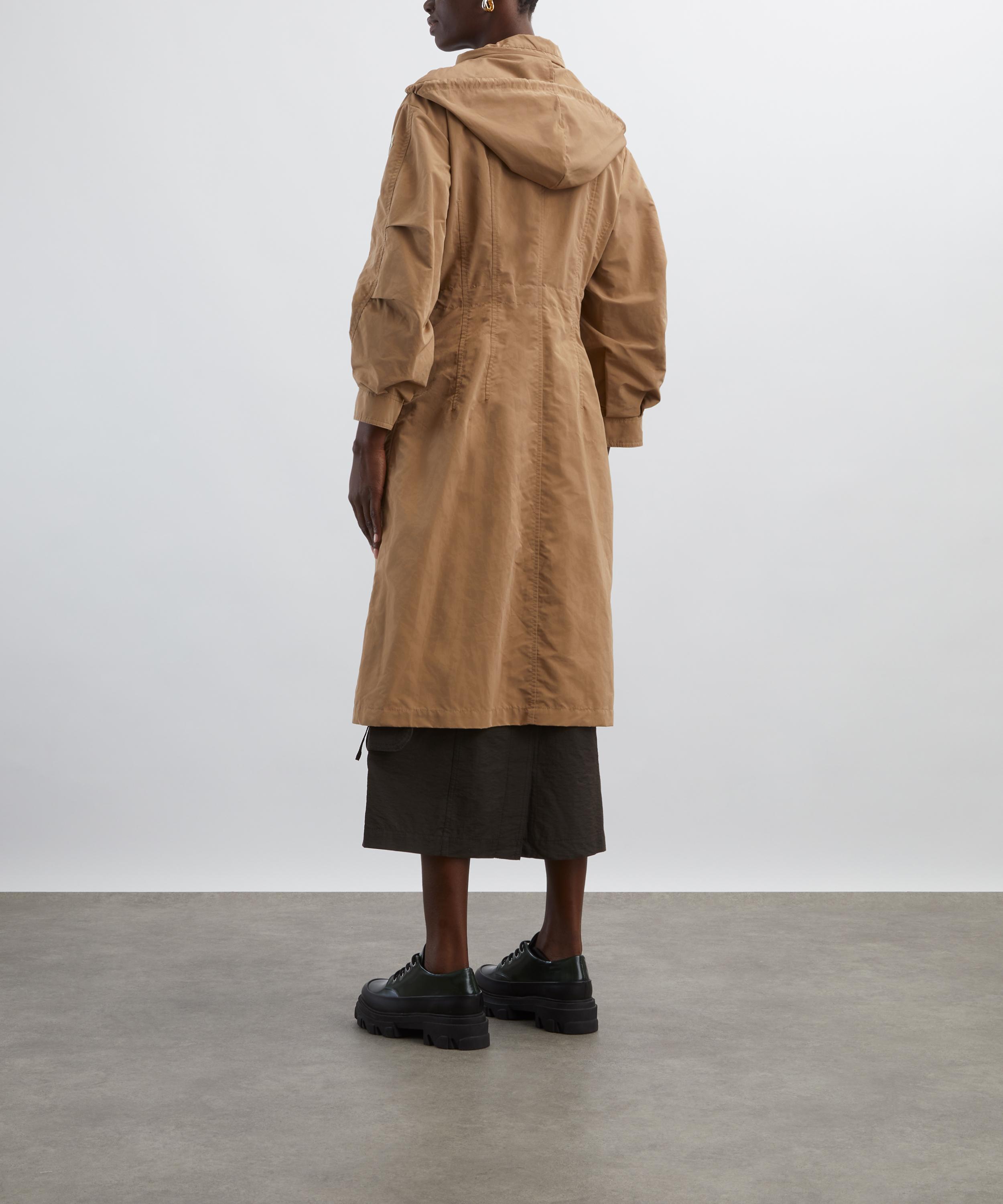 Designed for a transitional wardrobe, this long coat is crafted from a durable nylon blend with a nod to the utilitarian field jacket. Spacious patch pockets add functional detail, while a concealed pull-out hood and adjustable waistline provide extra warmth and protection against the elements.