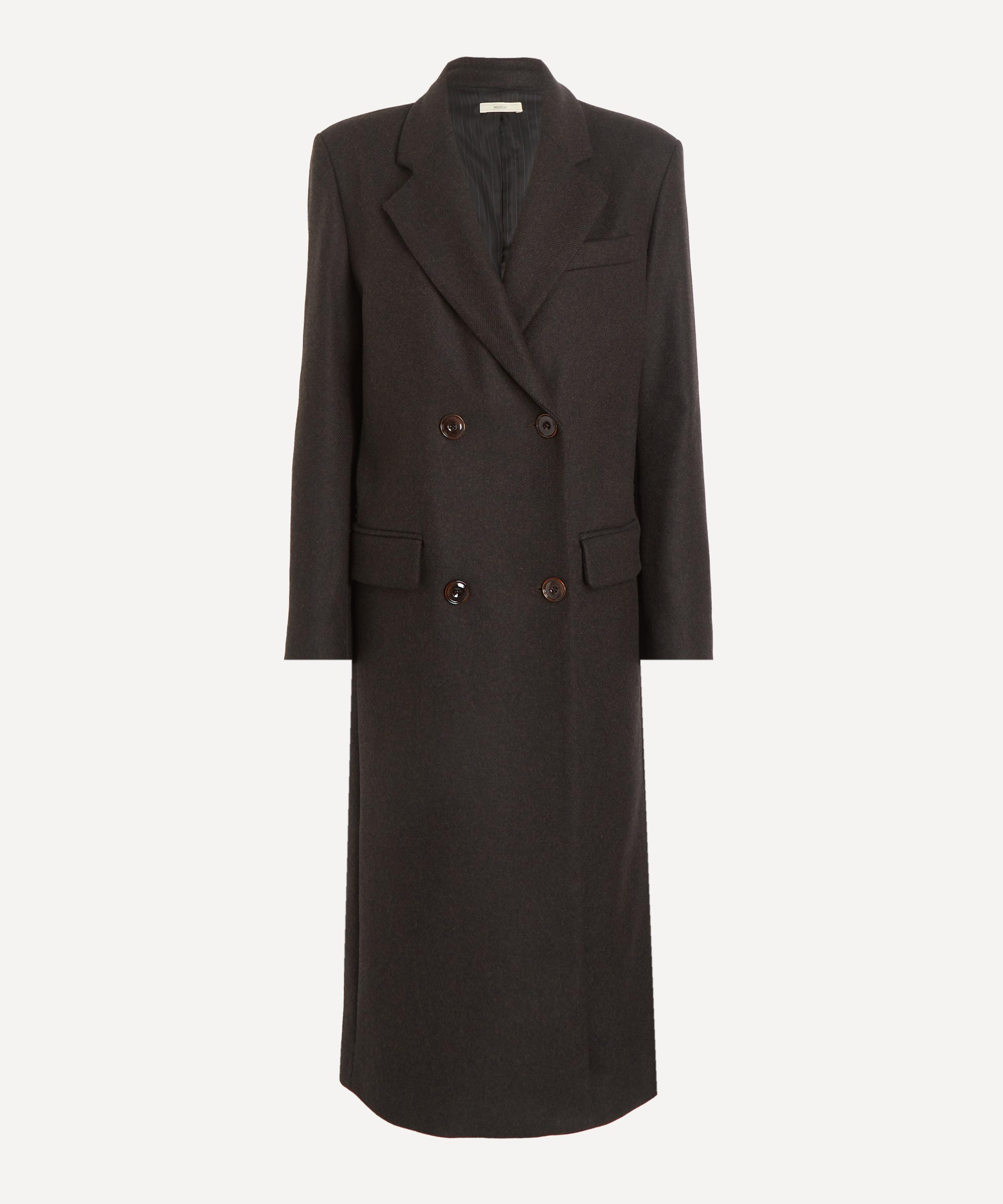 Tailored from a premium wool blend, this long coat features a straight, double-breasted silhouette with structured shoulders. Effortlessly refined, its tailored collar, button fastening, and welt flap pockets lend a timeless sophistication to any ensemble.