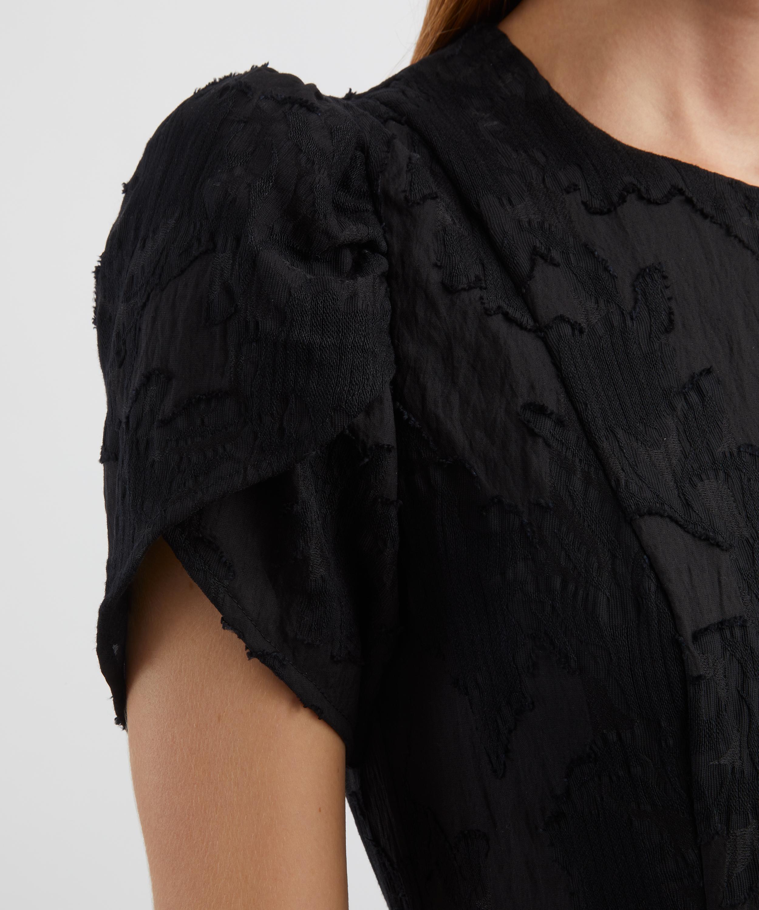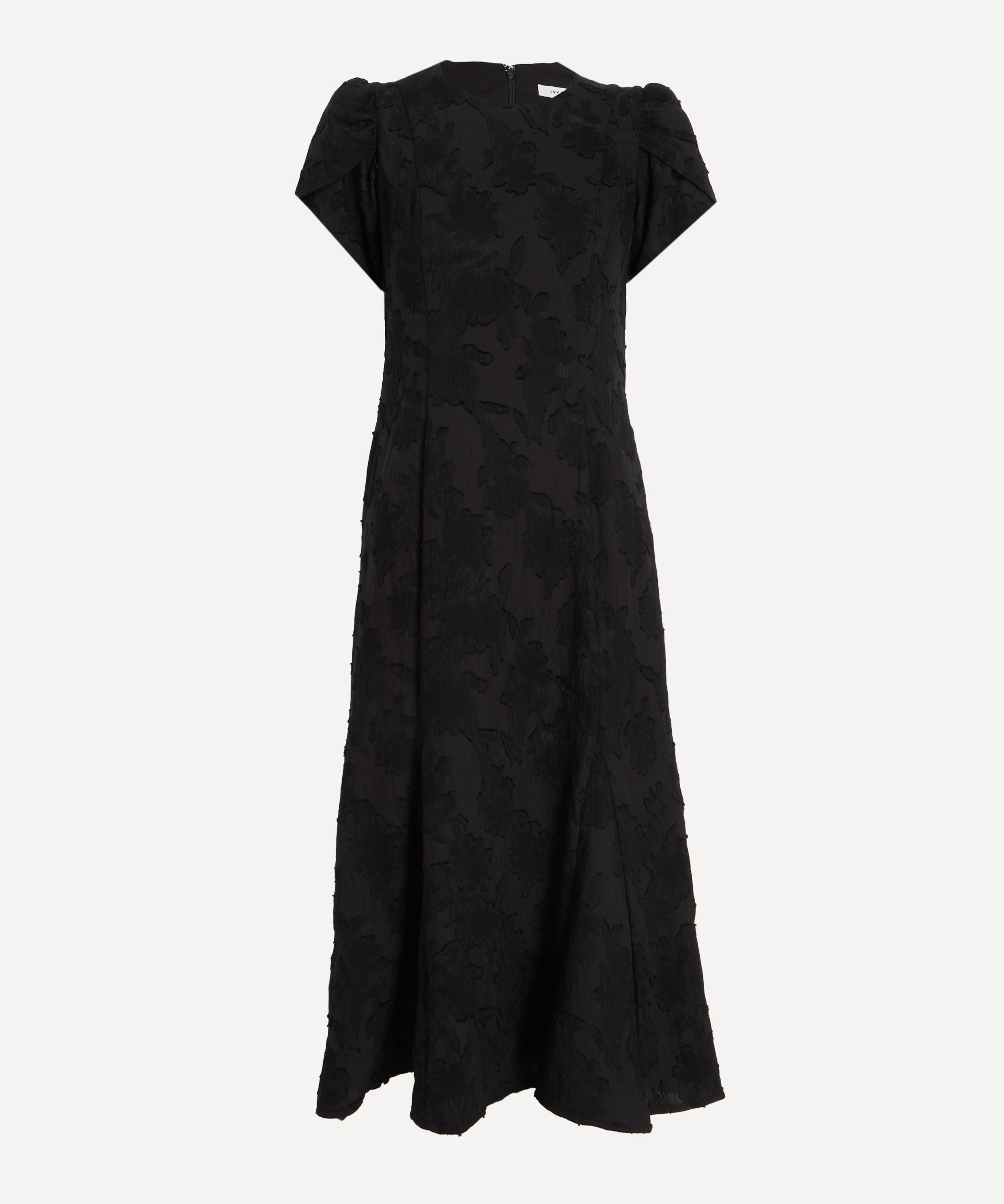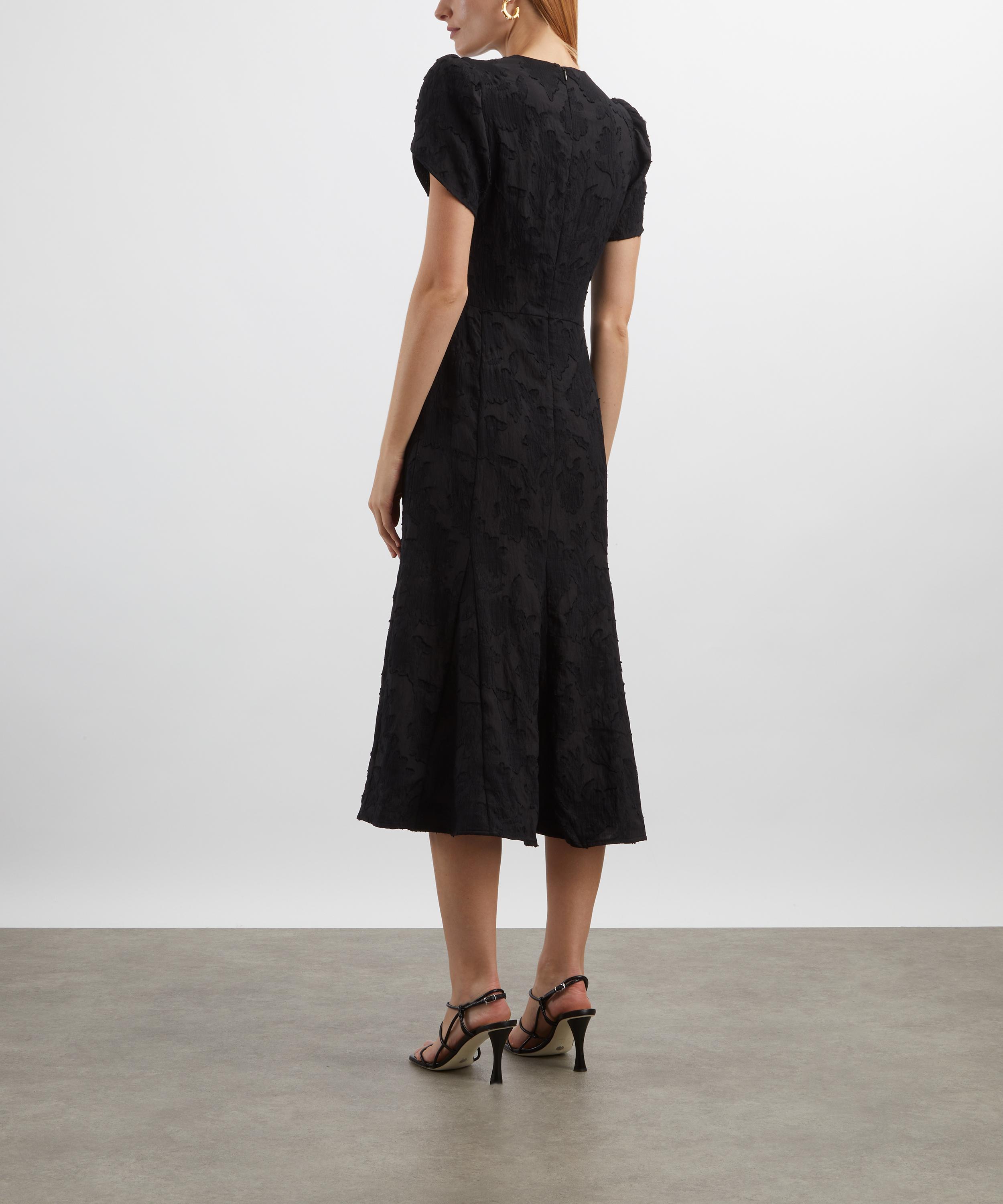 Crafted from fil coupé woven with tactile floral motifs, this midi dress showcases a flattering A-line silhouette with a fitted bodice, delicate flower-shaped short sleeves, and a softly flared hem for graceful movement.