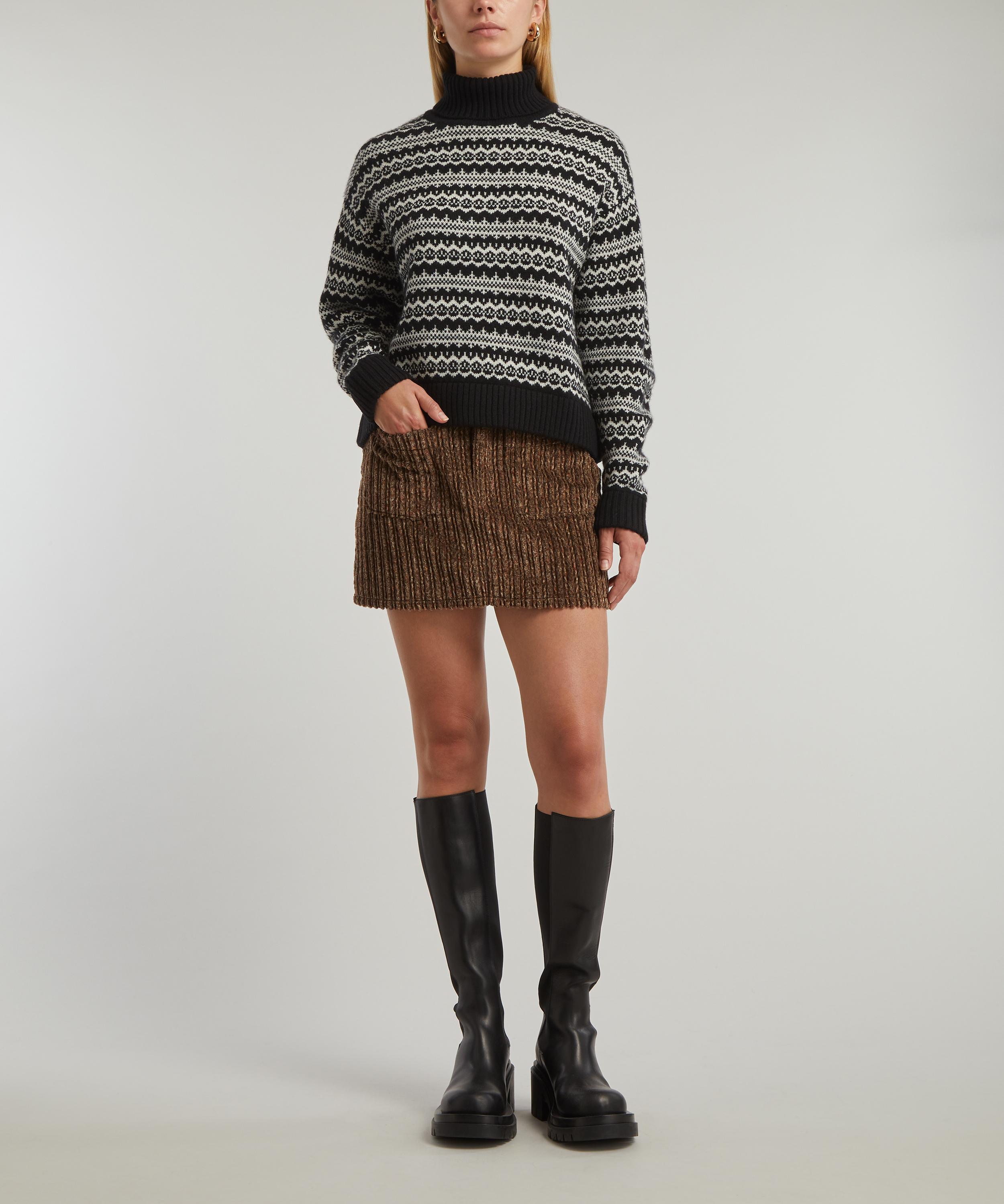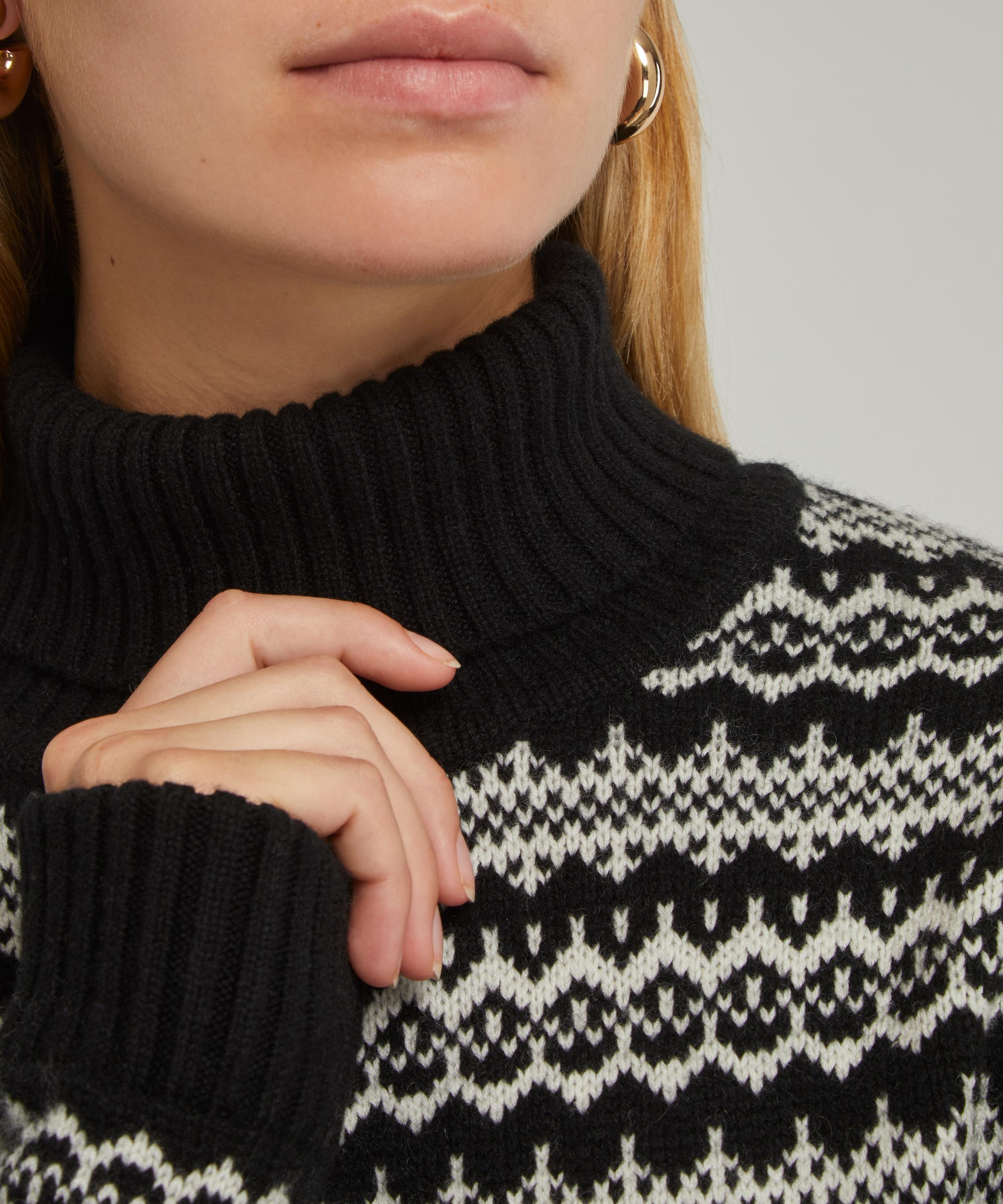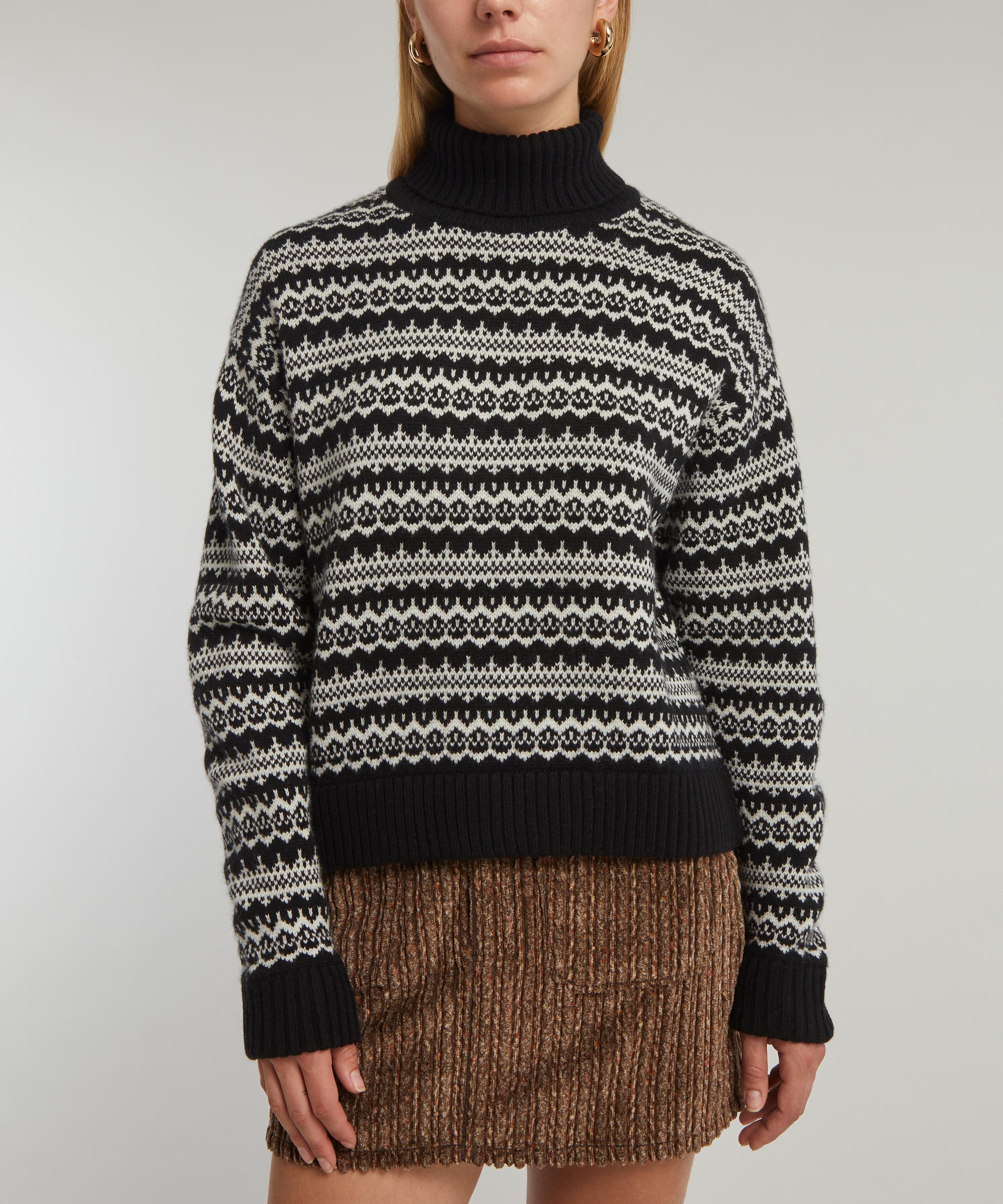 Update your new season knitwear edit with the Navajo roll-neck jumper from Jumper 1234. Crafted from a sumptuously soft wool and cashmere blend, this monochrome Fair Isle knitted pull-over jumper is cut to an oversized fit with dropped shoulders and long slouchy sleeves, complete with contrasting black ribbed trims across its collar, cuffs and hem.