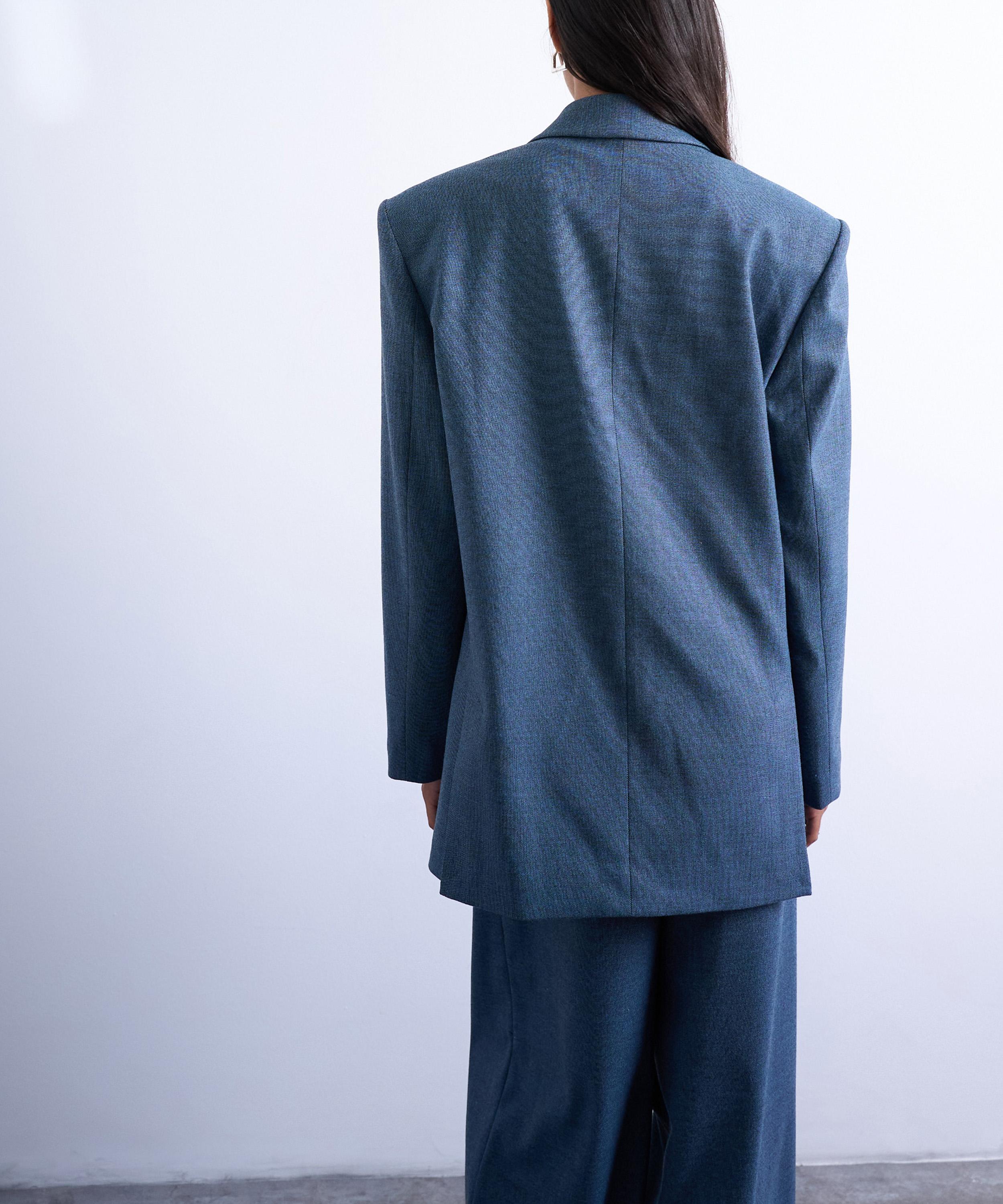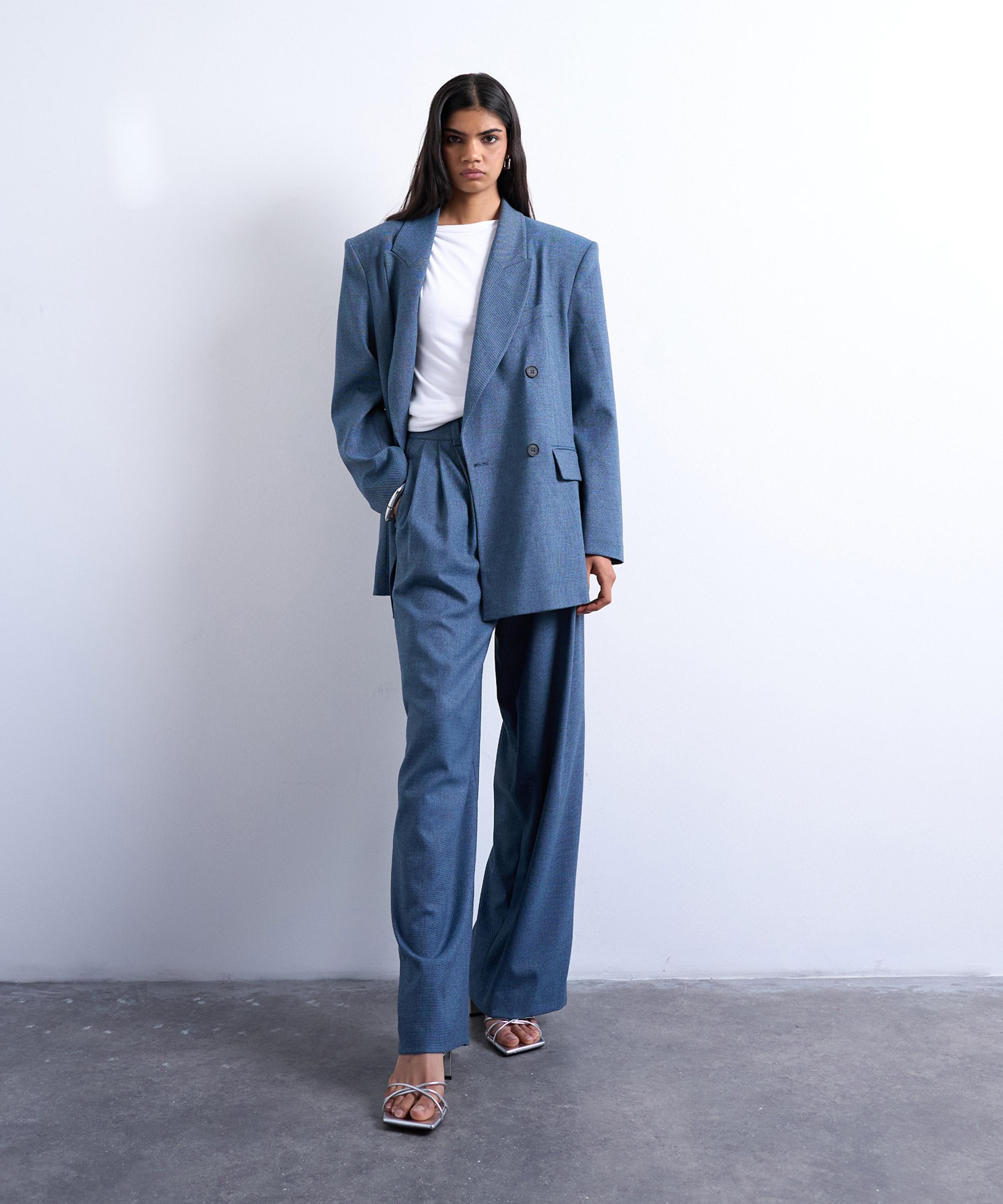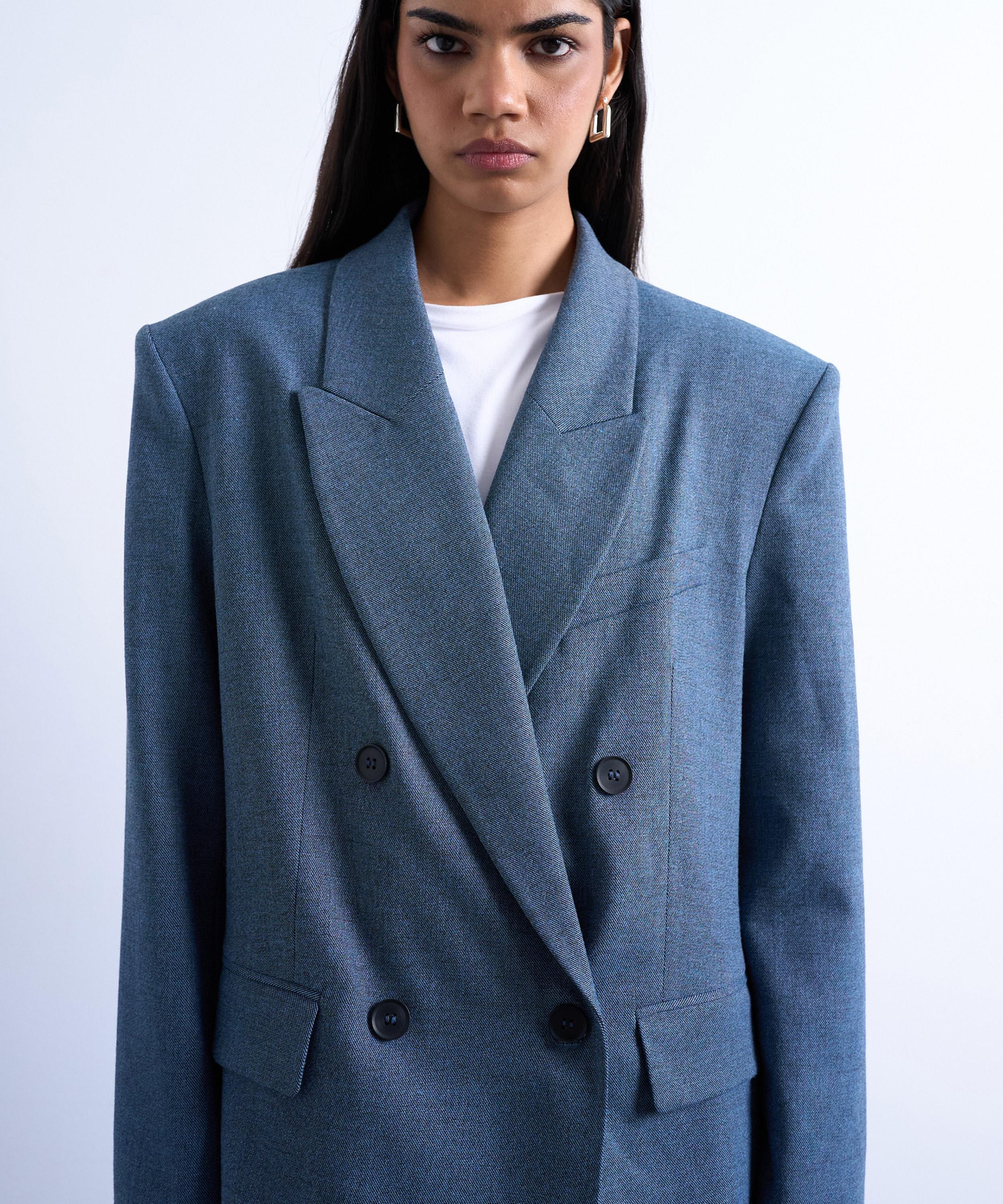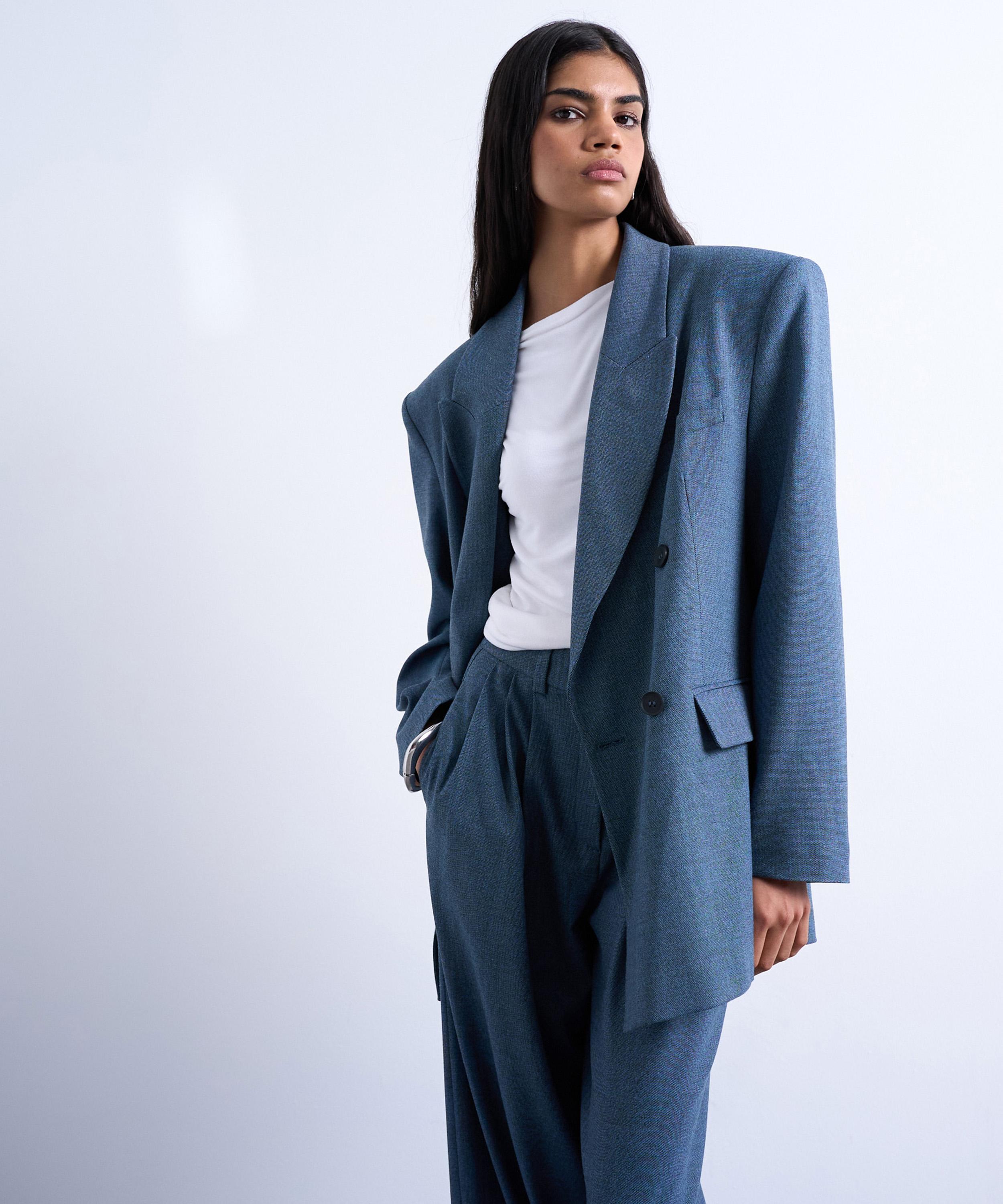 Crafted from textured woven fabric, this blazer channels ‘80s-inspired style with its oversized, double-breasted silhouette, featuring boxy padded shoulders and sharp peak lapels for a bold, tailored look.