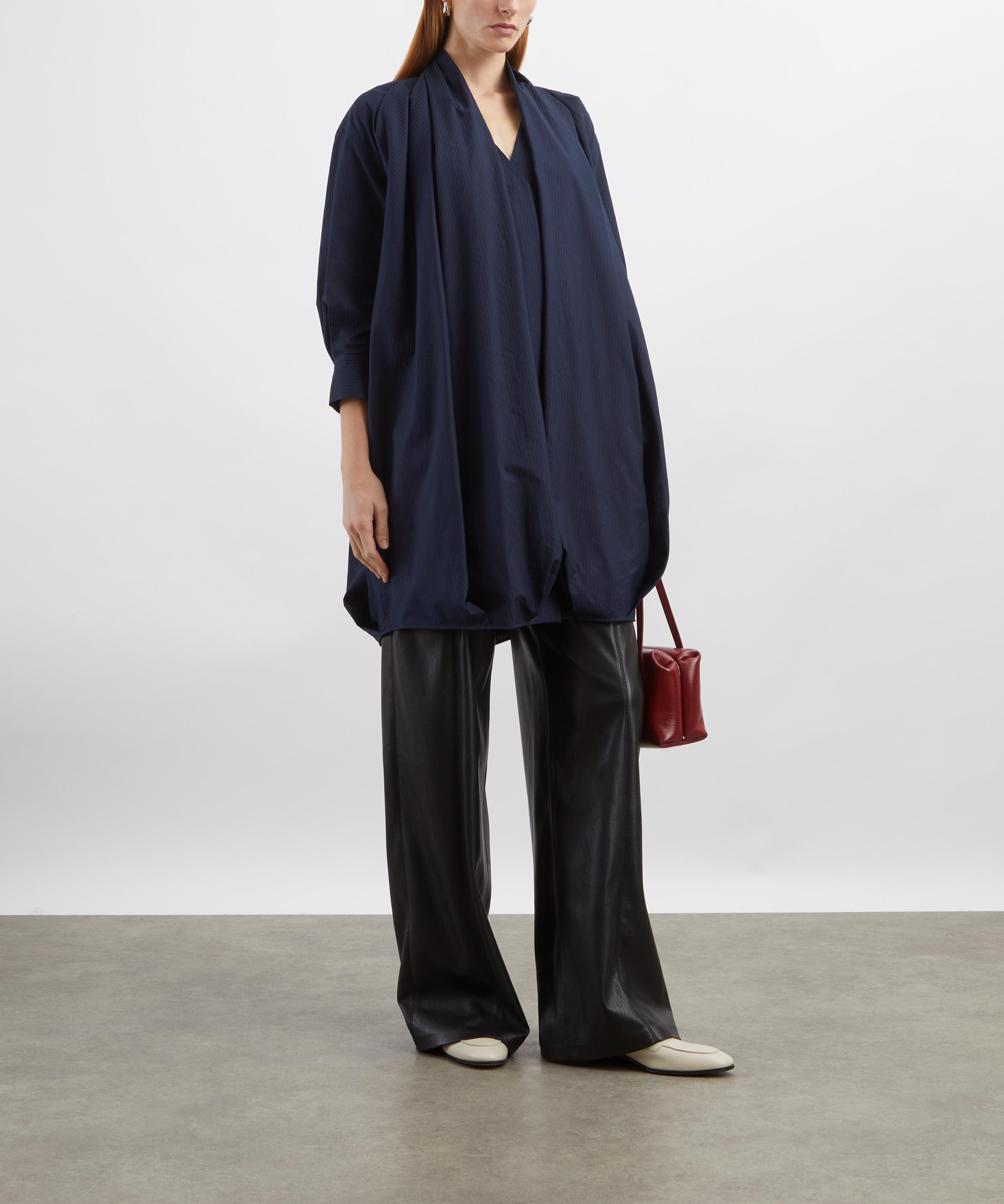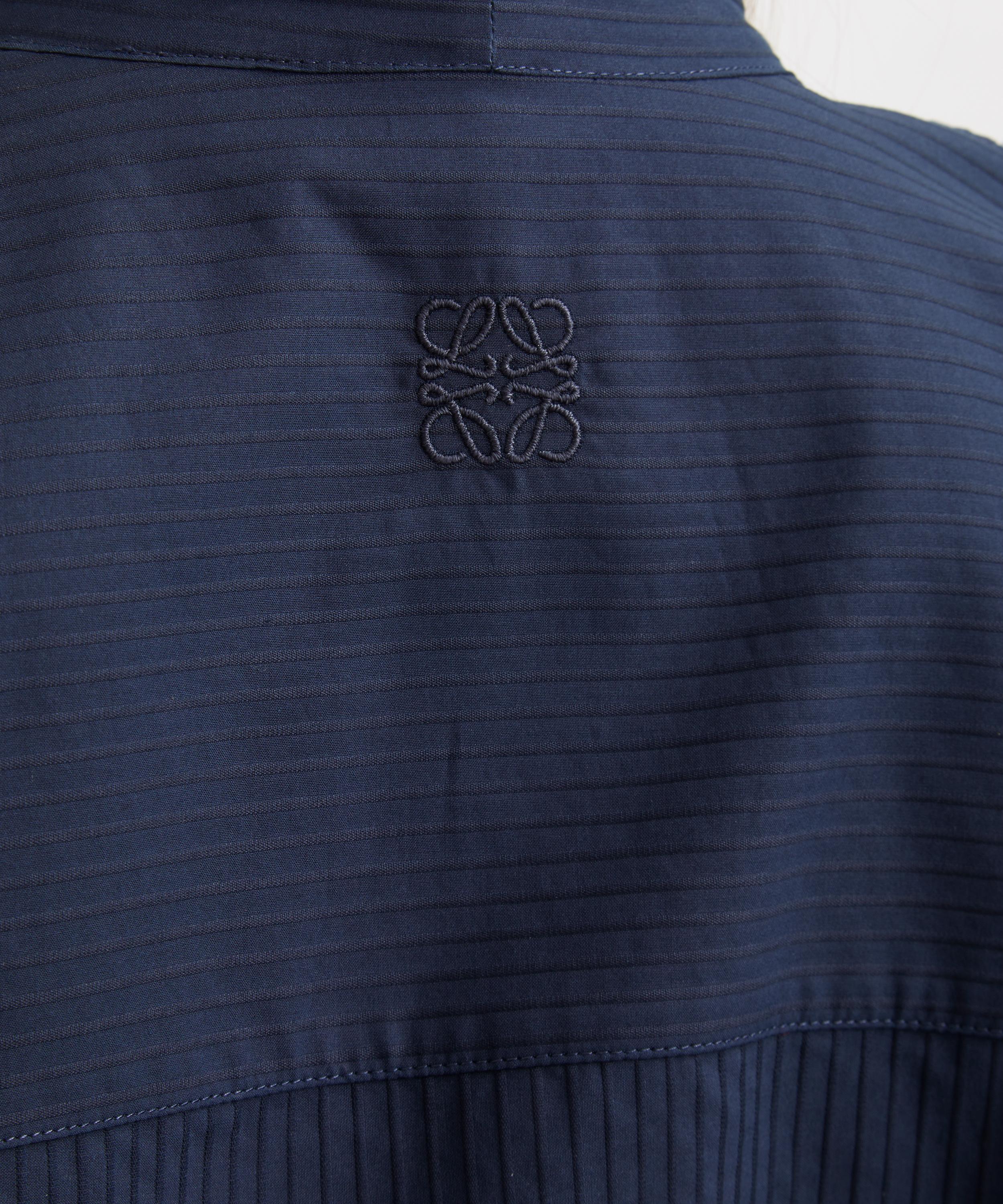 Tailored from crisp cotton poplin, this navy dress captures LOEWE’s modern approach to volume and form. The plunging V-neckline and concealed button placket balance structure with softness, while front draping adds depth and dimension to the balloon silhouette.