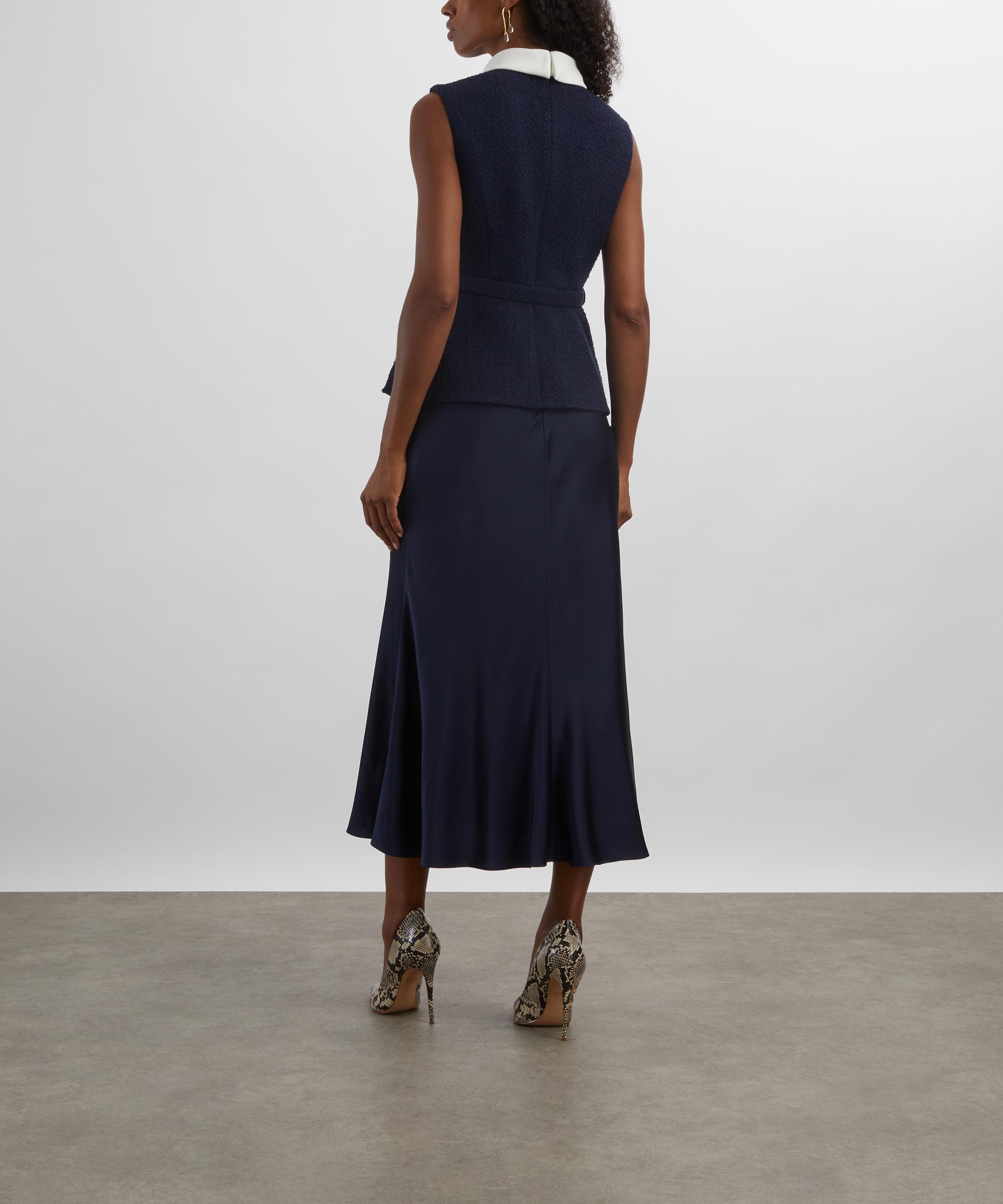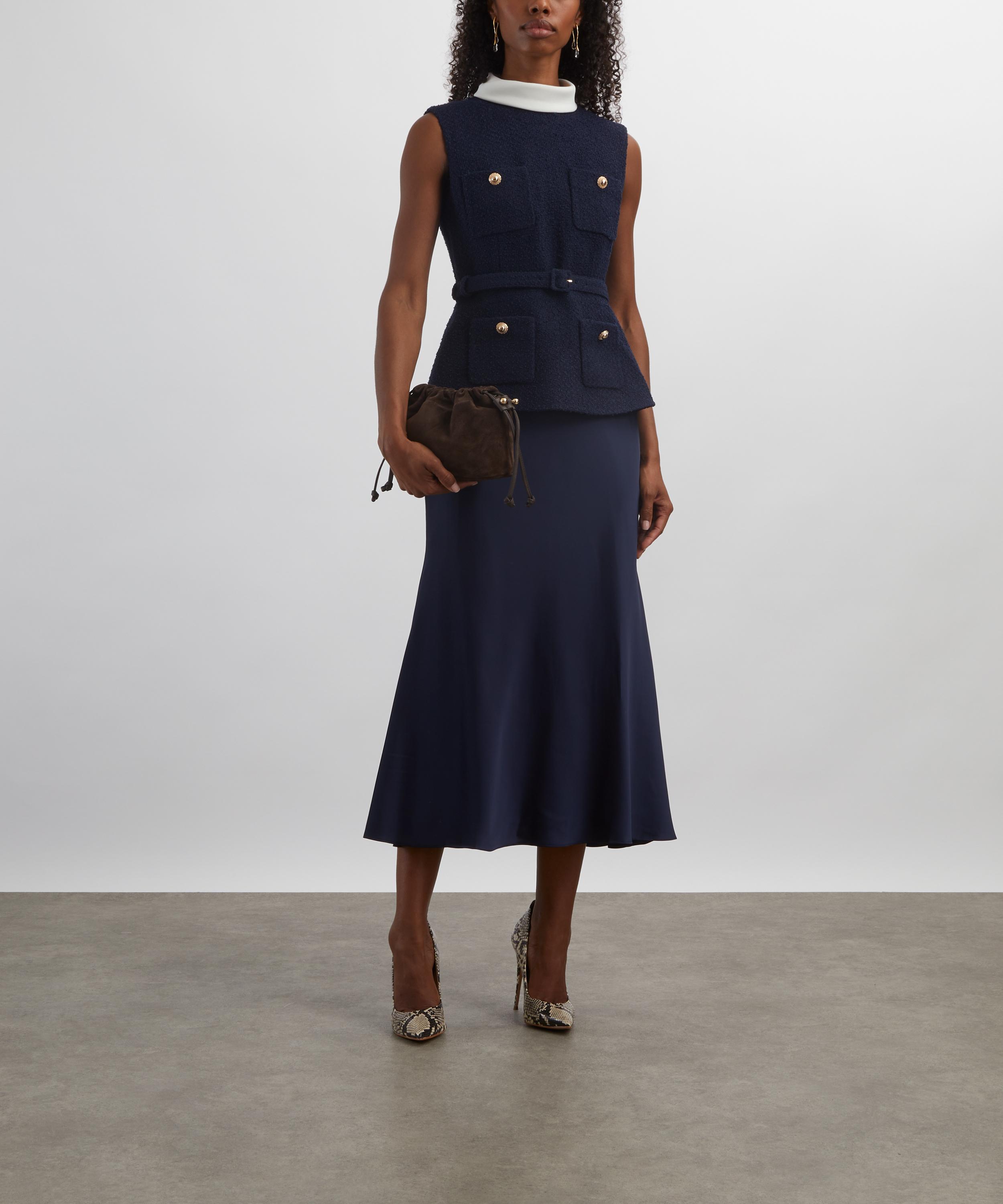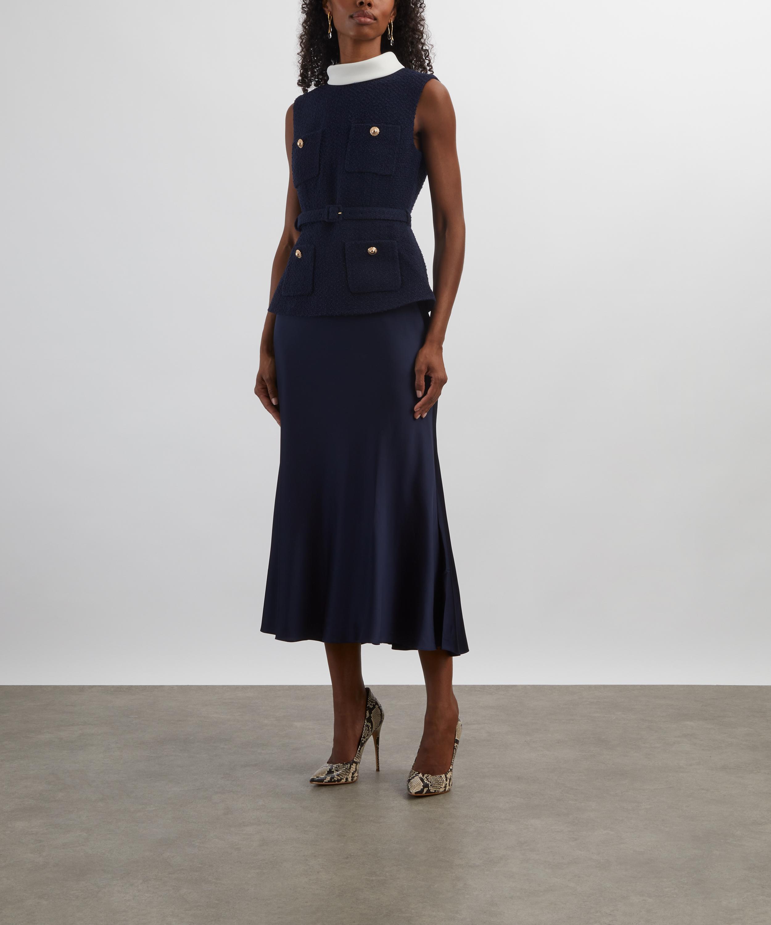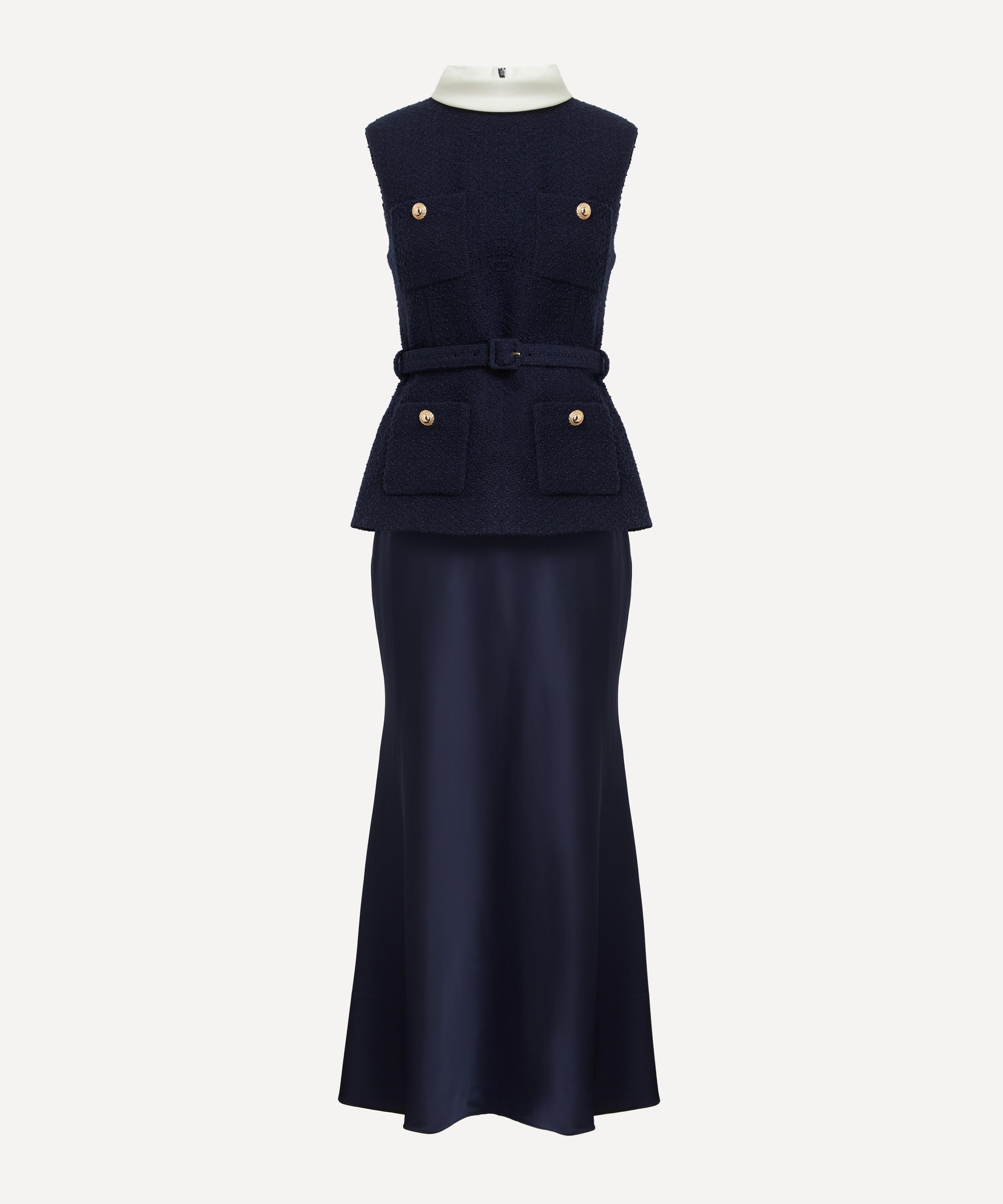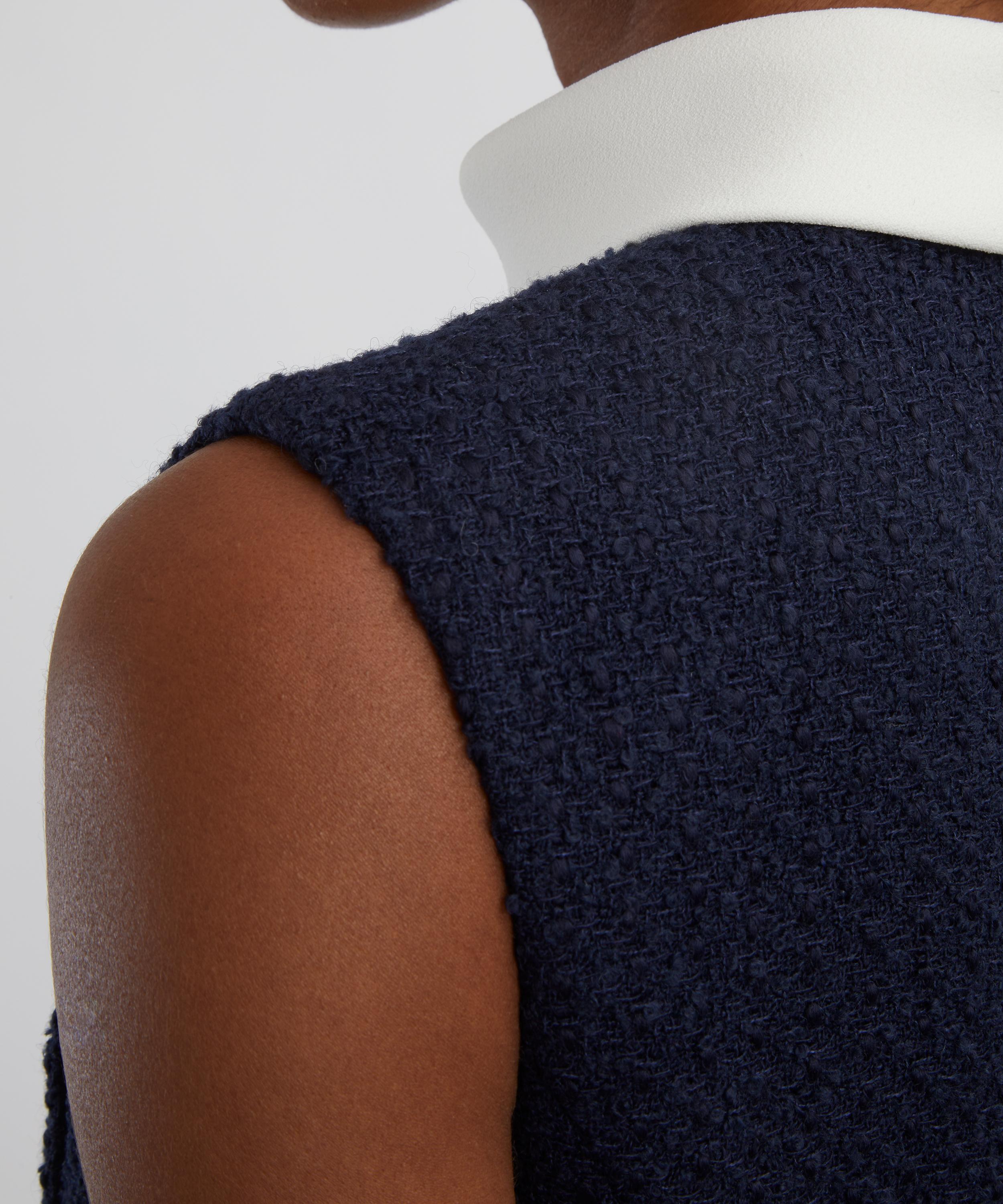 Structured navy bouclé and shiny satin meet to perfection in this tailored midi dress. Offering a sleeveless and fitted silhouette, the high-neckline, belted waist and gold buttons add a refined, lady-like polish to the piece.