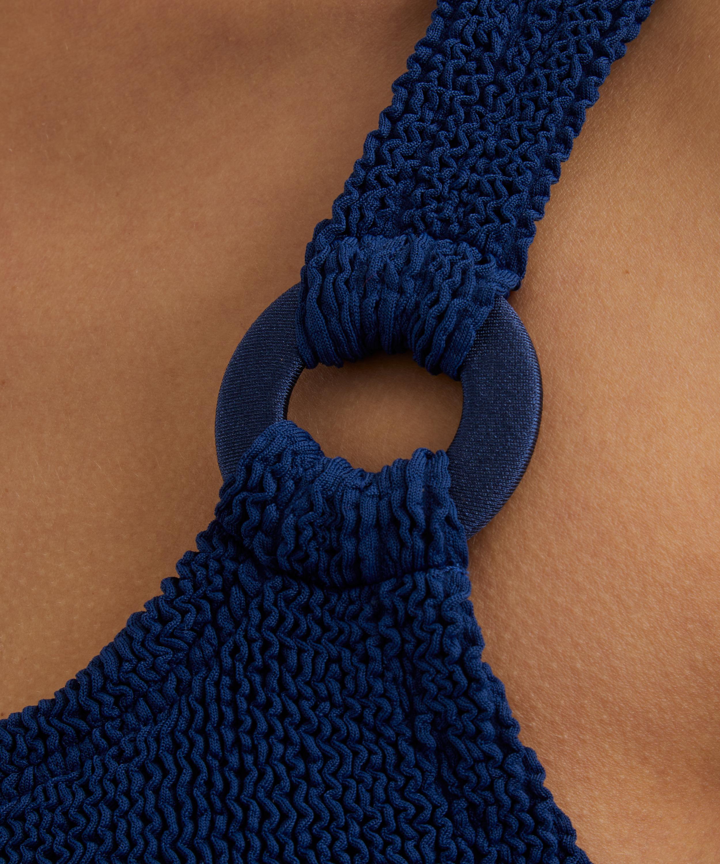 Crafted from the label’s signature crinkle material for a comfortable, flattering fit every time, this iconic swimsuit exudes timeless appeal with its dipped neck, scooped back and tonal hoop detailing.