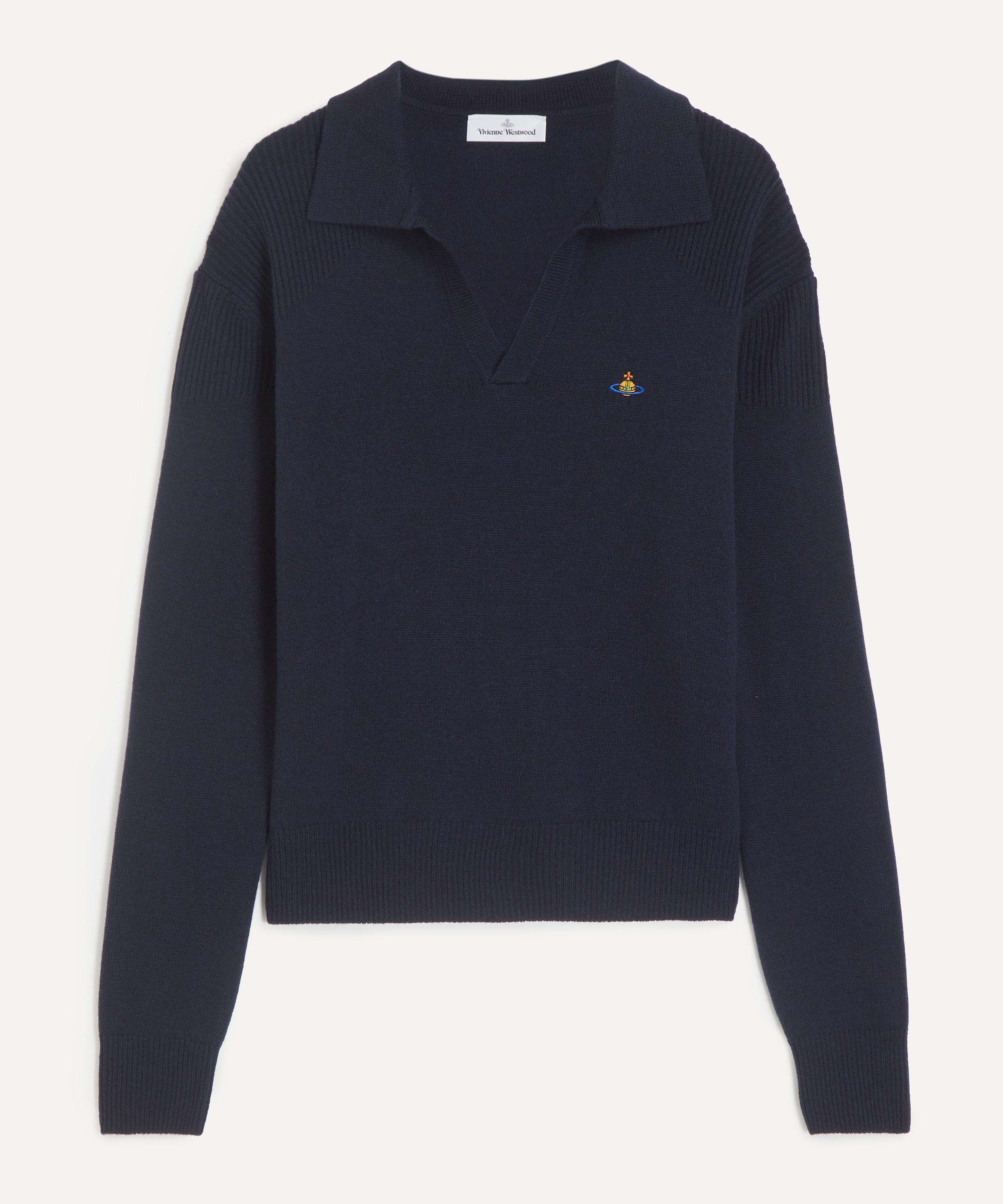 The Navy Football Polo from Vivienne Westwood is a signature, punk-inspired piece that exudes provocative attitude and bold design.