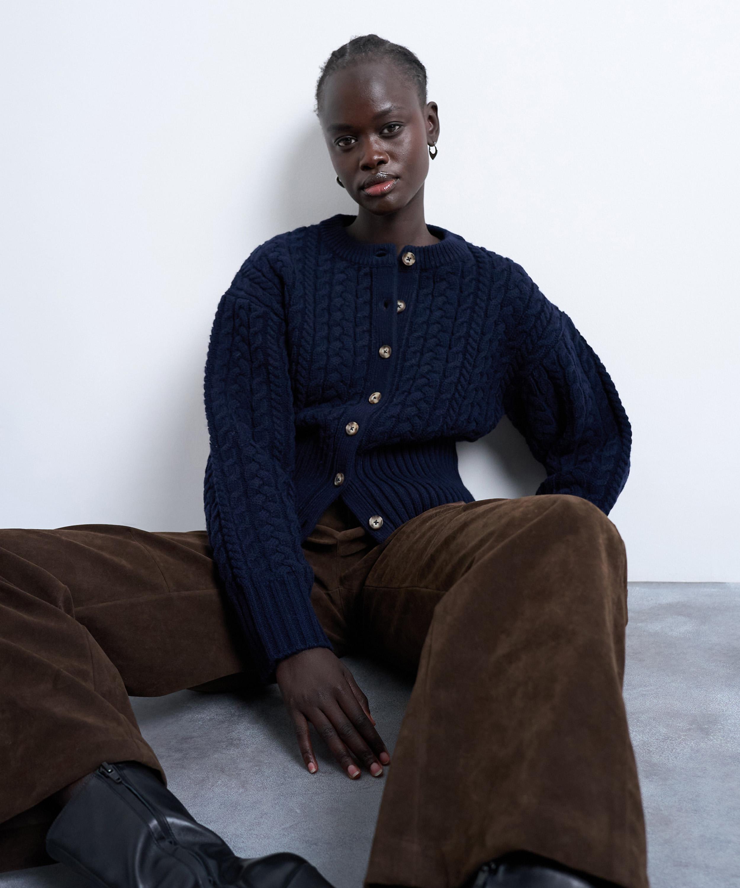 Crafted from a wool-blend cable knit in a timeless navy blue hue, this versatile cardigan features a crew neckline, long sleeves, a front button placket, ribbed trims, and a fitted waist, creating a flattering silhouette – making it the perfect winter warmer.