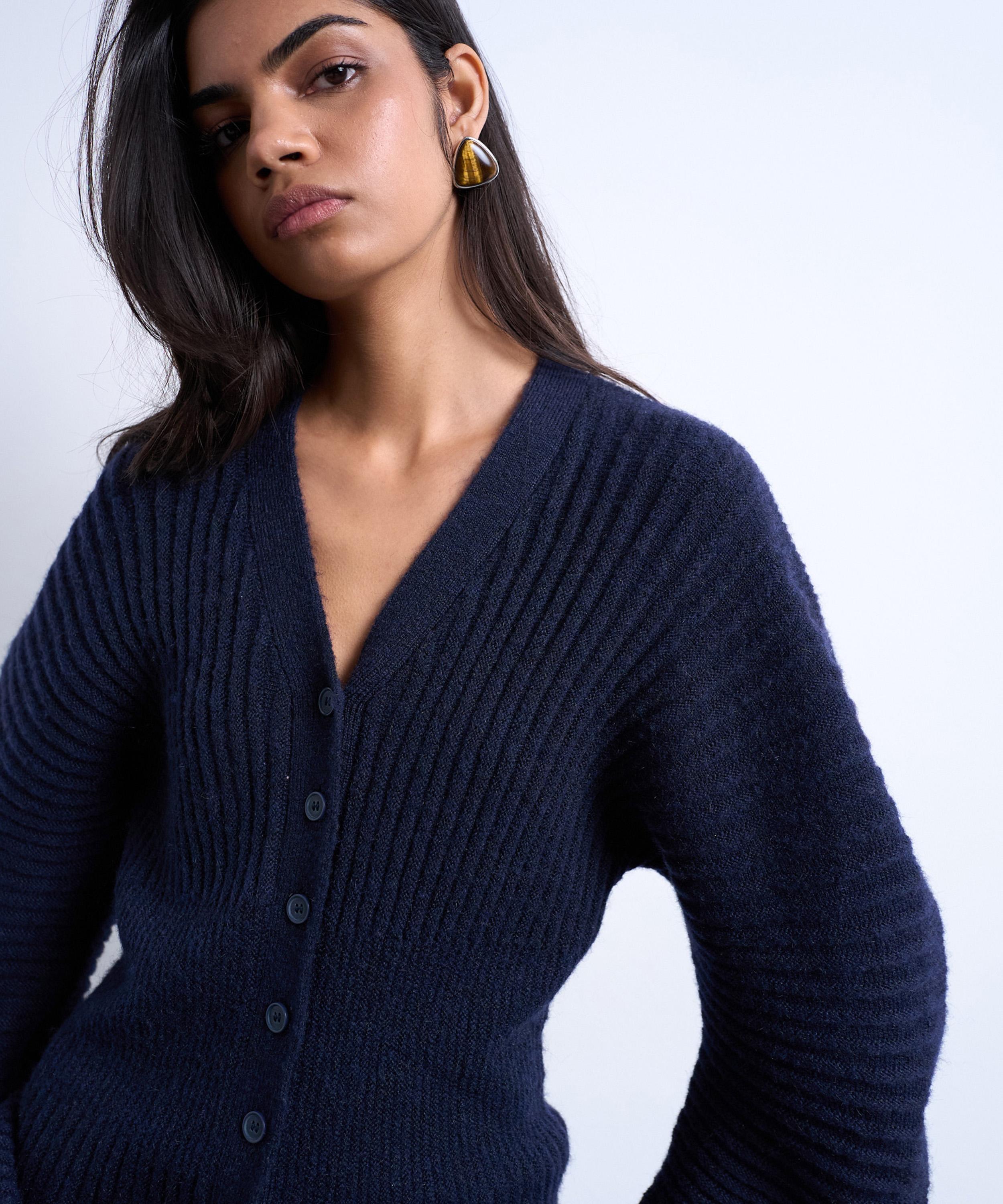 The Navy Knitted Ovoid Sleeve Cinch Cardigan is part of the exclusive Liberty x TOPSHOP residency, marking TOPSHOP’s highly anticipated relaunch at Liberty.