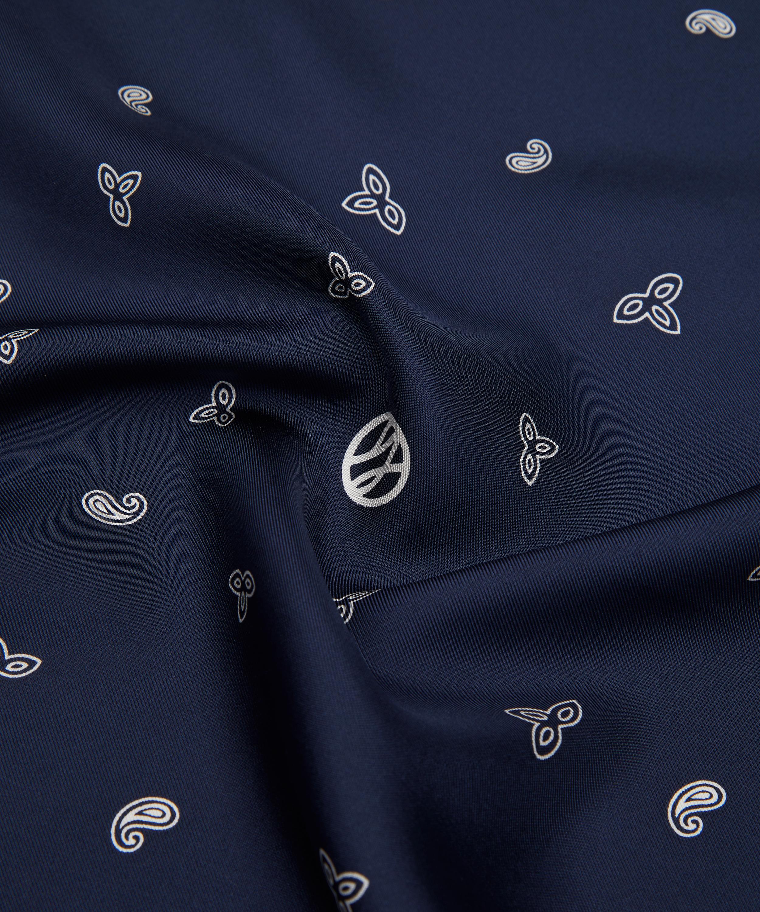 Crafted from lustrous silk in a navy blue hue, it features an ornate paisley pattern. Boasting a versatile, square silhouette, it offers endless styling possibilities, as it effortlessly drapes around your neck, ties up your hair or wraps around the handle of your bag.