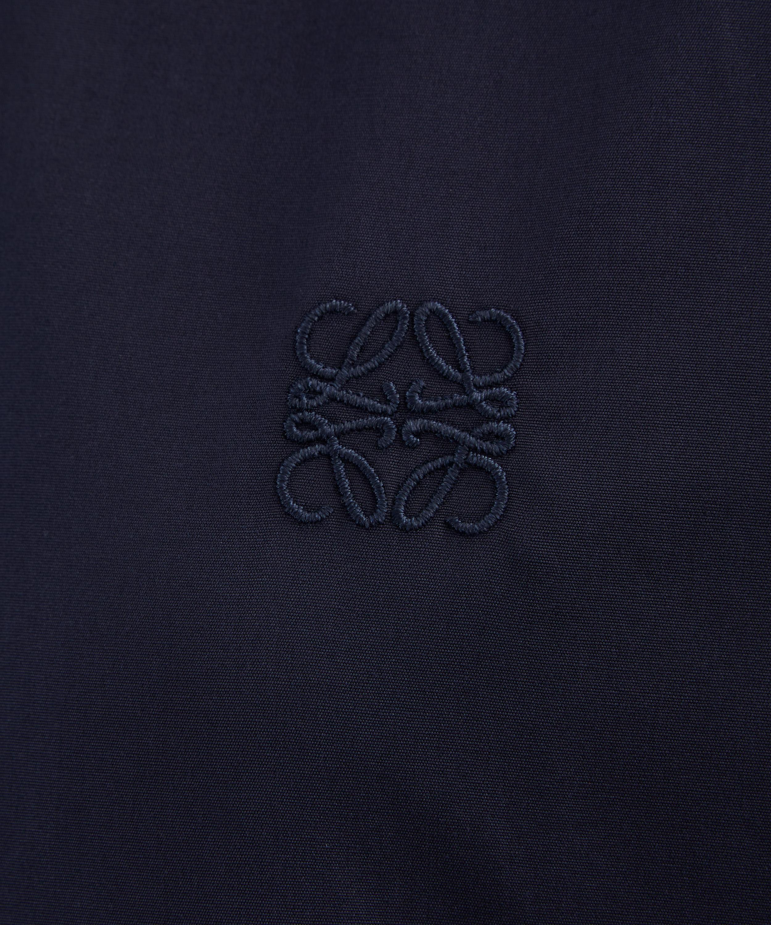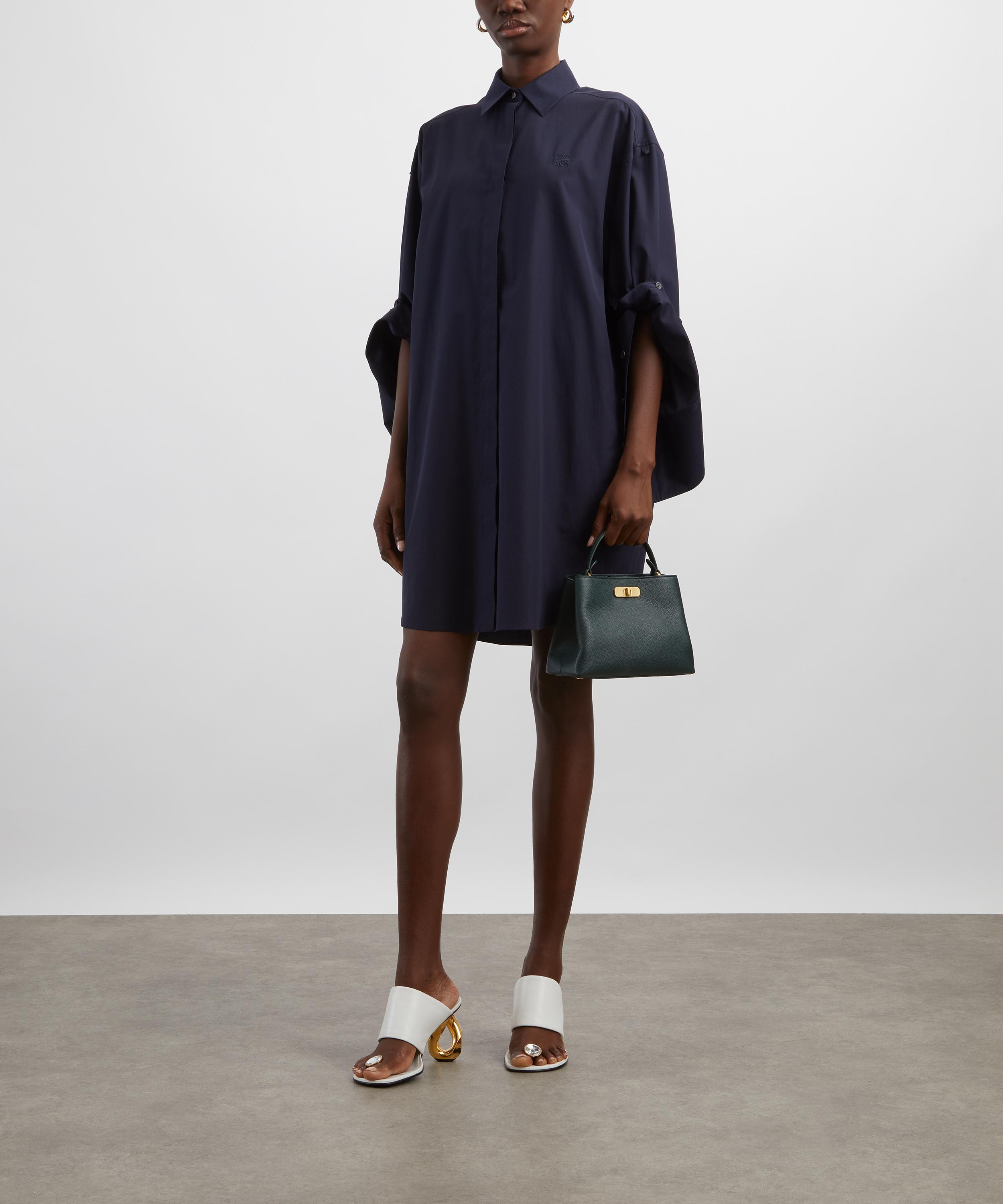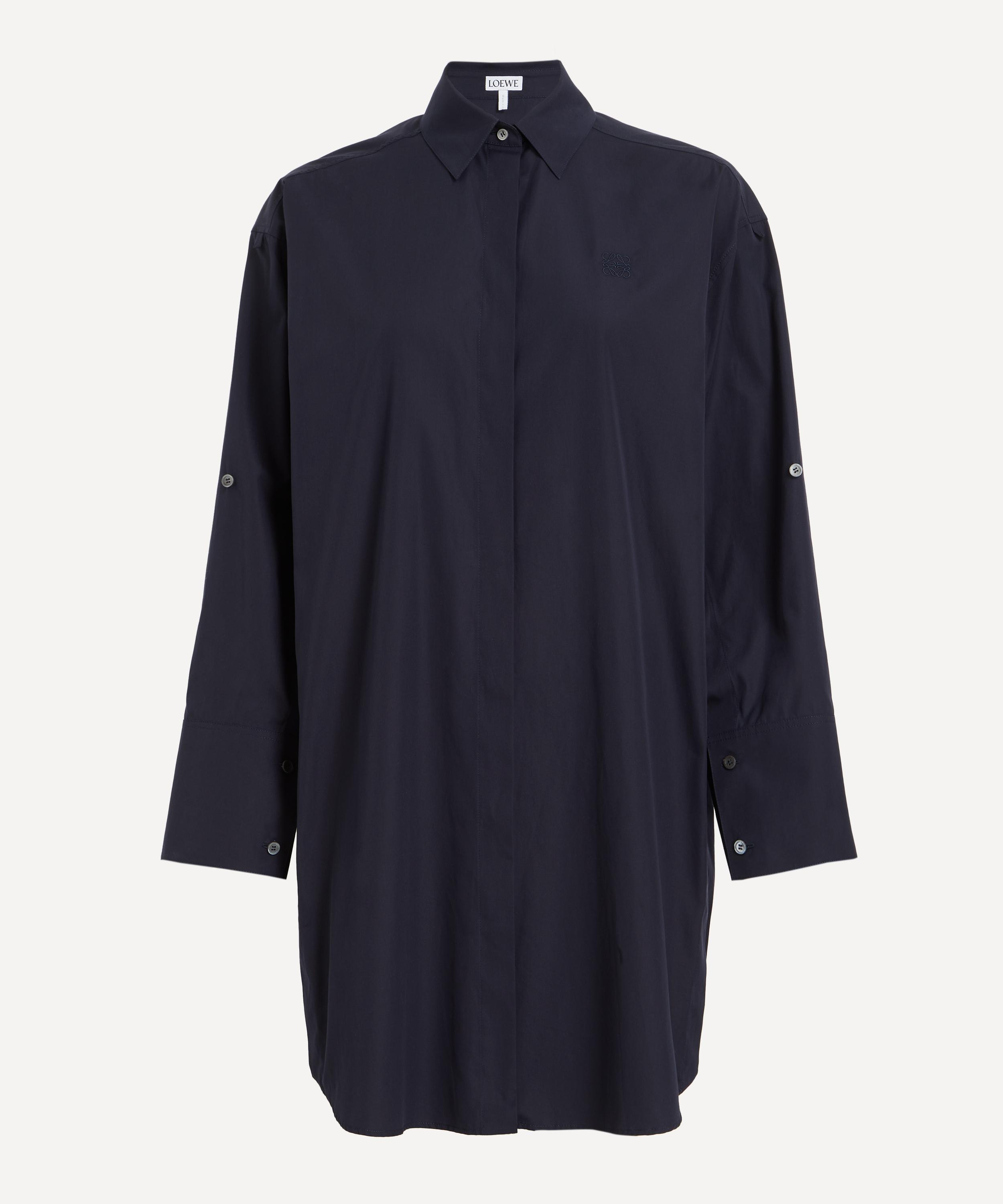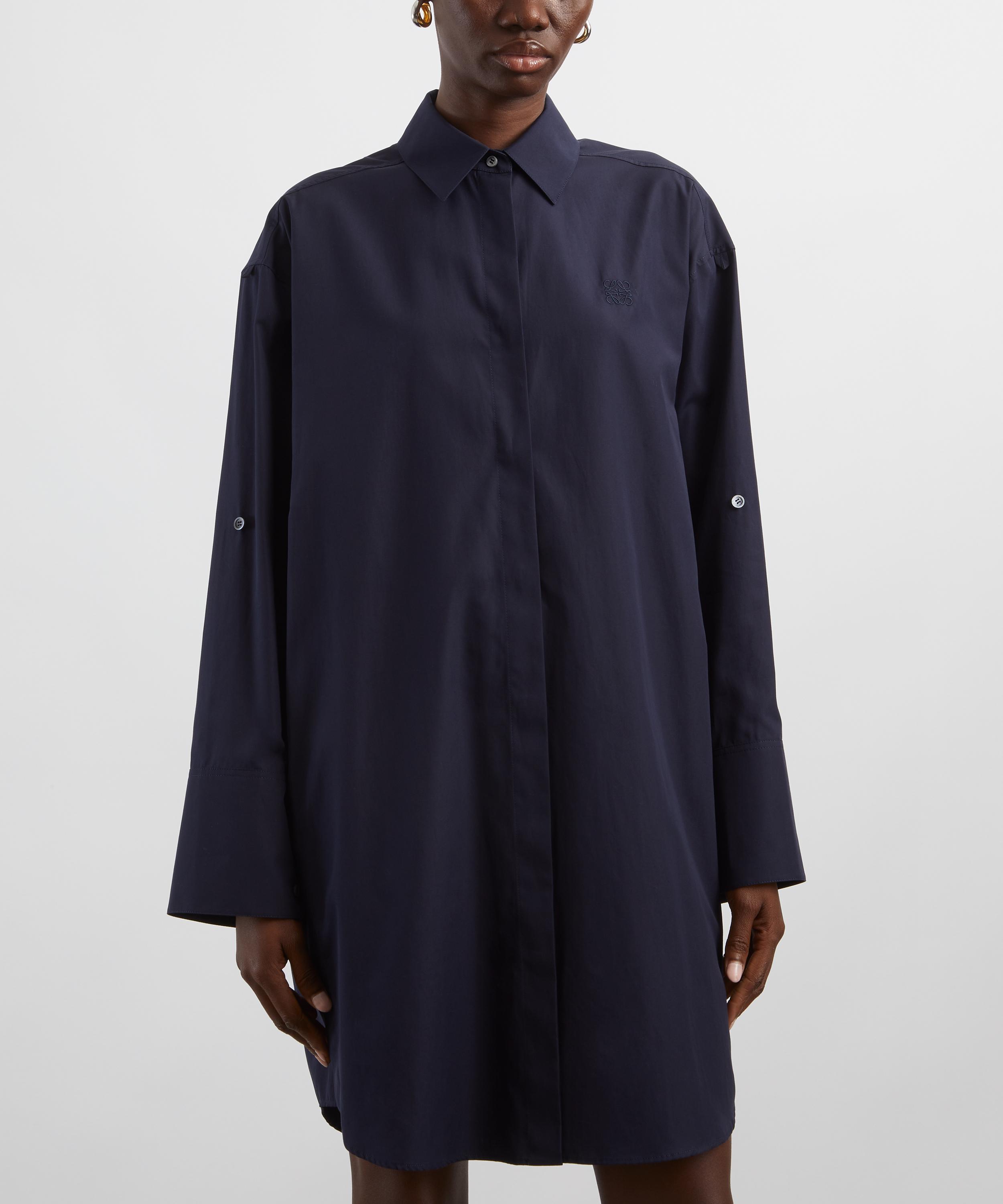 Crafted from lightweight matte silk crepe in a deep navy hue, this shirt dress is cut to a relaxed, knee–length silhouette with a classic collar, concealed front button fastening, and adjustable sleeves. Signature Anagram embroidery at the front provides a distinctive finish.