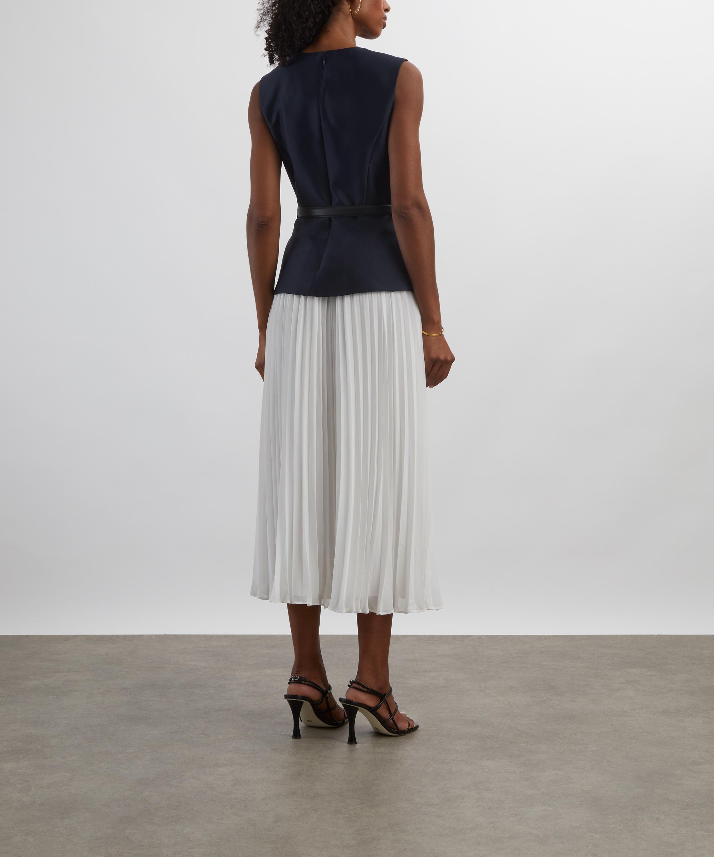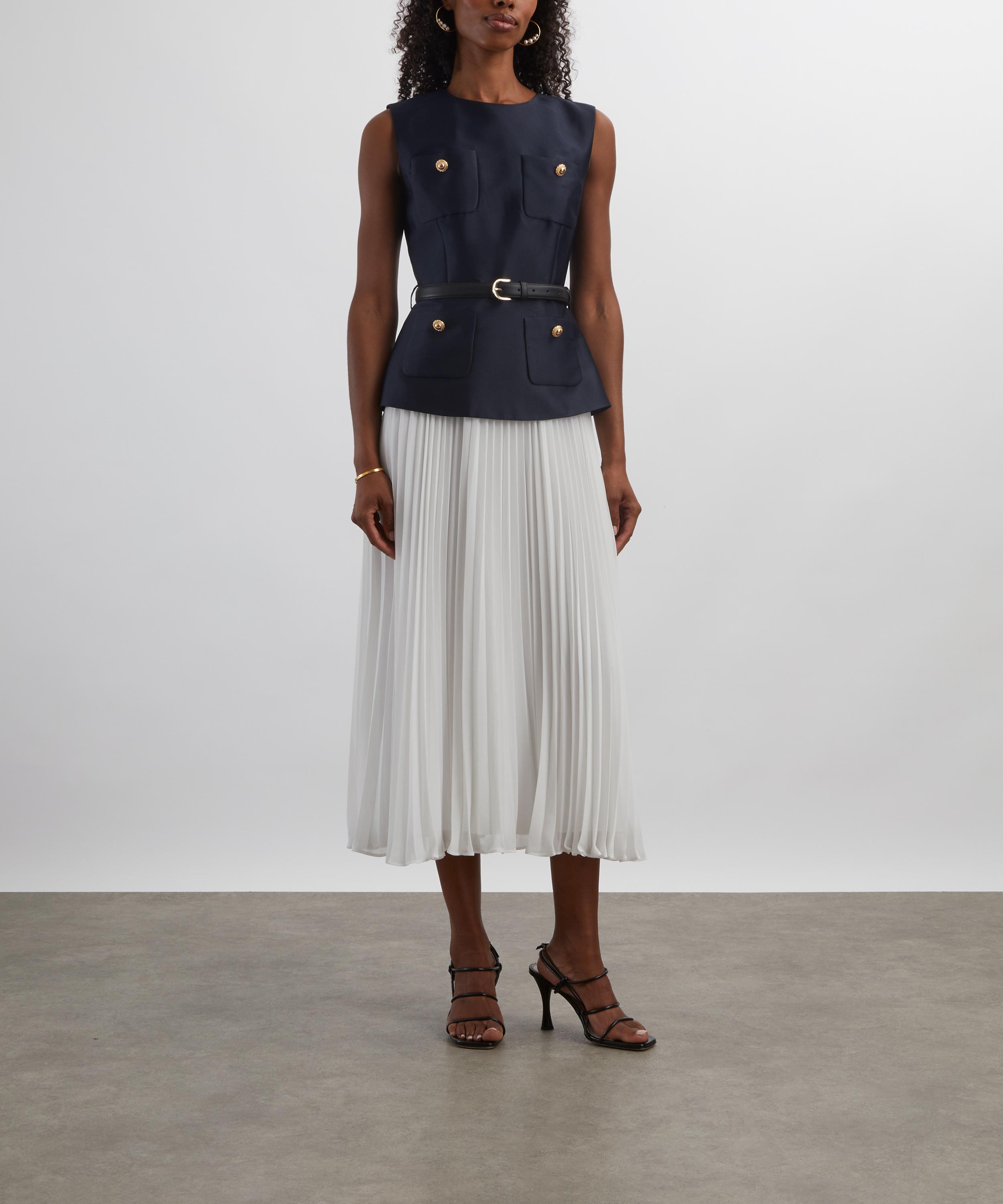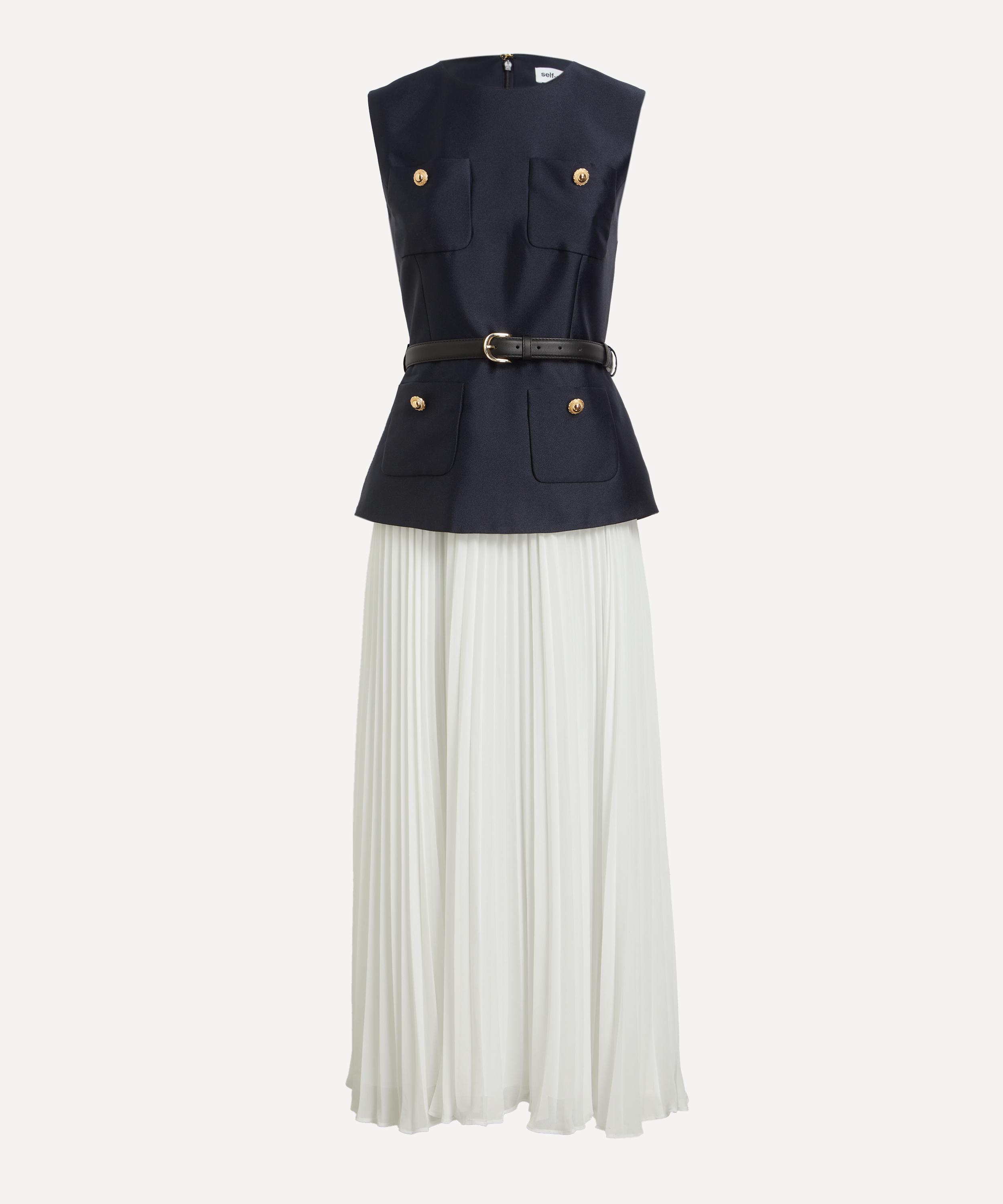 Structured navy taffeta and creamy chiffon meet to perfection in this tailored midi dress. Offering a sleeveless and fitted silhouette, the belted waist and gold buttons add a refined, lady-like polish to the piece.