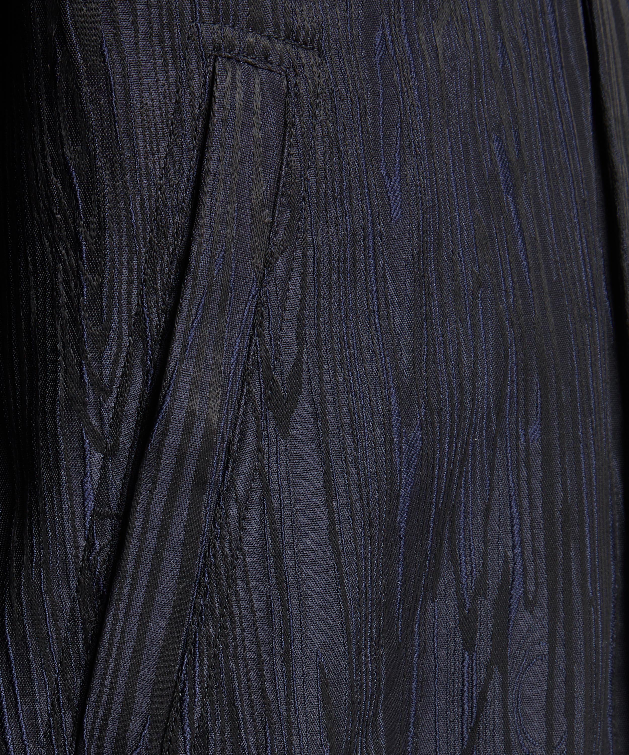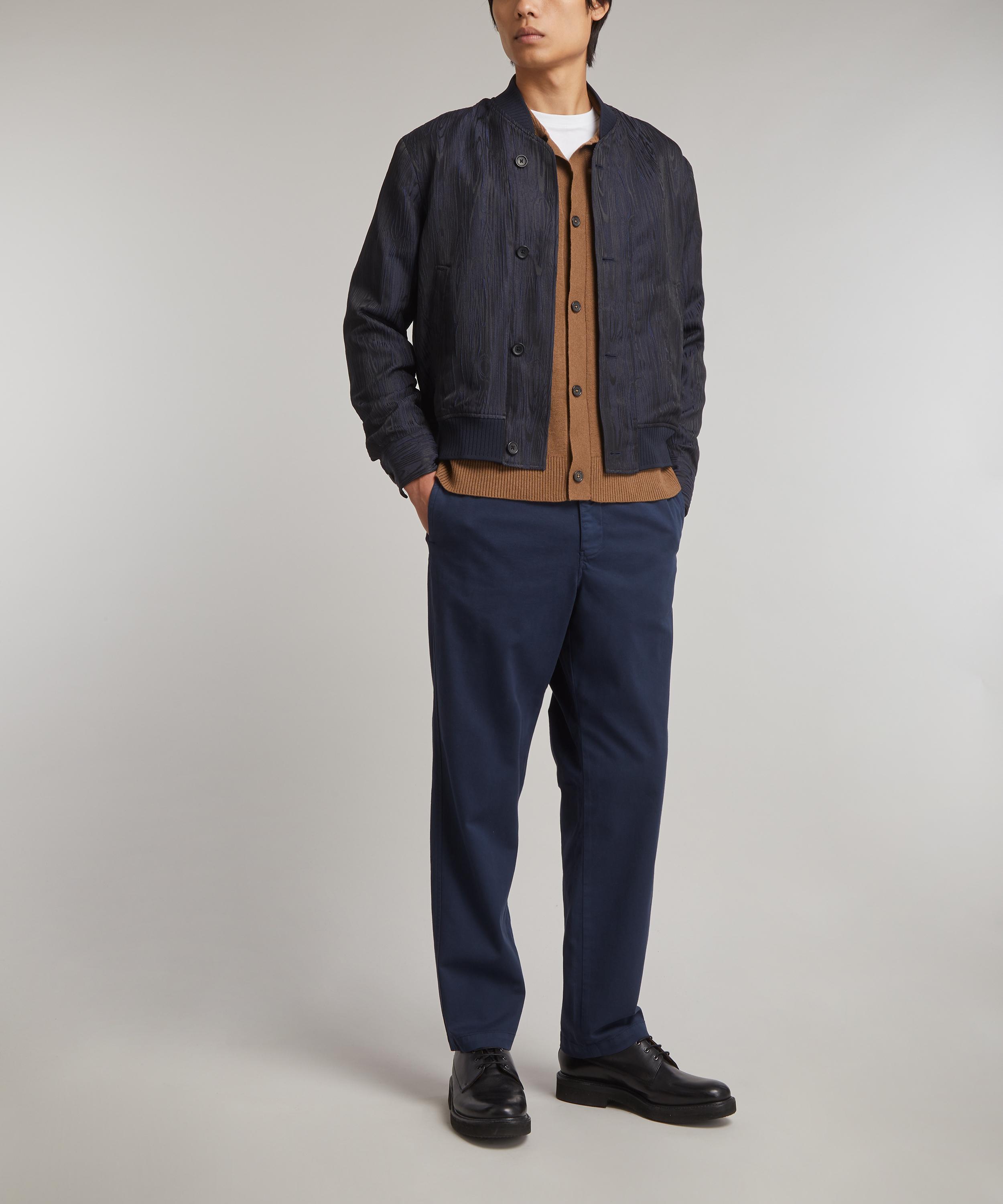 Constructed from a unique navy fabric presenting a tactile, wood grain-effect pattern, this modern take on the classic bomber jacket features a front button fastening, slash pockets, buttoned cuffs, and ribbed trims.
