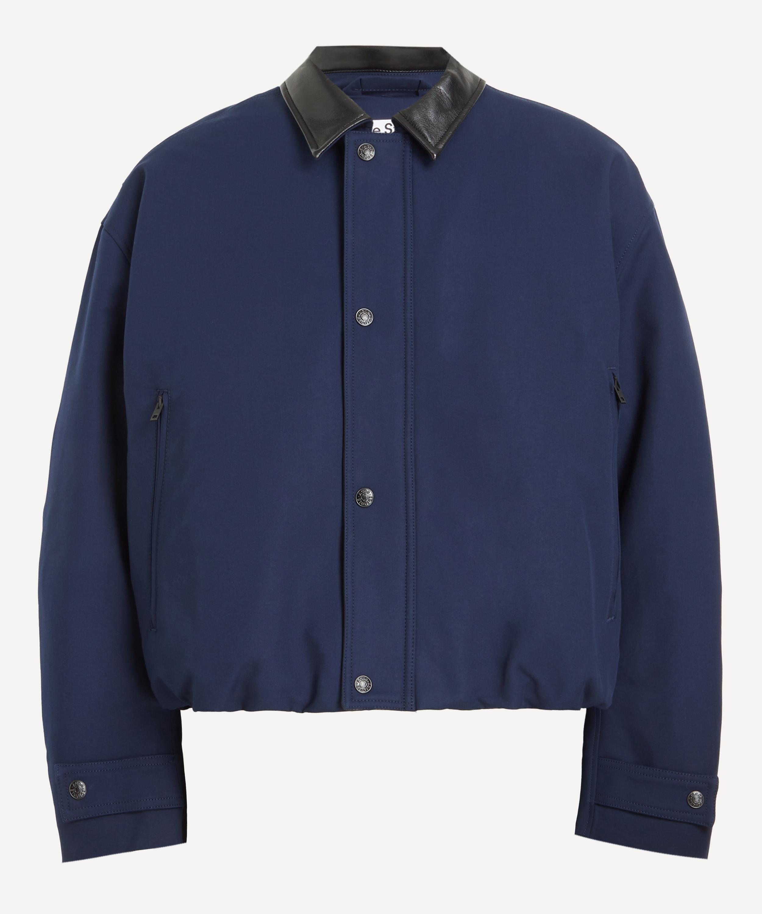 Crafted from smooth cotton with a satin-woven double-layer construction, this navy jacket features a contrasting leather collar, snap-button closure, and an embossed Acne Studios leather logo patch on the back for a distinctive, signature finish.