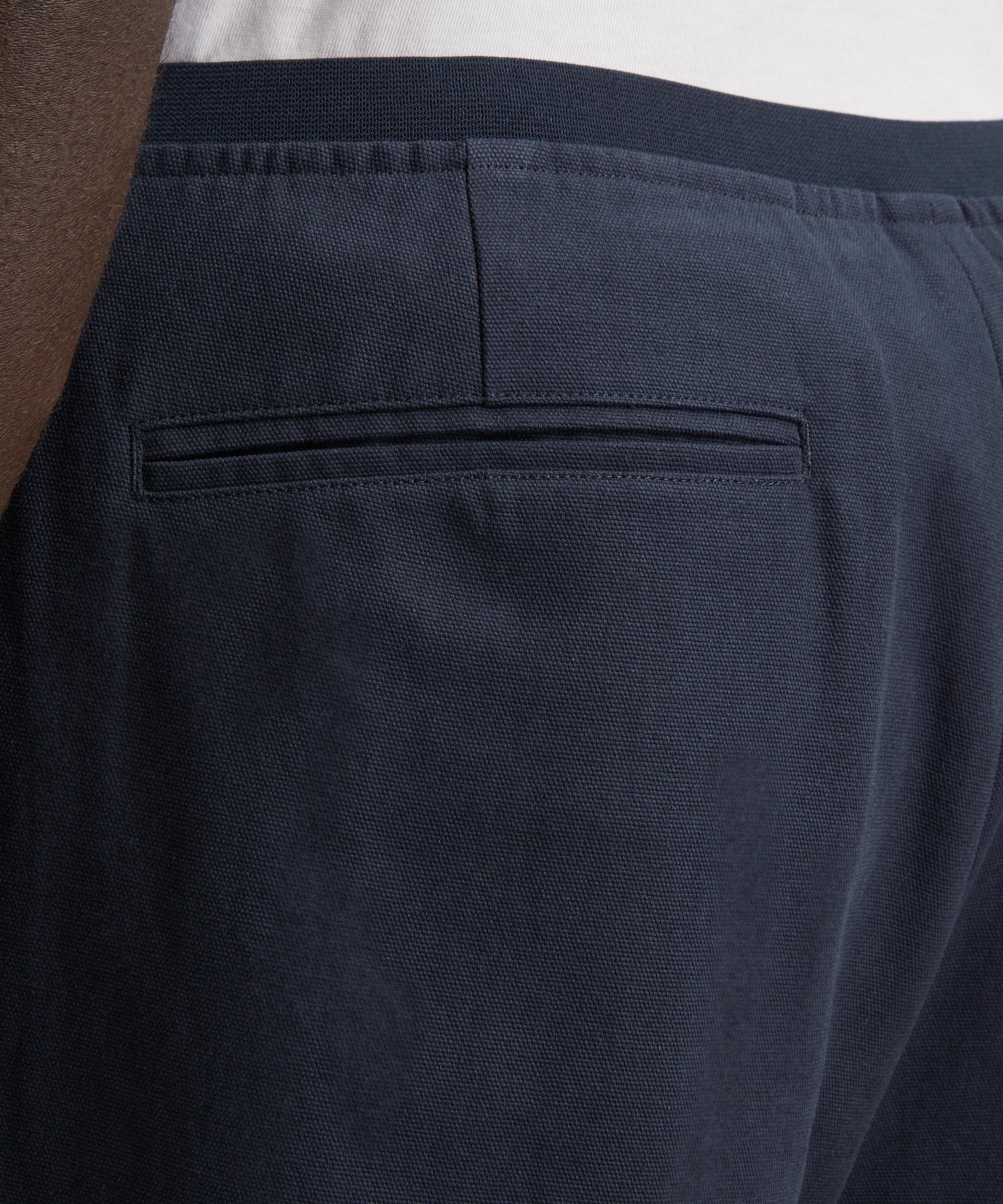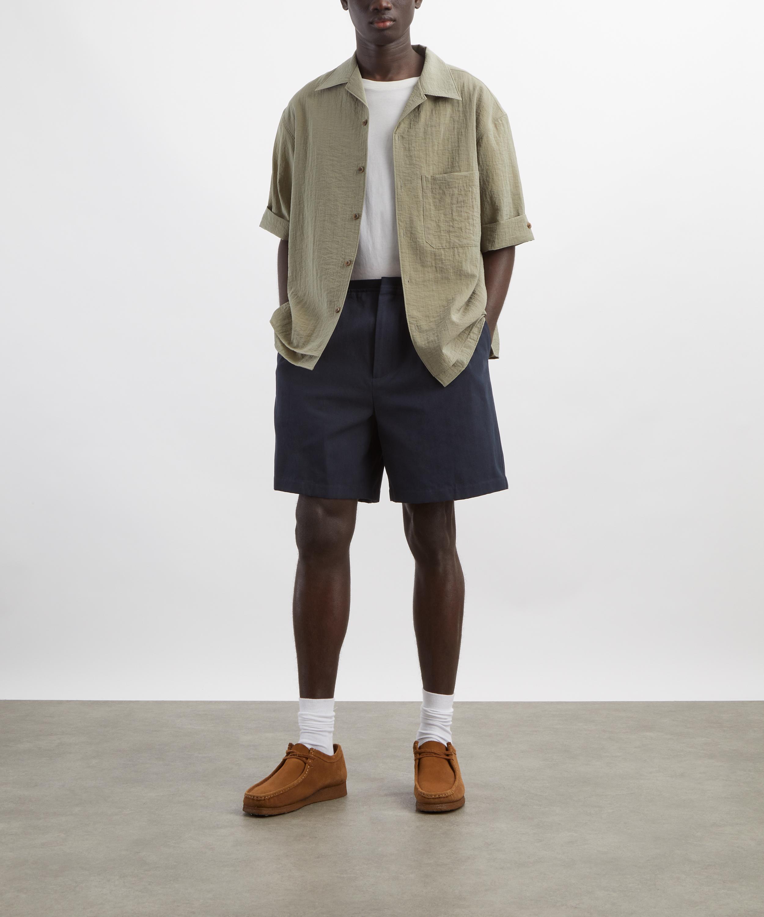 Crafted from durable cotton canvas, these navy shorts are designed with an elasticated waistband and double pleats at the front, offering a balance of comfort and refined structure.