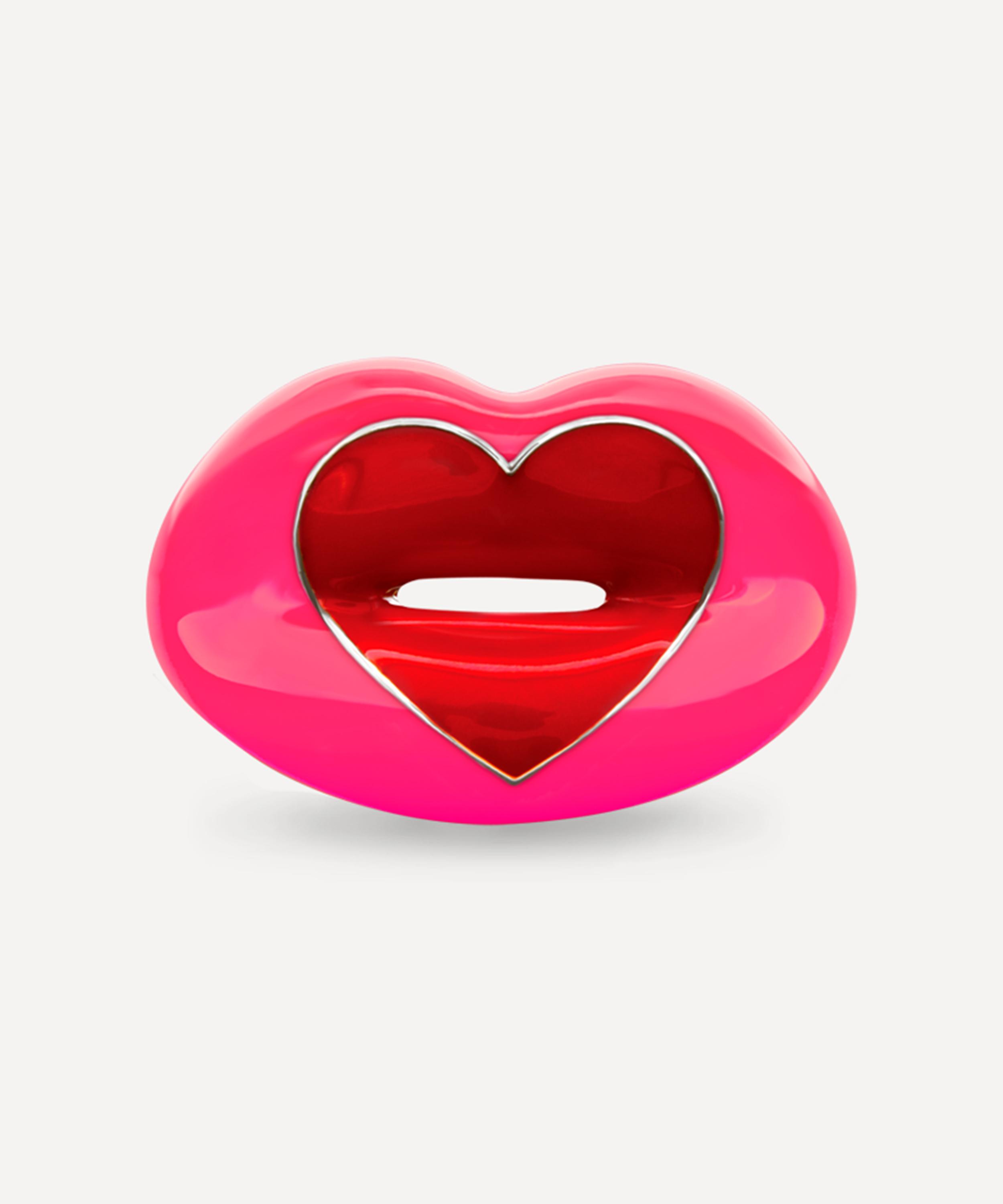 Add a touch of romance to your look with this rendition of the iconic Hotlips ring by British designer Solange Azagury-Partridge. Crafted from solid sterling silver, this distinctive ring is complete with a saturated neon pink lacquer lipstick colour with a glossy red love heart motif at the centre of a pair of pouting lips - a playful addition to your everyday line-up, mix and match with several other rings from the Hotlips range for a fun, contemporary curation.