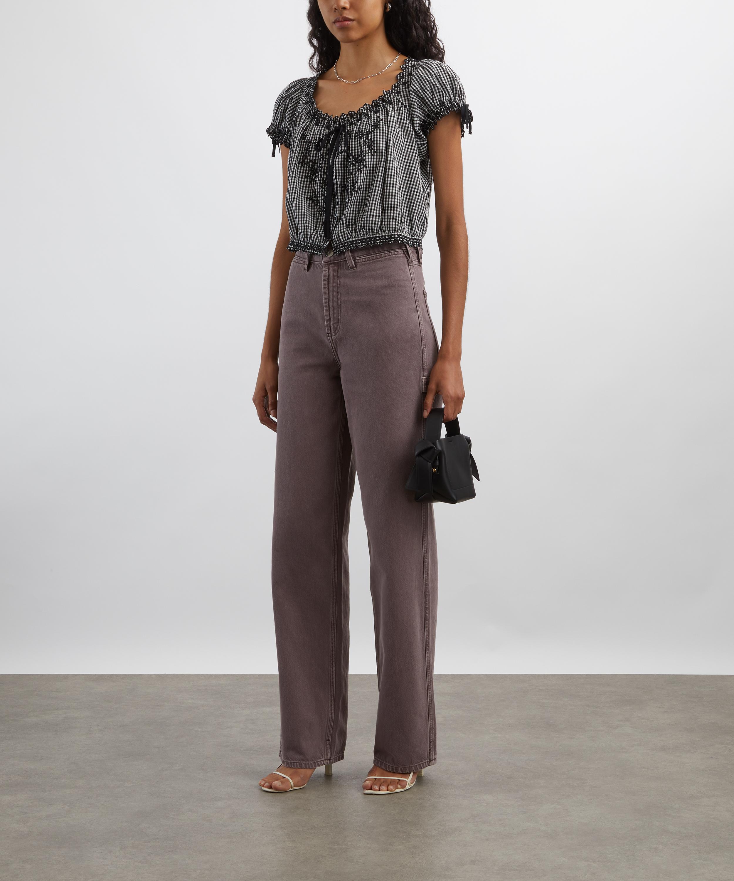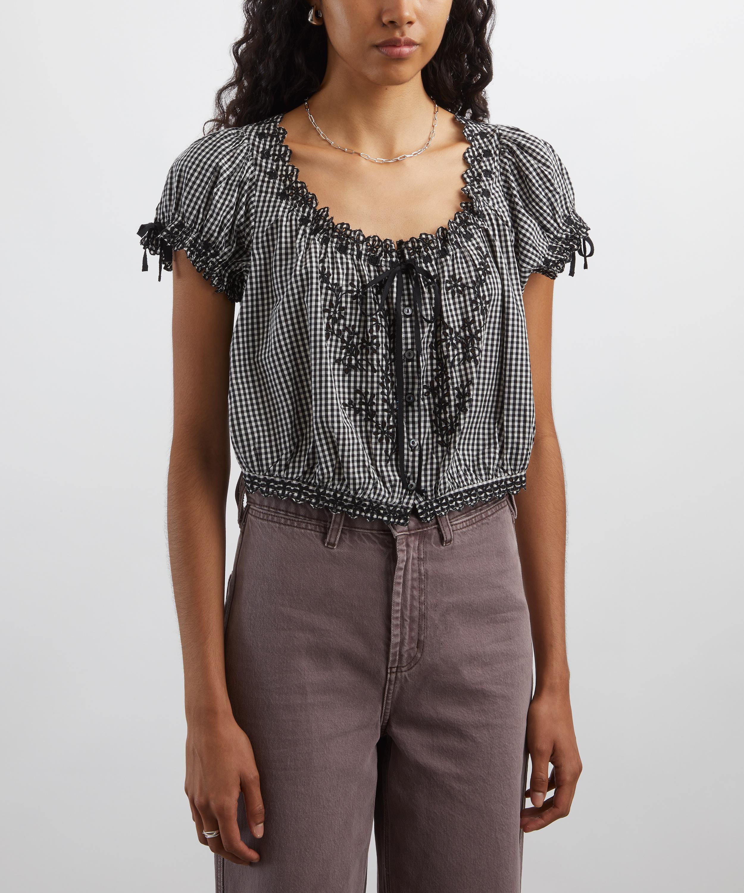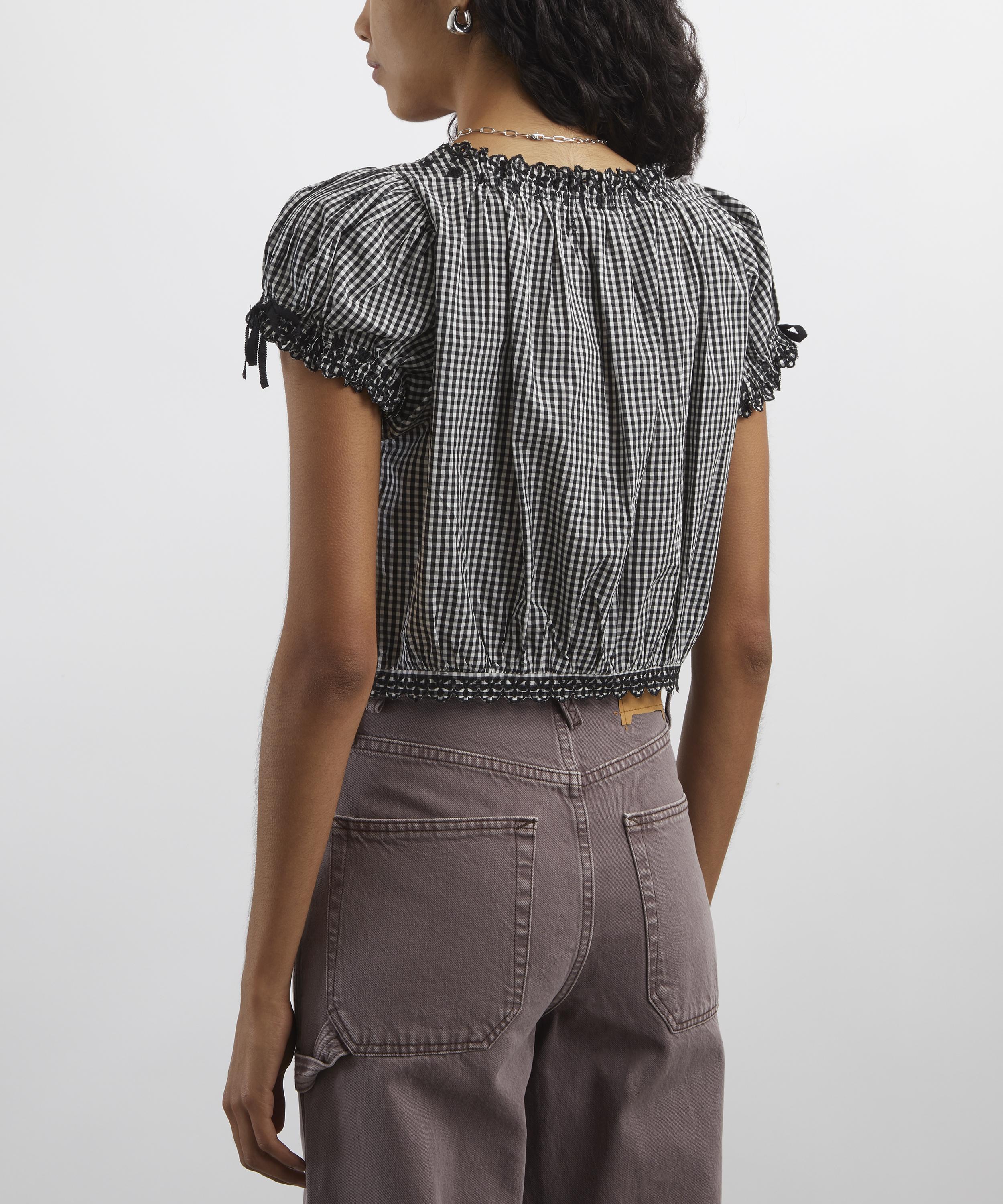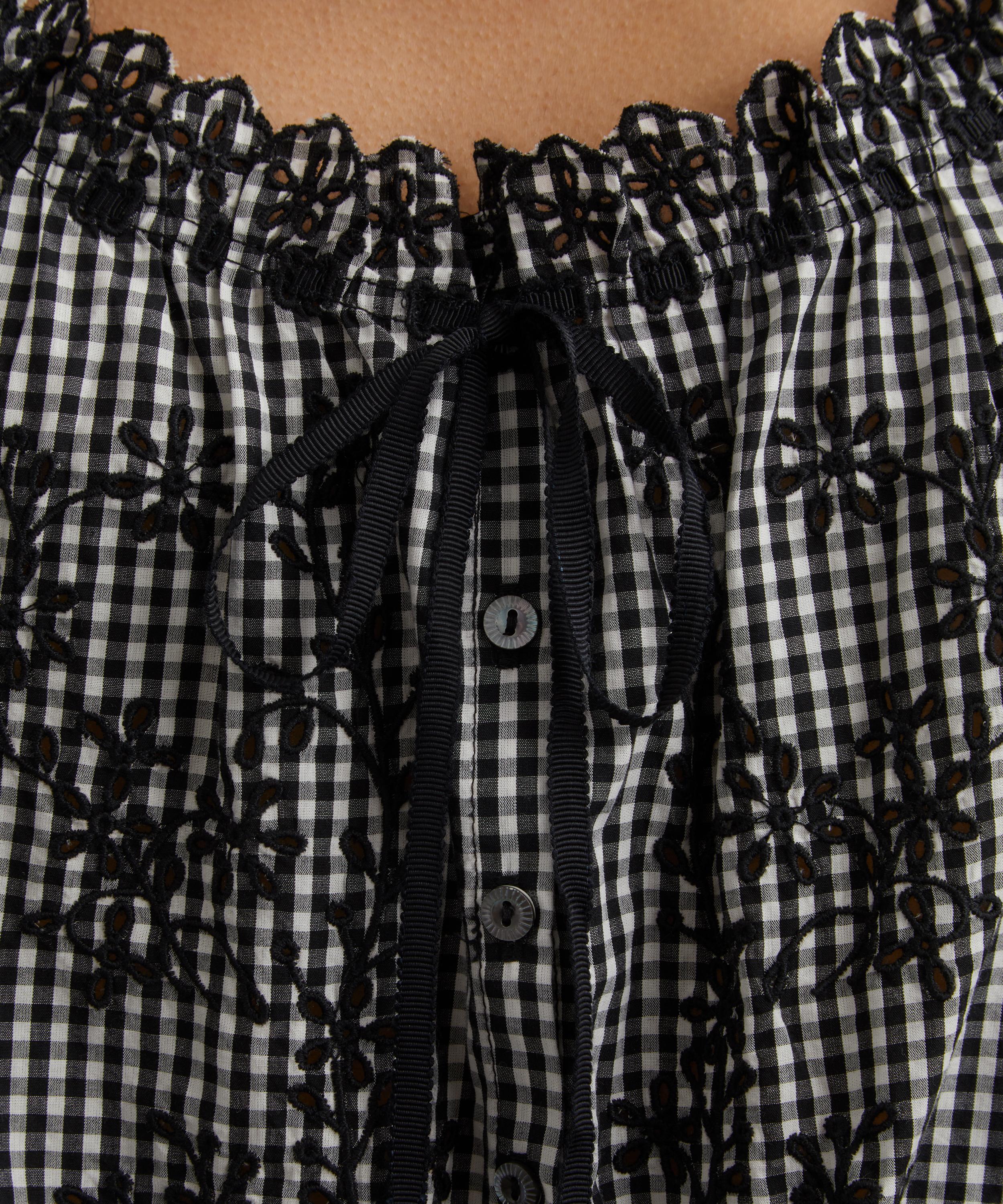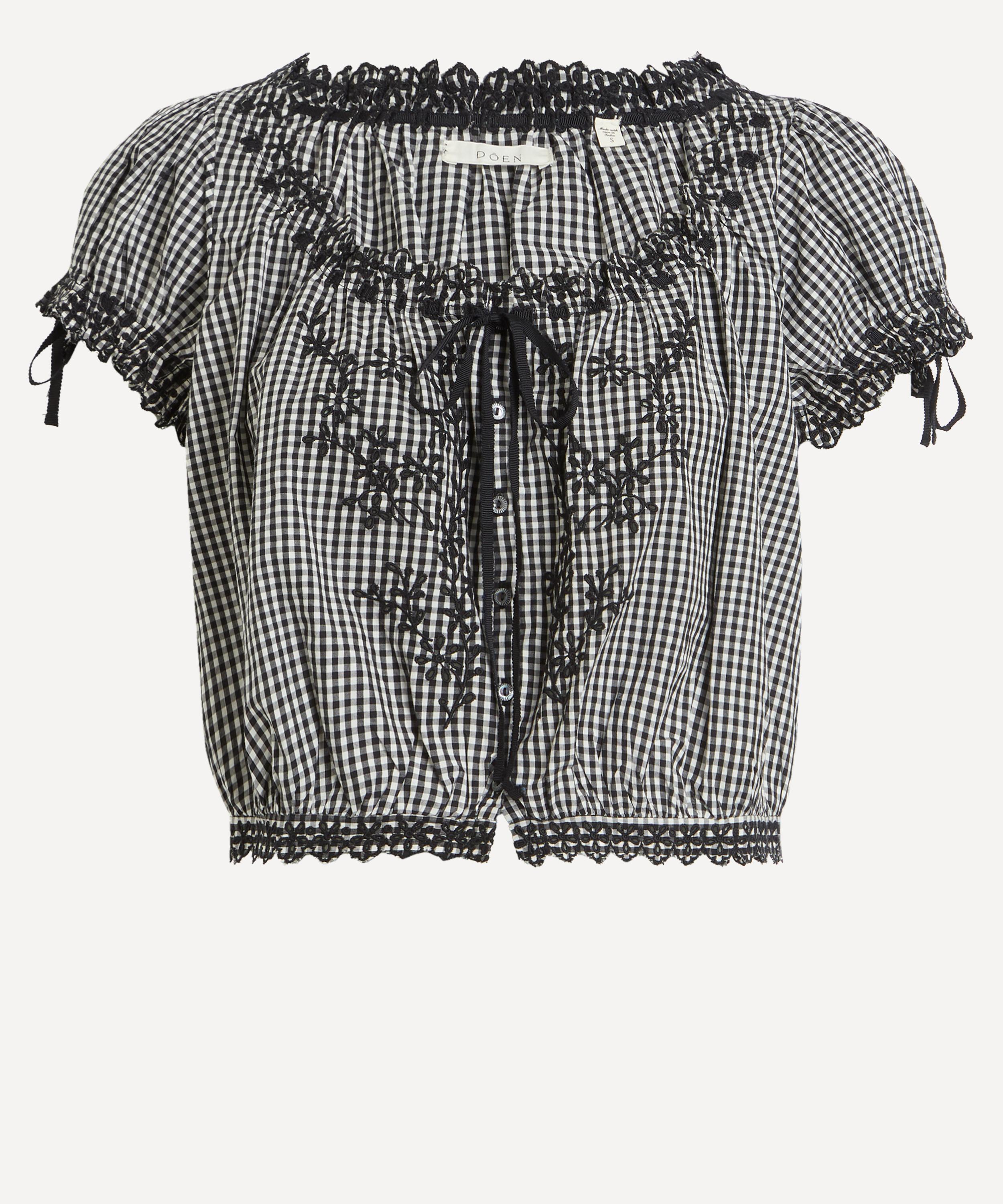 Crafted from crisp cotton poplin in a timeless black gingham check, the Nera Top features a flattering scoop neckline, voluminous short sleeves, and a slightly cropped silhouette. Delicate starburst buttons and floral eyelet embroidery lend a charming, feminine touch to this elevated everyday piece.