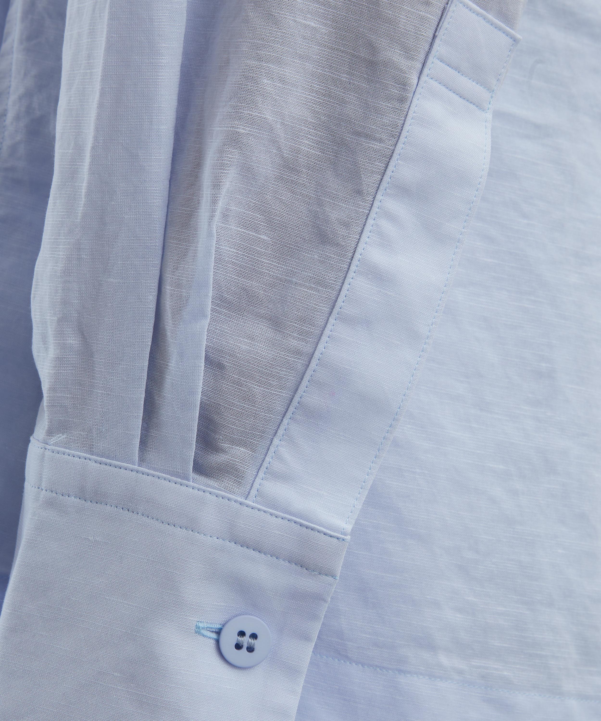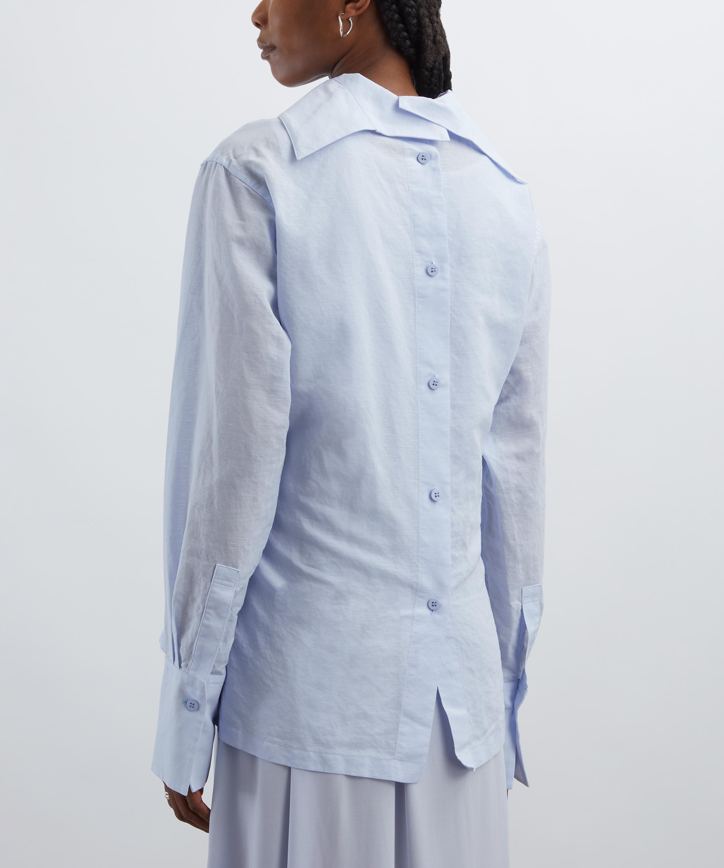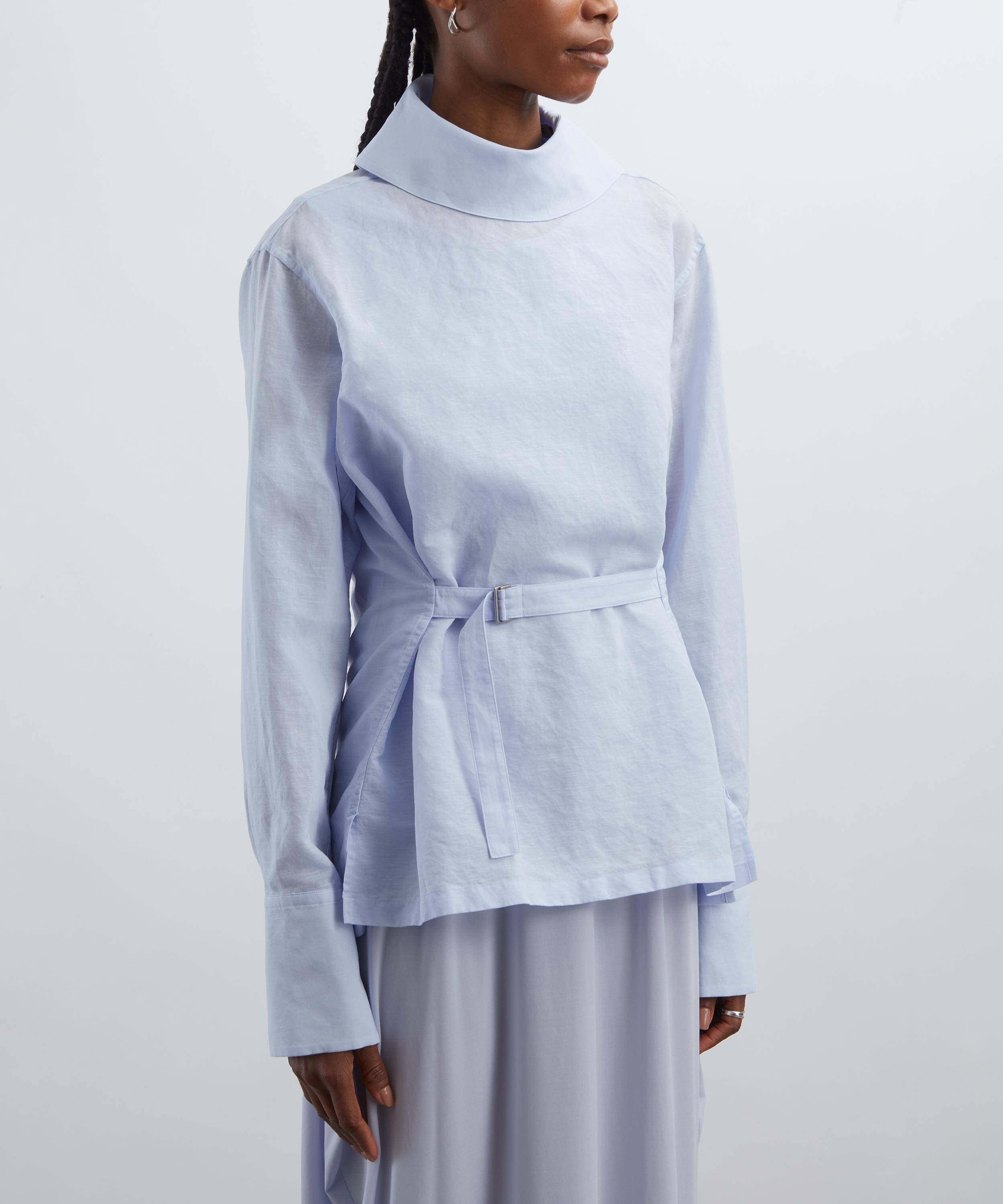 Woven from cotton-linen PAPER-ESQUE U fabric - treated through specialised finishing processes to achieve a firm yet supple texture - this shirt showcases ultra-long sleeves, a high fold-over collar, and back button fastenings. A detachable waist belt offers the option to cinch the silhouette, adding versatility to its sculptural design.