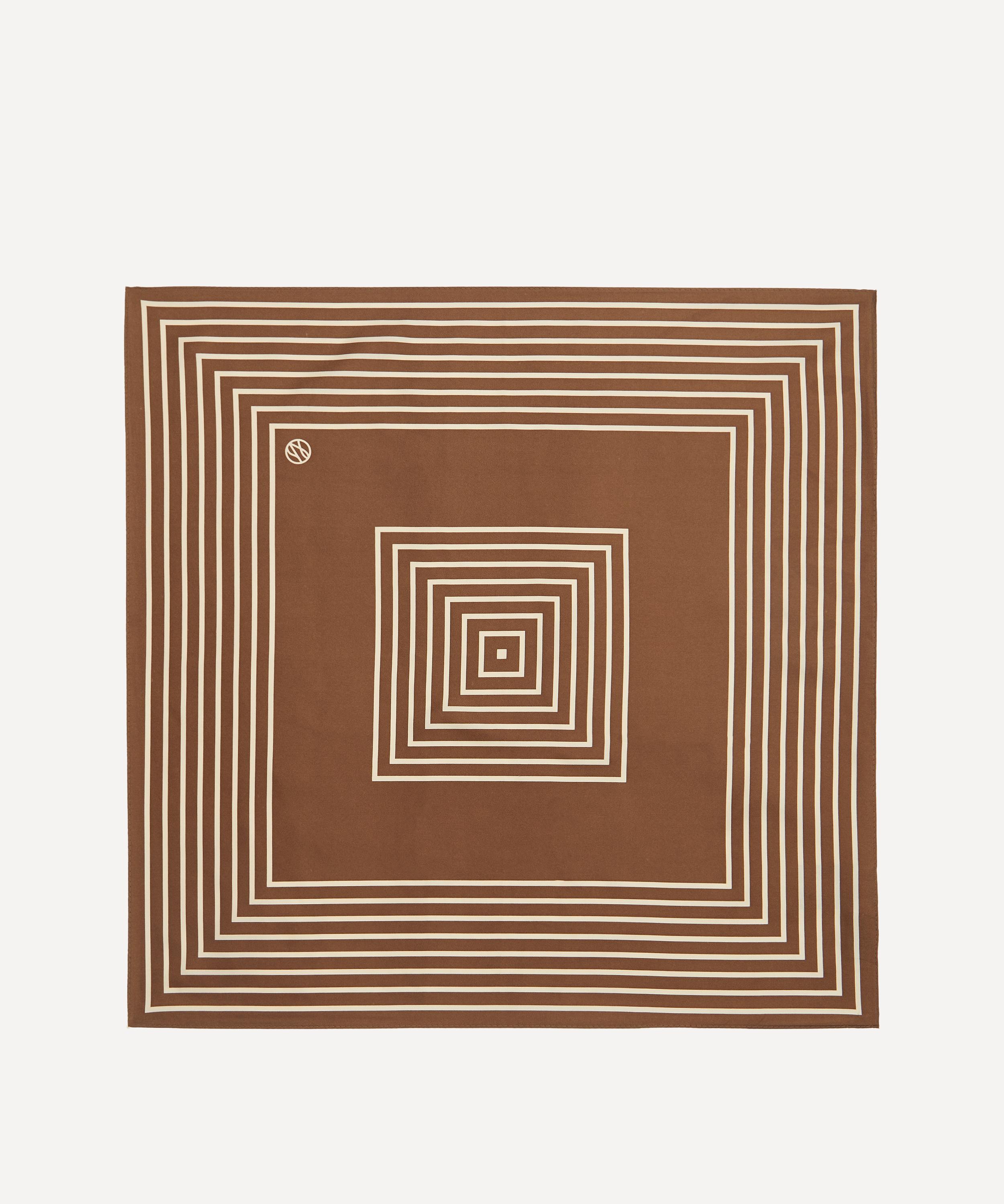 Crafted from lustrous silk in a rich chocolate brown hue, it features ascending beige stripes, framed by a matching border. Boasting a versatile, square silhouette, it offers endless styling possibilities, as it effortlessly drapes around your neck, ties up your hair or wraps around the handle of your bag.
