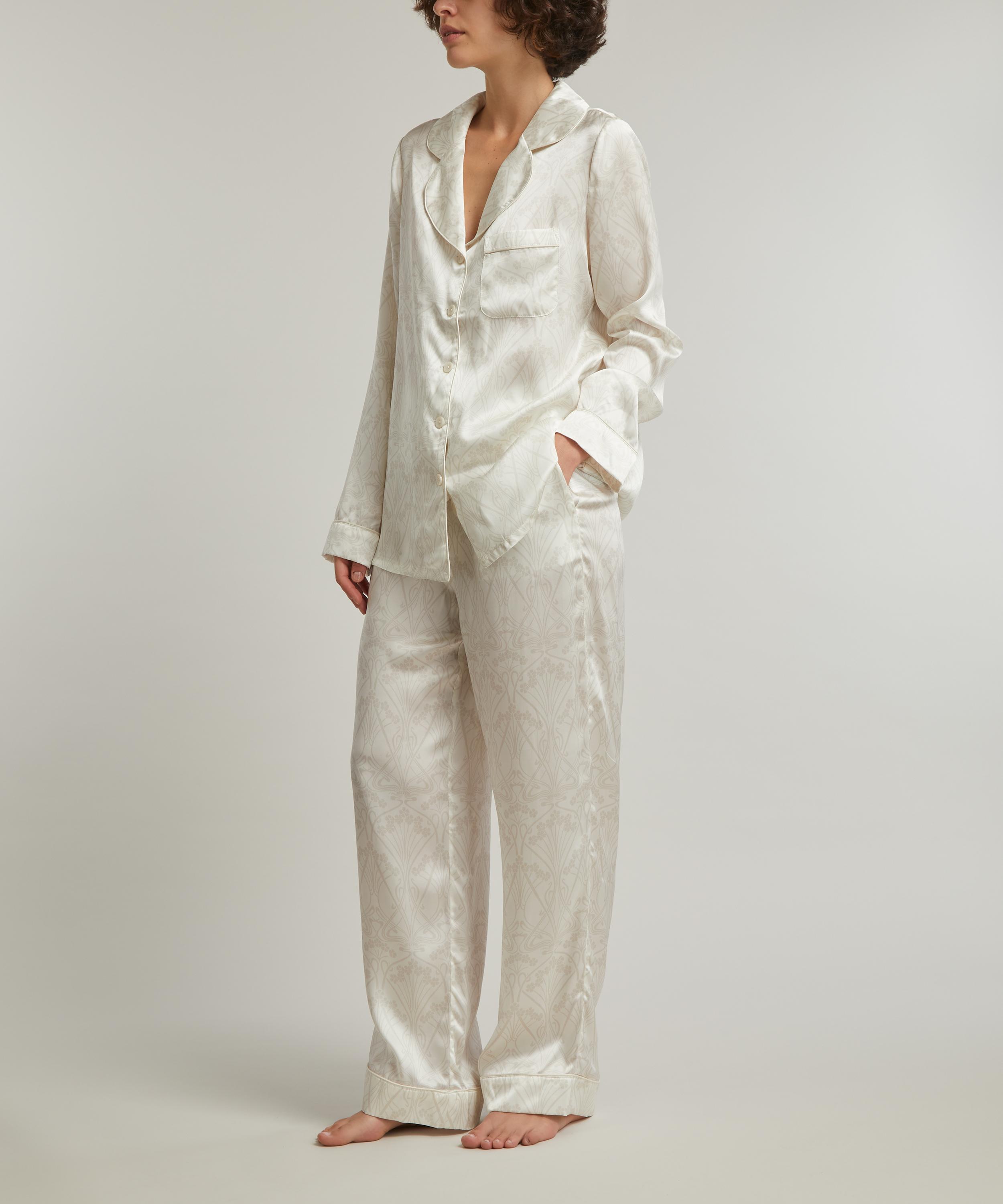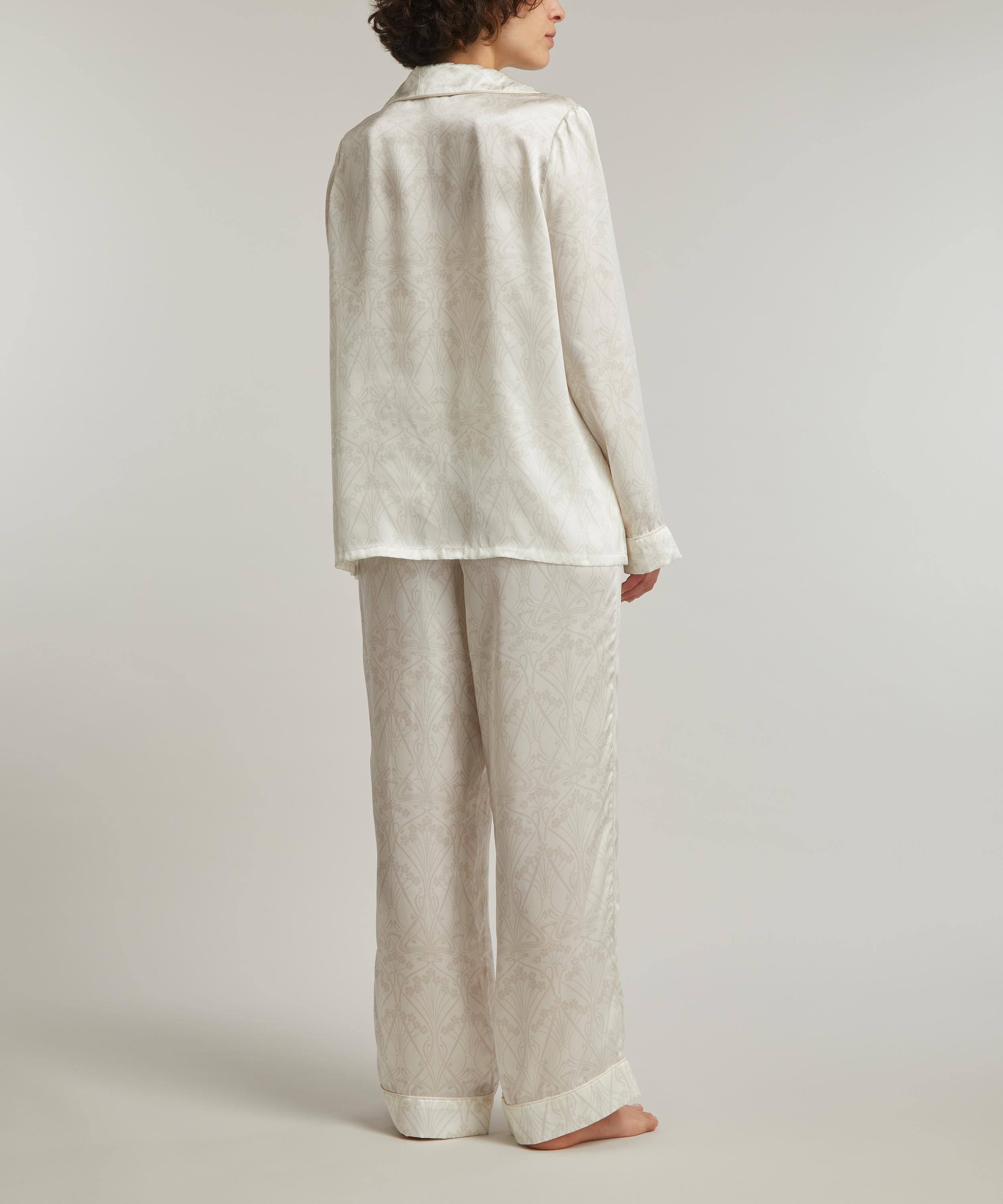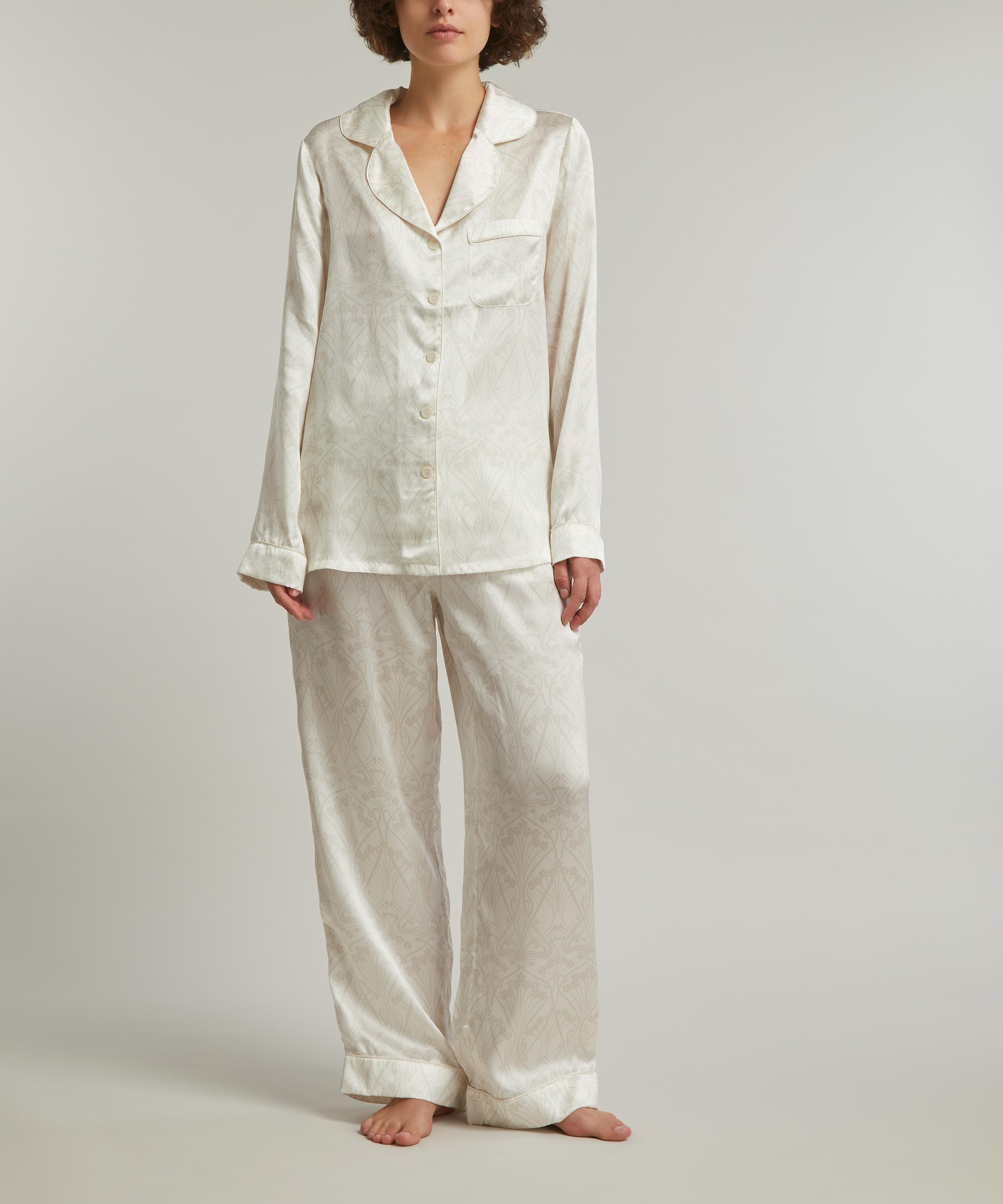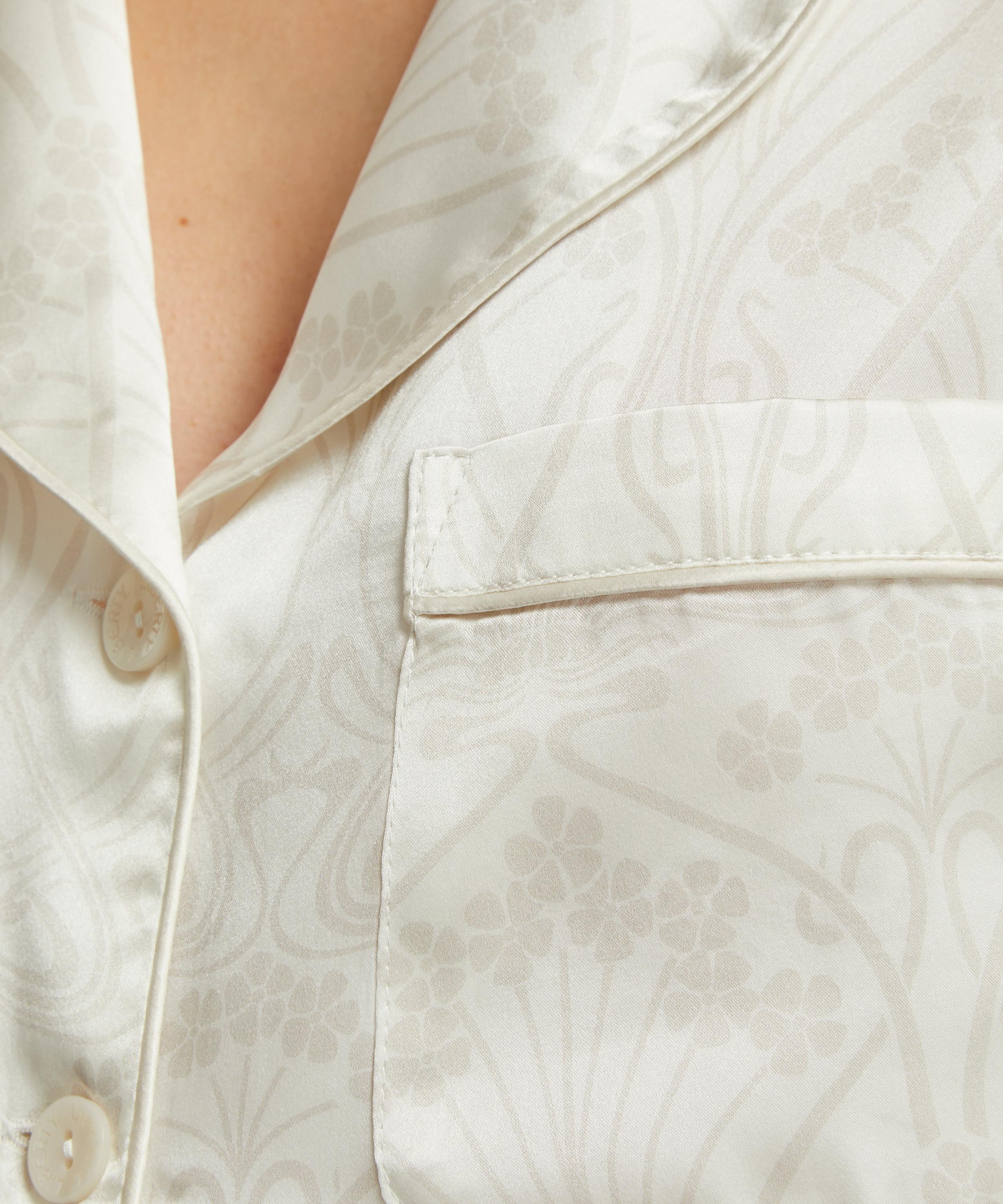 Effortlessly sophisticated and easy-to-wear, this traditional two-piece pyjama set is detailed with a notched lapel, piped trims, and an adjustable drawstring waistband for ultimate comfort and ease. Expertly crafted from fluid silk-satin, it showcases our Nouveau Ianthe print: A monochromatic, tonal version of Liberty’s famous Art Nouveau icon, Ianthe.