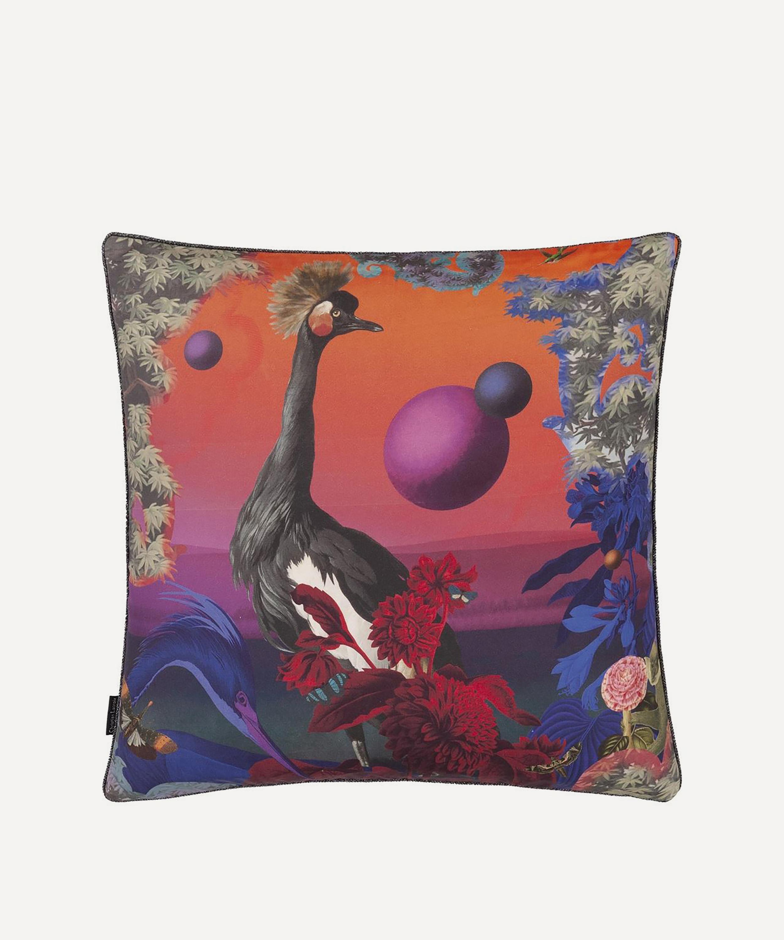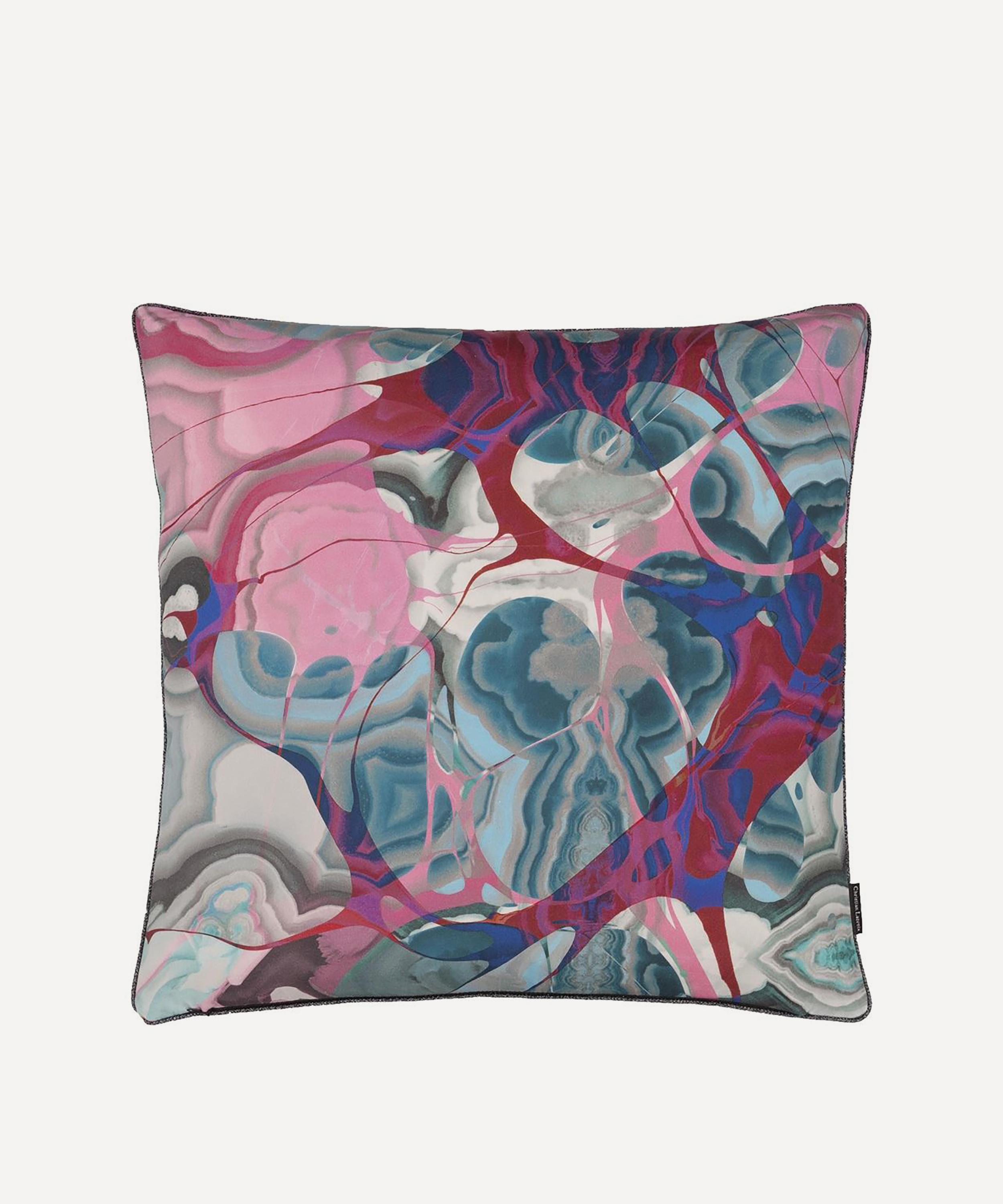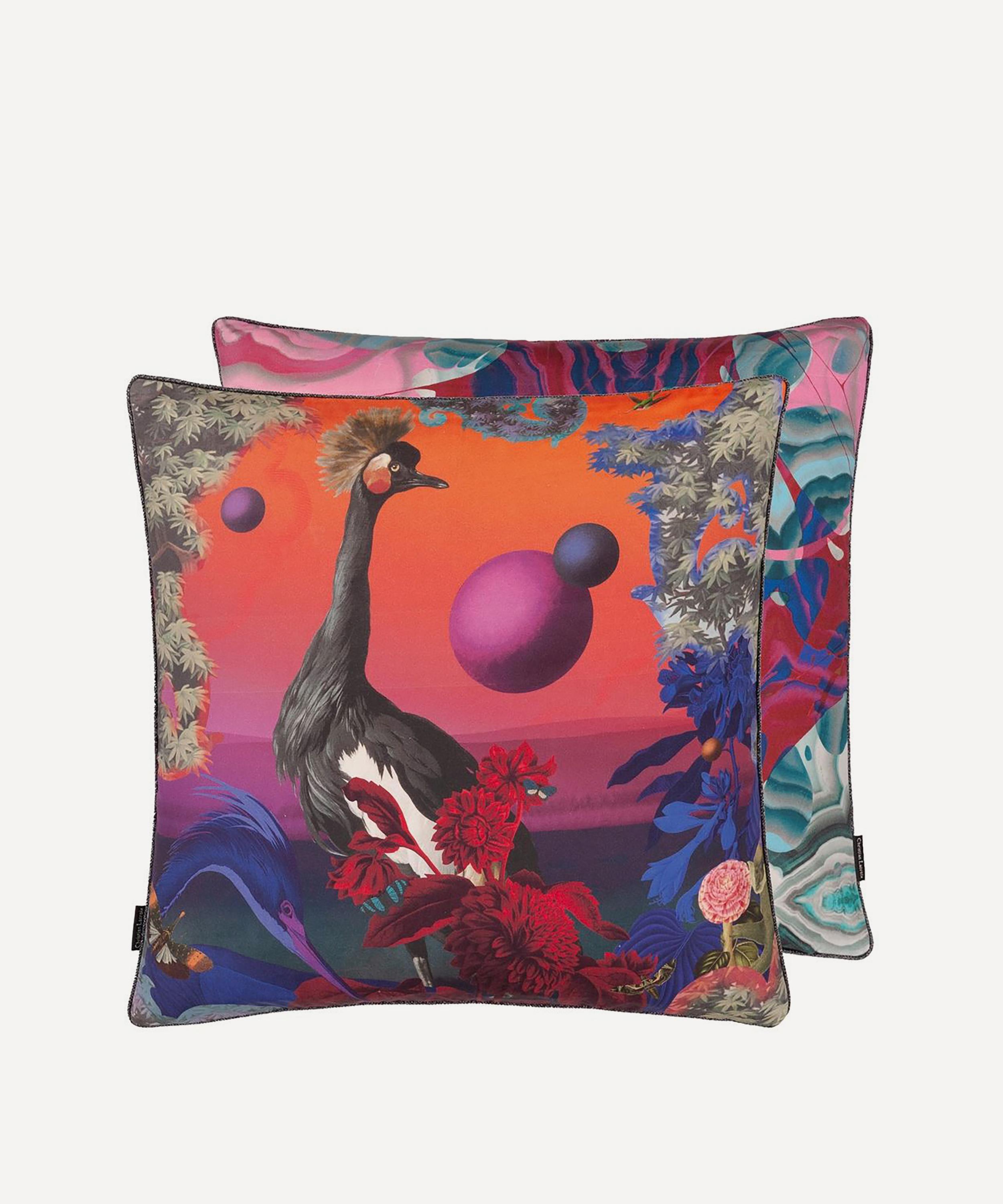 Spotlighting a flamboyant collage style design to the front, this cushion is digitally printed onto luxe cotton satin. With a zany polychromatic marbleised reverse and gunmetal lurex piping, style with block colours to enhance the vibrant design.