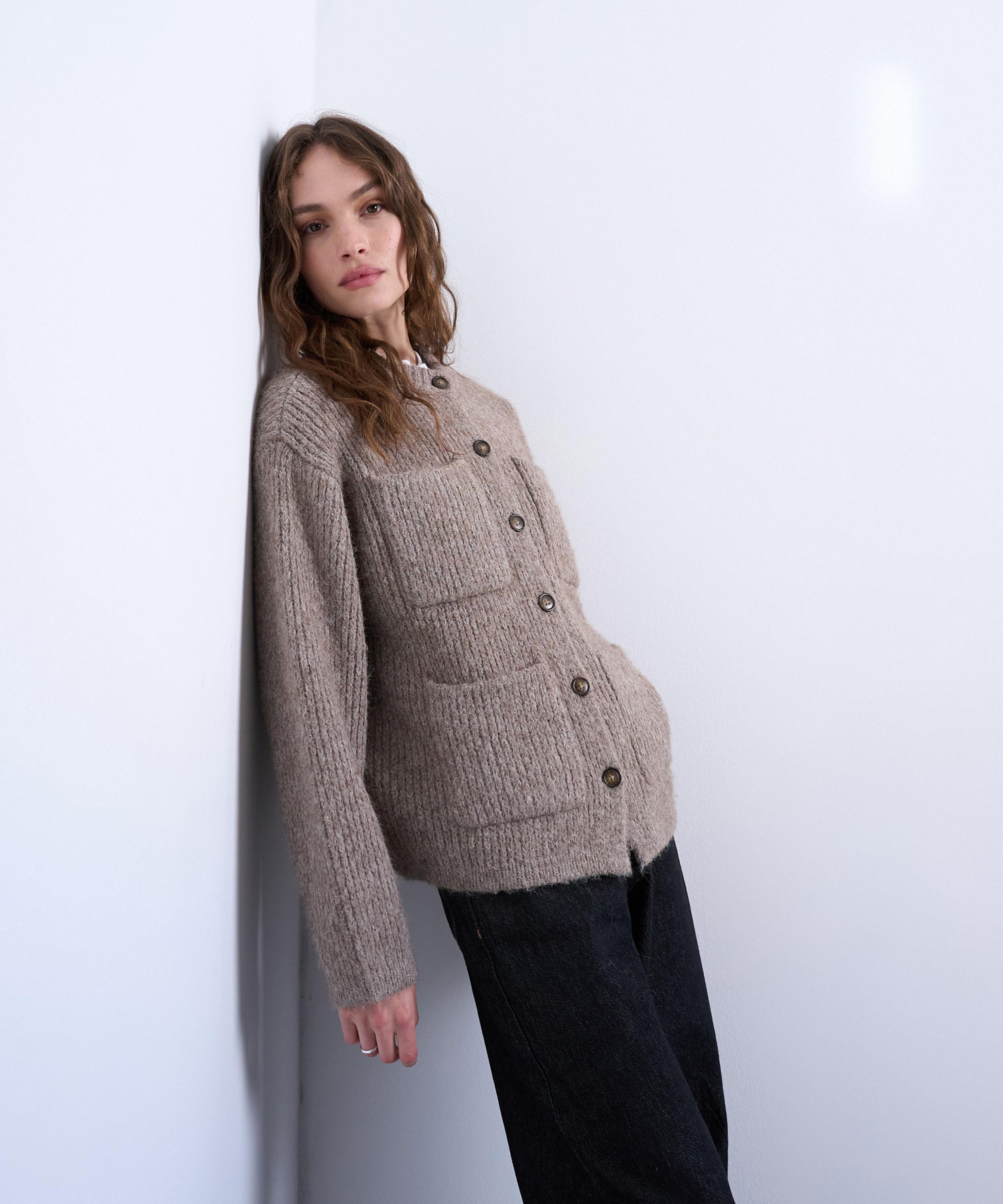 Crafted from a chunky wool-blend rib knit in a soft oat hue, this cosy layer features a relaxed fit, a classic crew neckline, a buttoned front closure, long sleeves, and four patch pockets – making it the perfect winter warmer.
