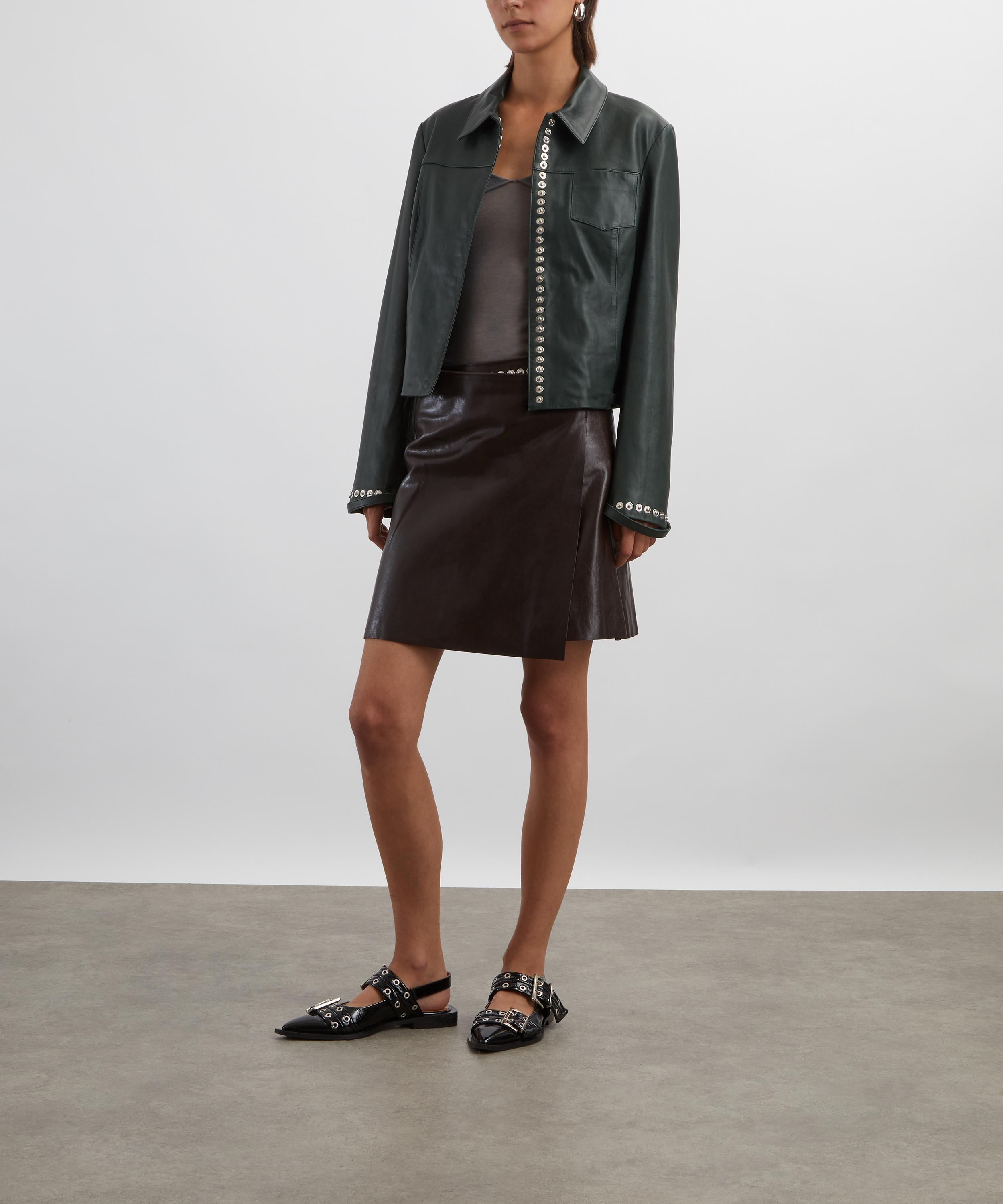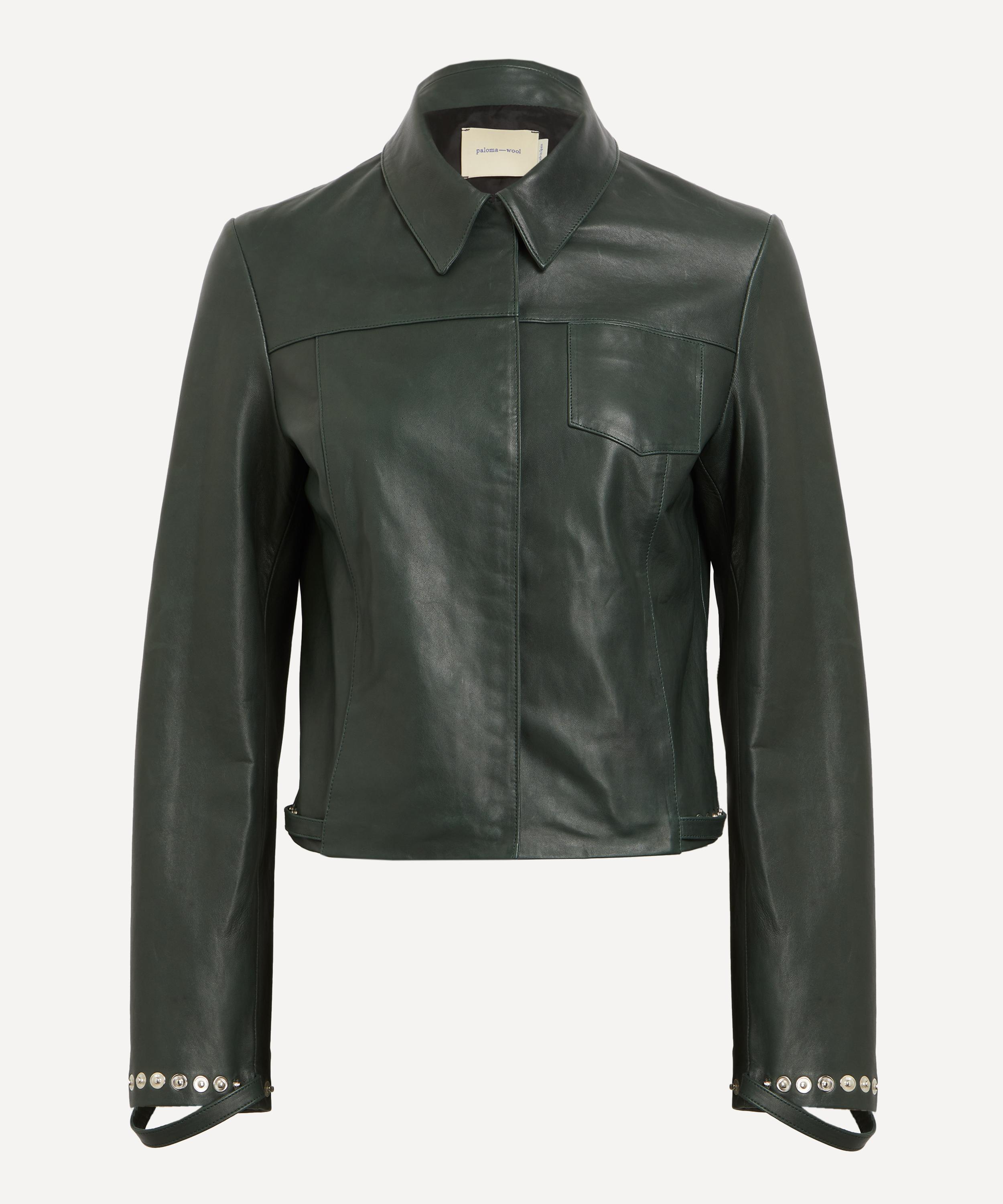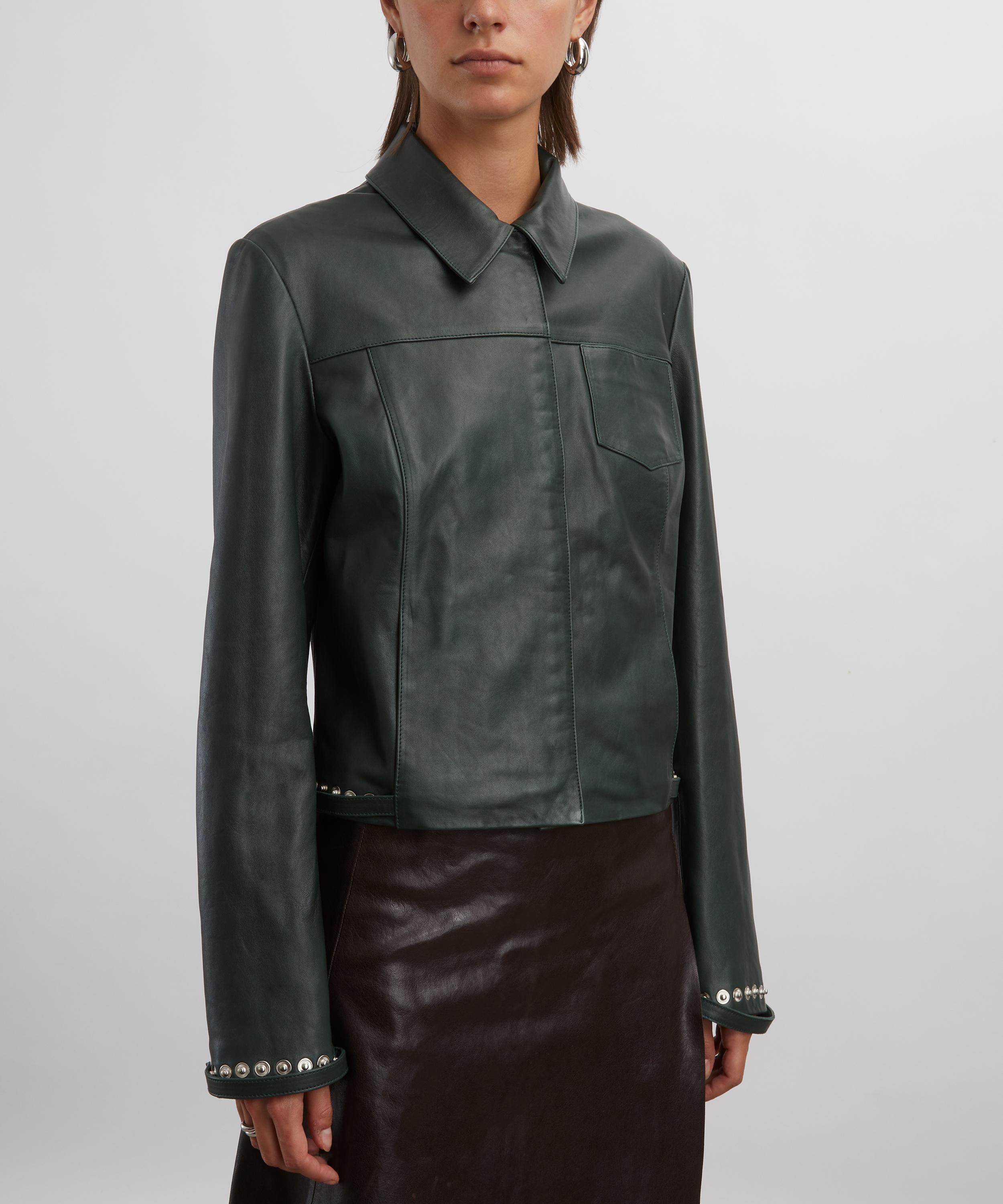 Crafted in Spain from premium dark green leather, the Octavia Jacket features a sleek, fitted silhouette accented by a refined shirt collar. Studded snap detailing along the hem, closure, and cuffs adds a bold, modern edge to this sophisticated design.