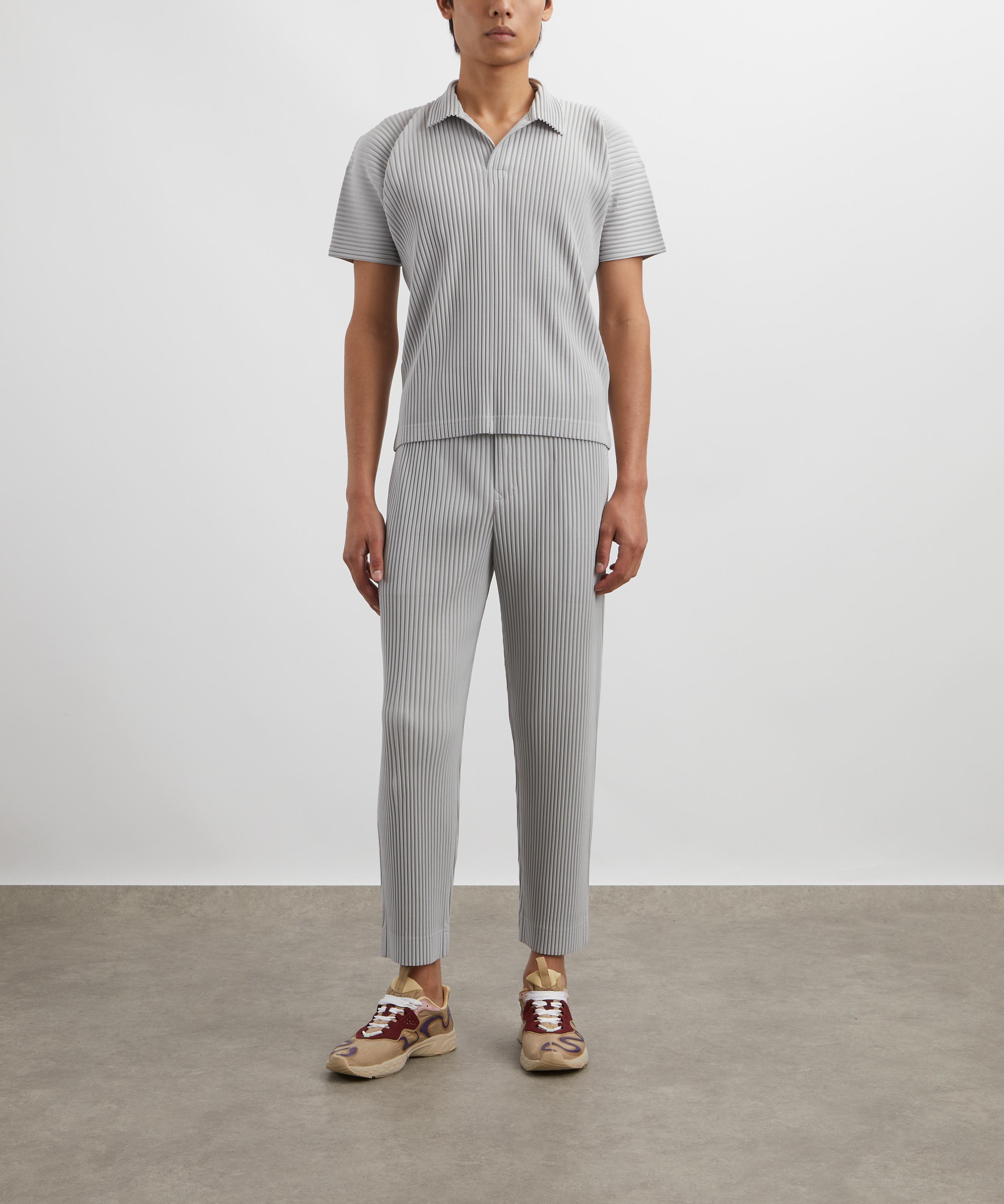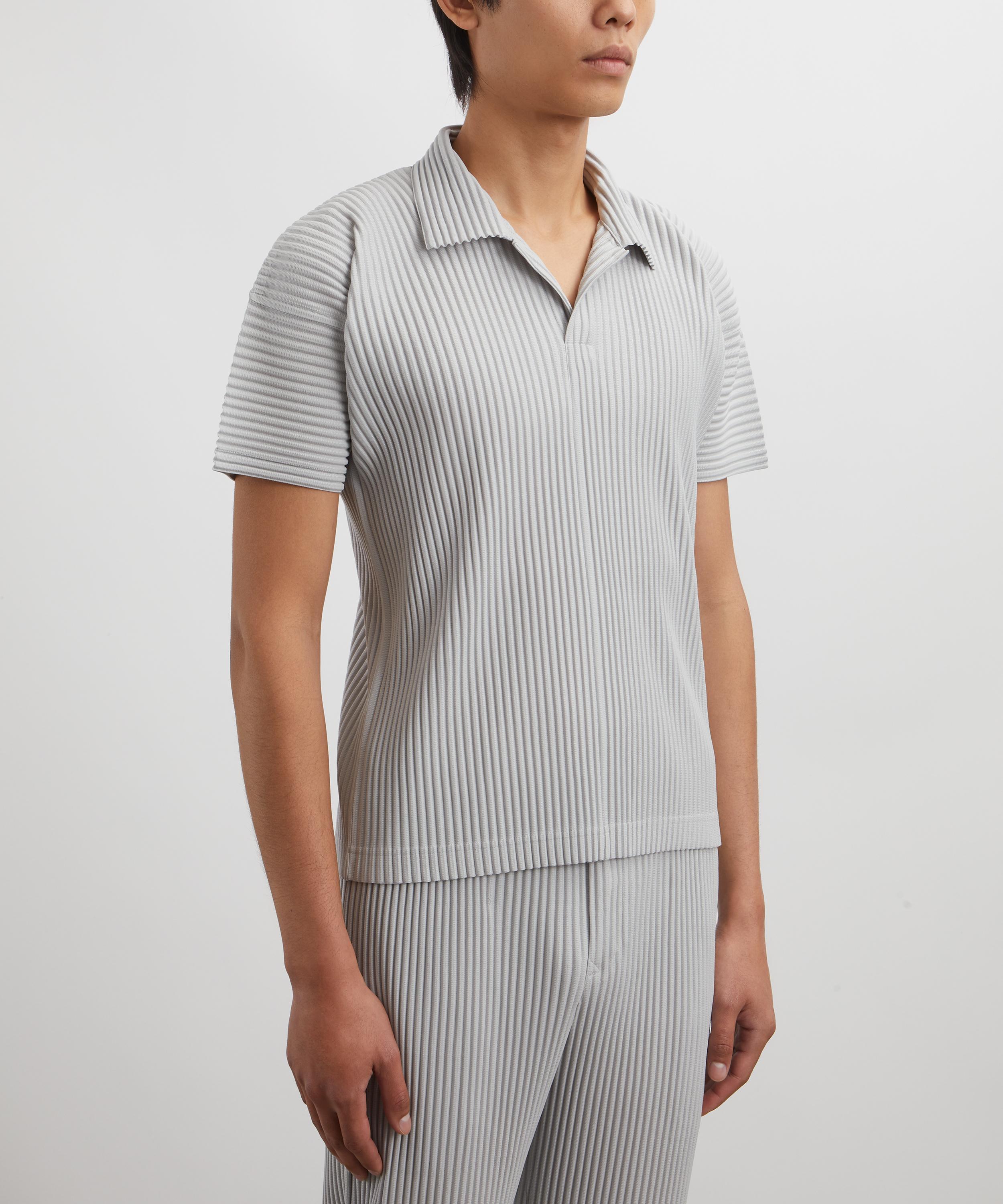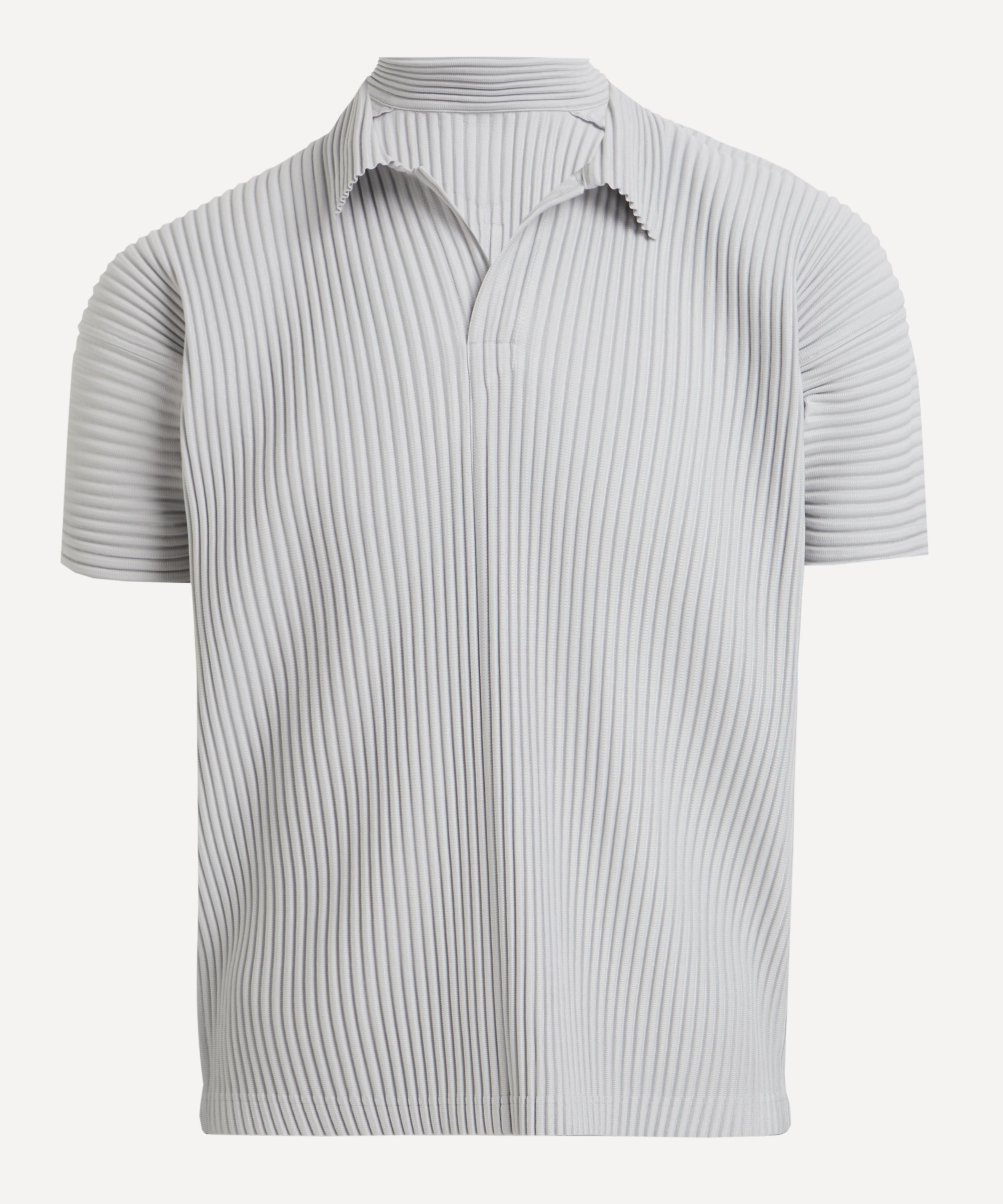 A soft and sculptural take on a wardrobe staple, the shirt is crafted from signature technical-pleated jersey – an innovative technique created by heat-pressing fully constructed garments. It’s shaped with an open polo collar to a streamlined, short-sleeved silhouette that’s ideal for standout matching with a pair of HOMME PLISSÉ’s trousers