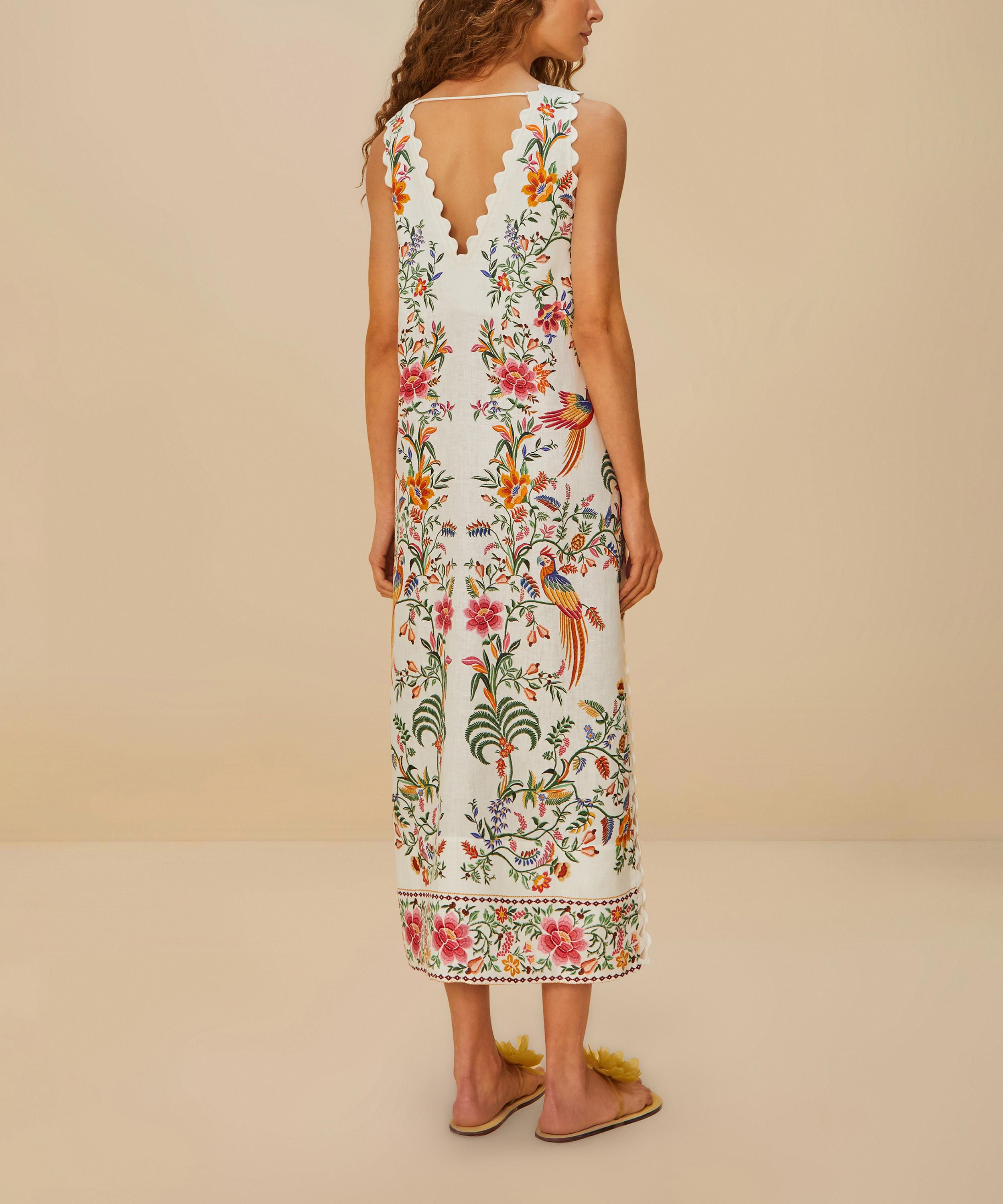 Embrace the enchanting allure of the Off-White Delicate Forest Linen Maxi Dress. Crafted from linen, it features a vibrant botanical print with colourful flora and avian motifs, scalloped detailing at the V-neckline, and a breezy silhouette for effortless elegance.