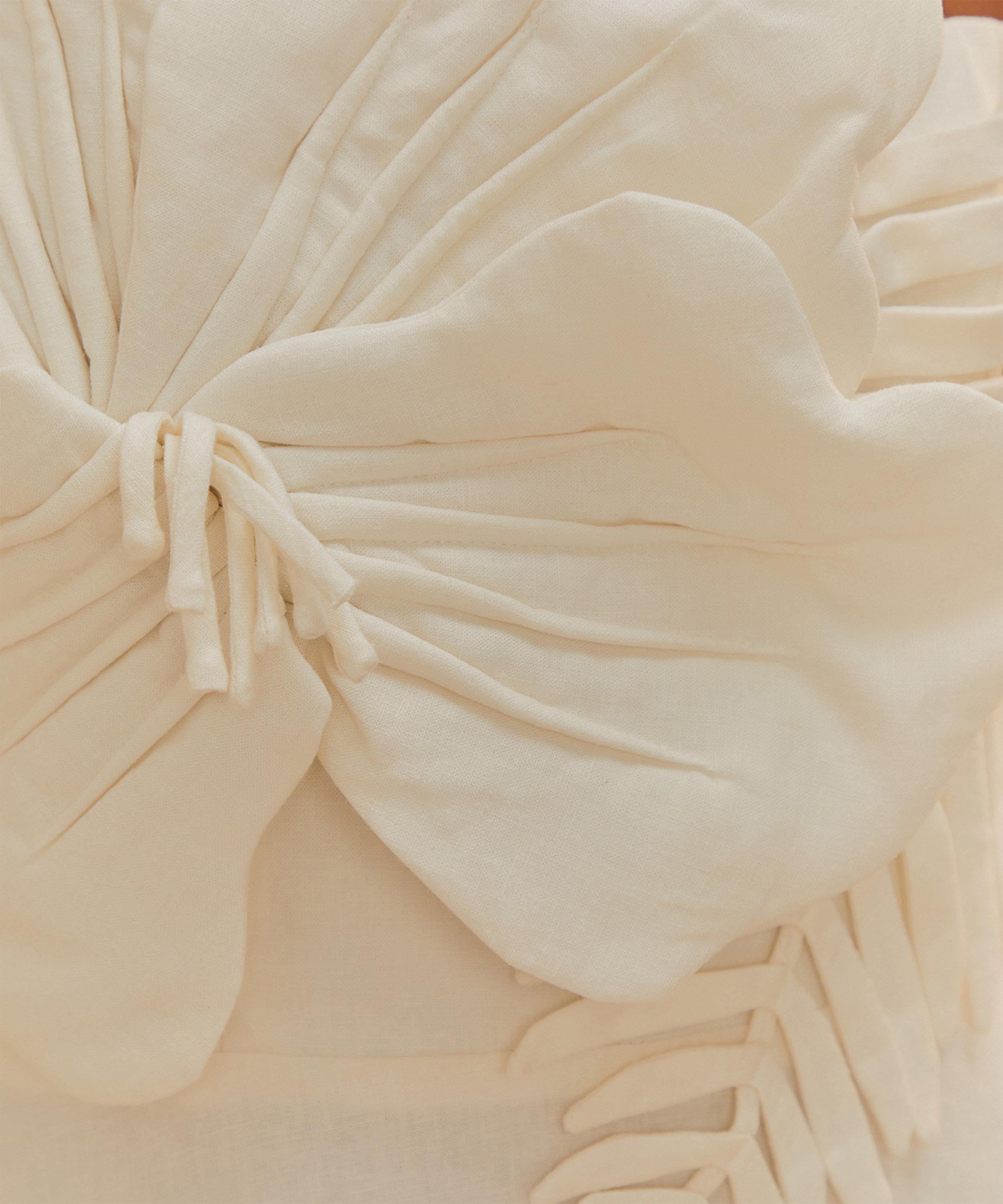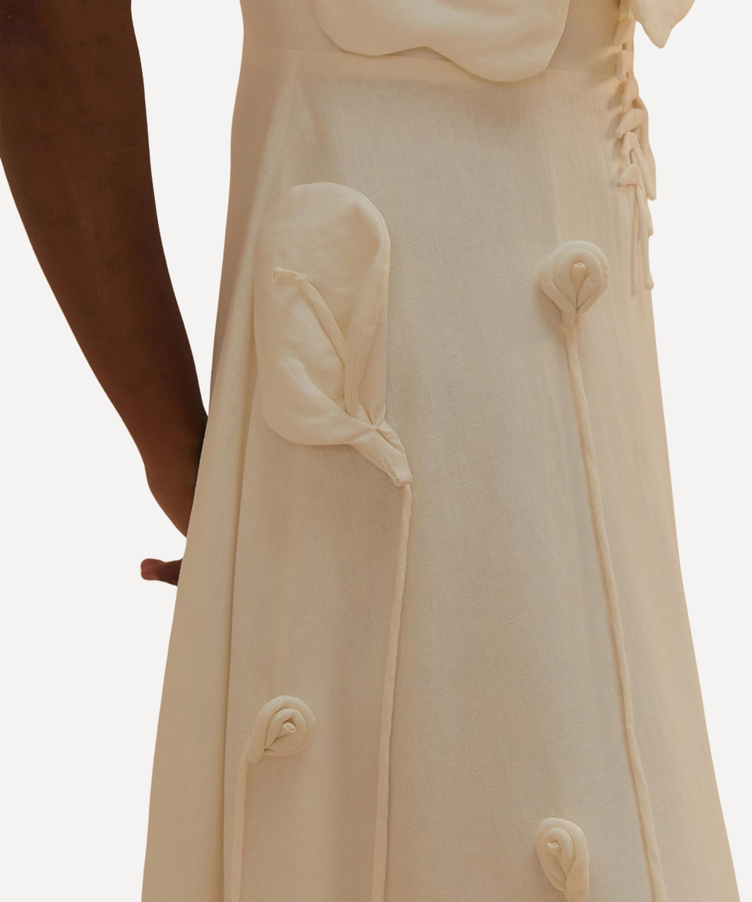 Discover elegance with the Off-White Garden Midi Dress, featuring an asymmetrical neckline adorned with delicate floral appliqués. Crafted from LENZING™ ECOVERO™ Euroflax™, this graceful piece captures the whimsy and beauty of a serene garden.