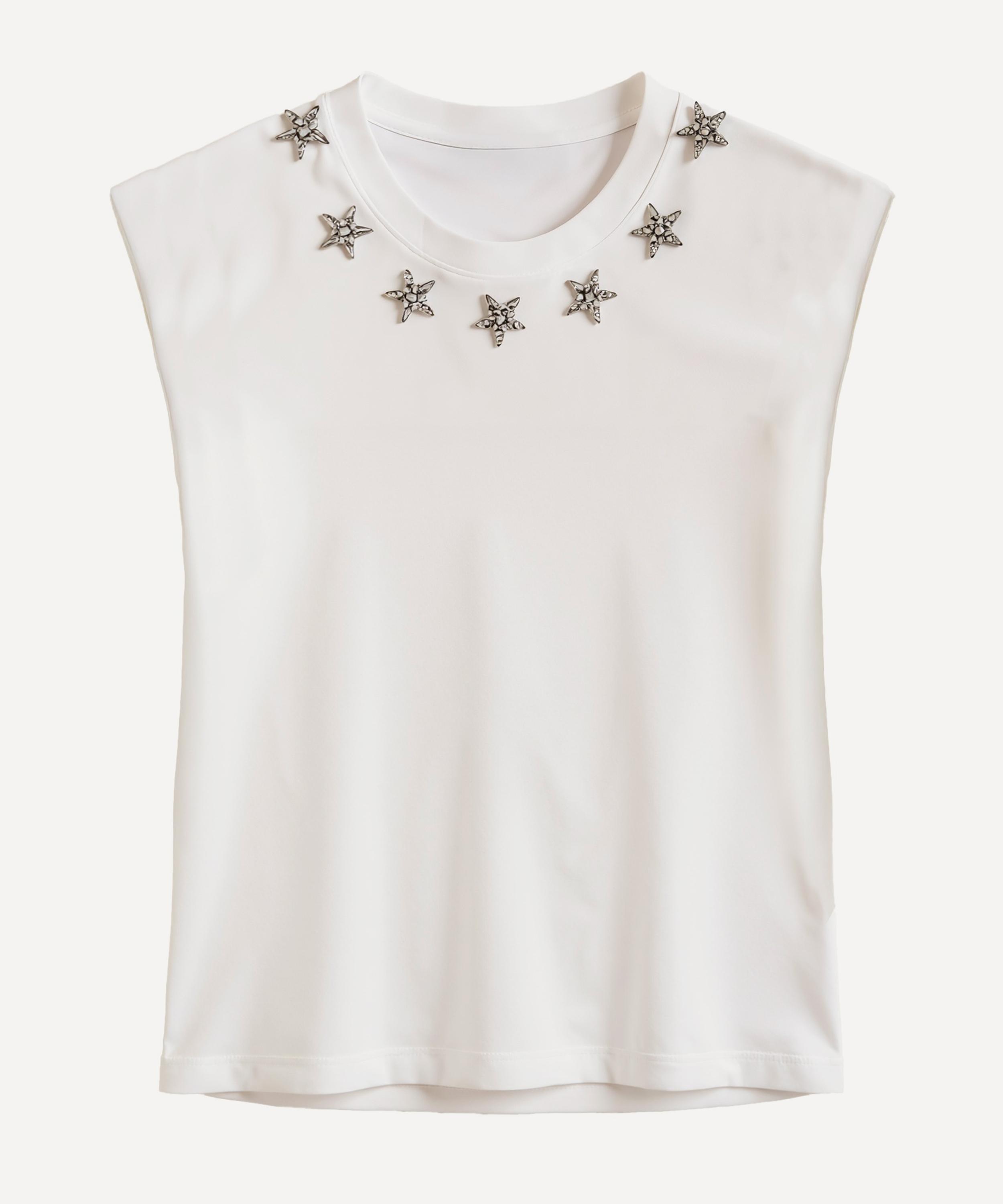 Elevate your everyday style with this off-white t-shirt, featuring a round neckline and bold padded shoulders for a confident silhouette. Sparkling star-shaped embroidery adds playful charm, while soft, cozy fabric blends minimalism with standout detail - perfect for radiant, spirited adventures.