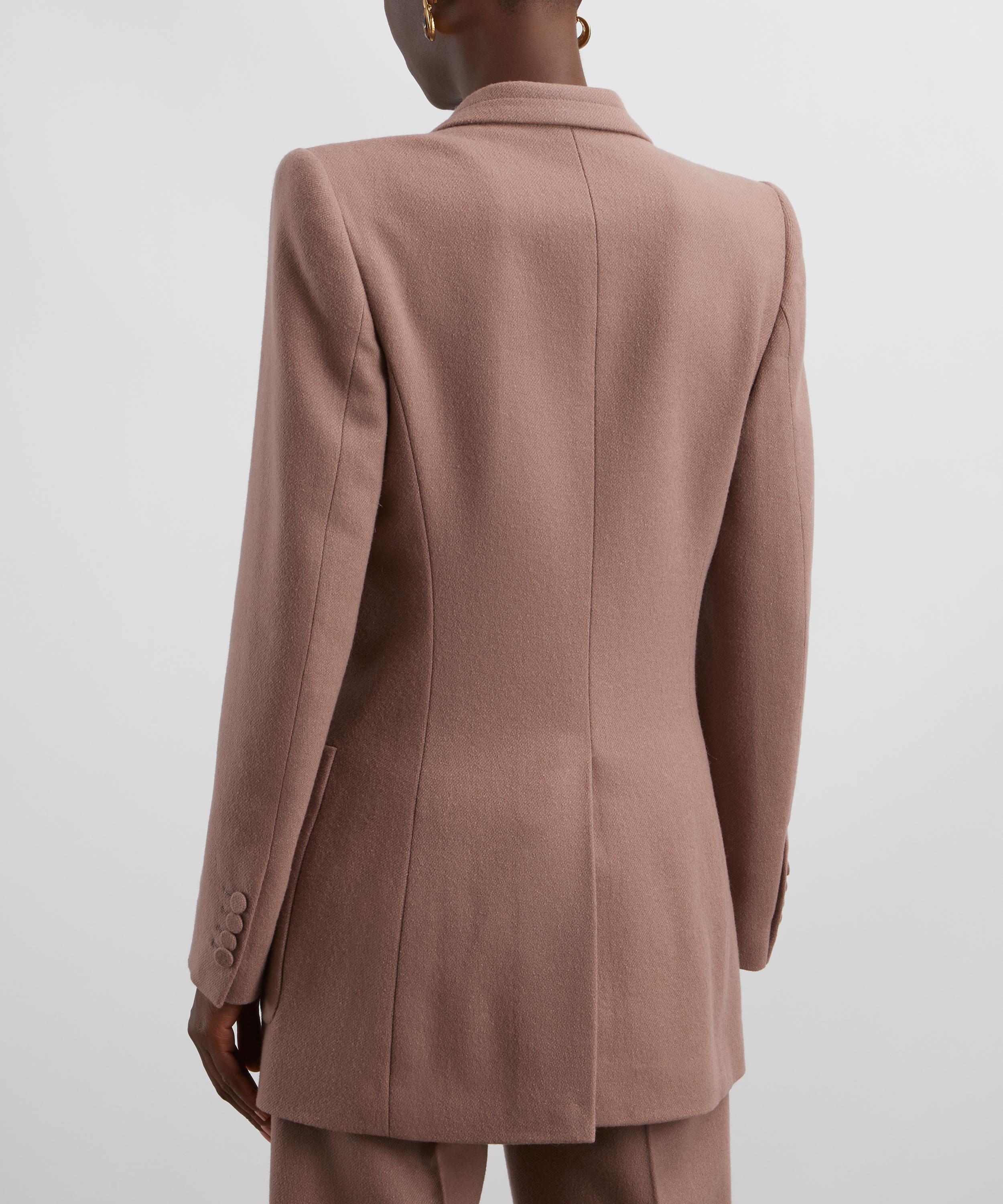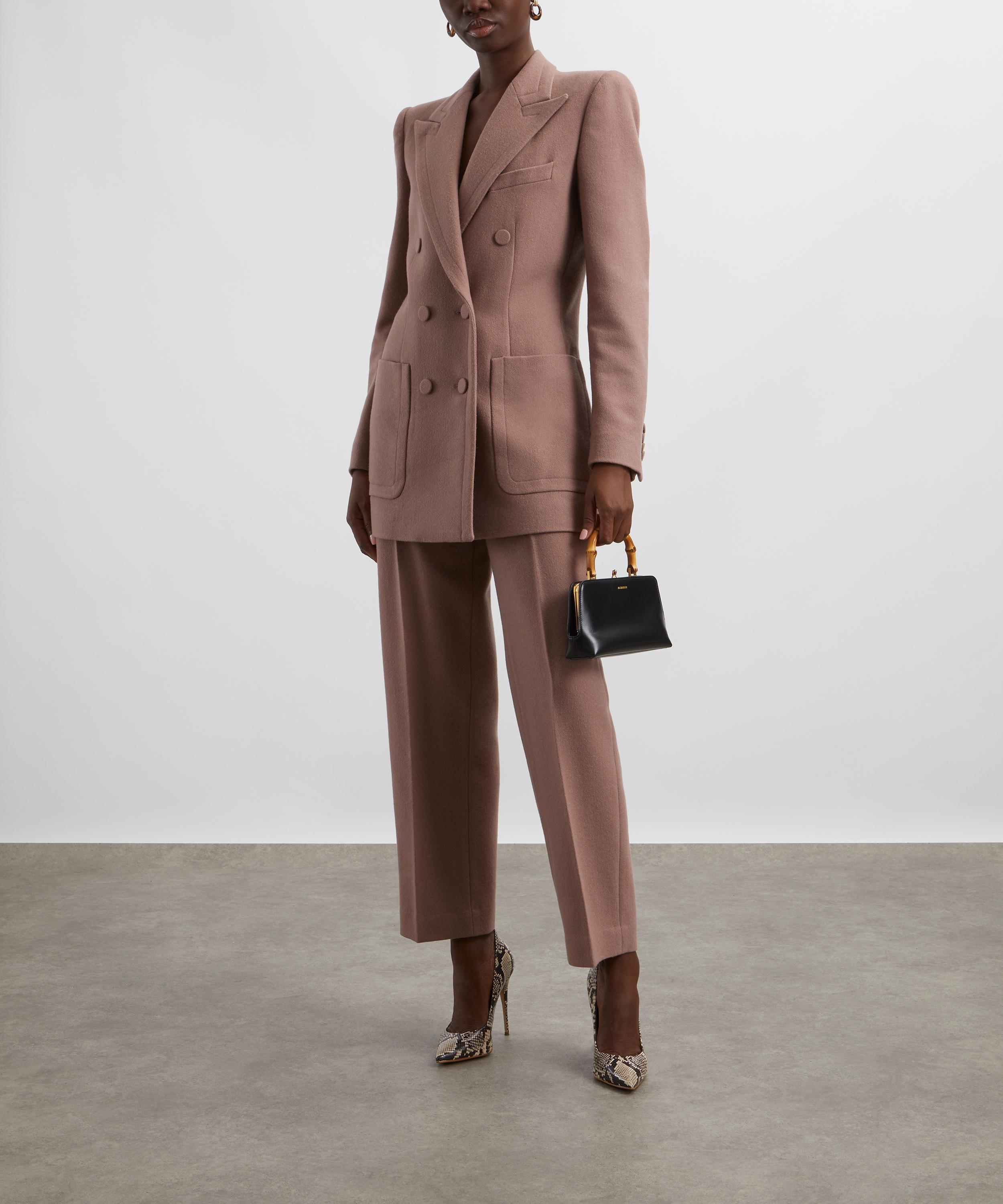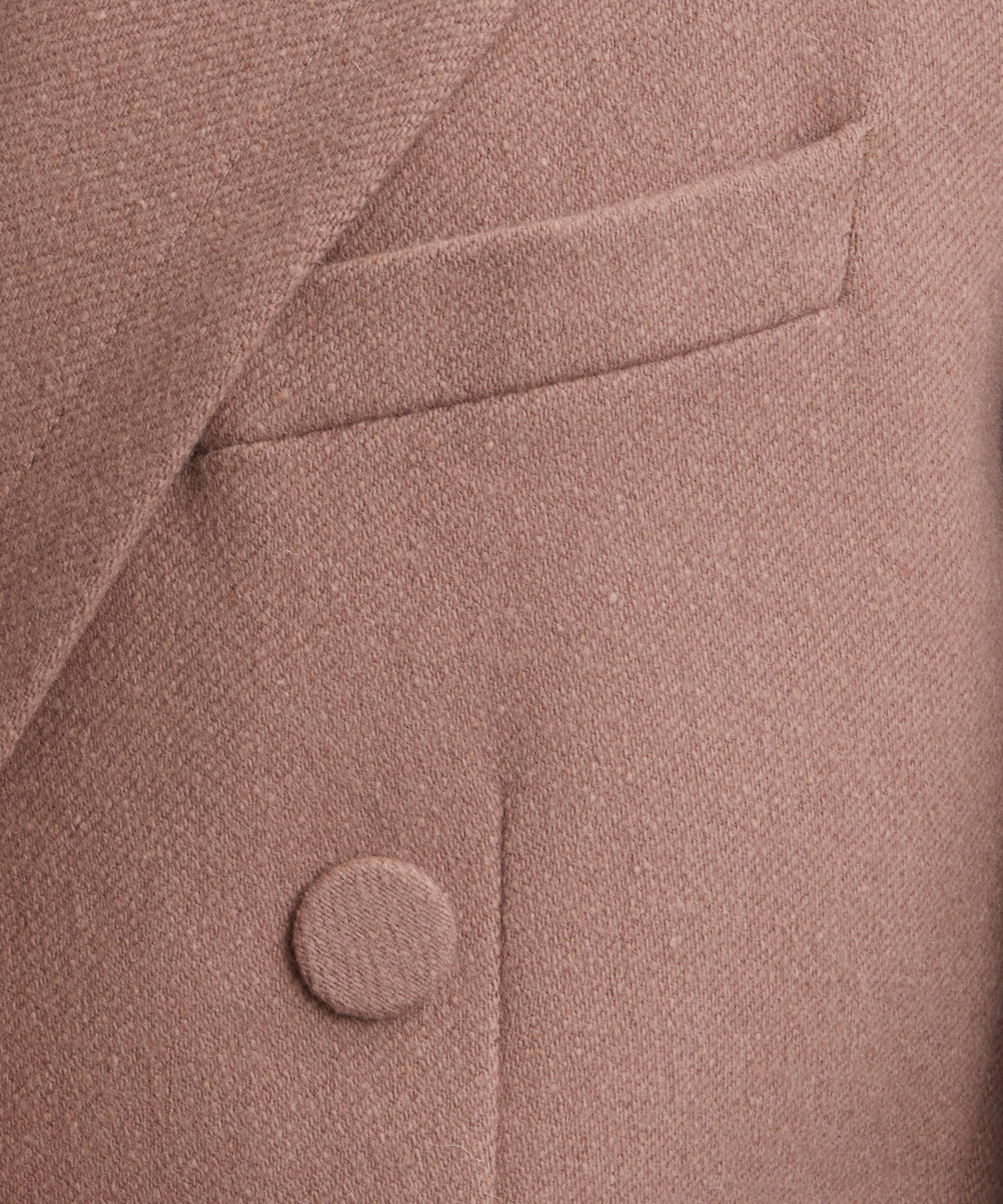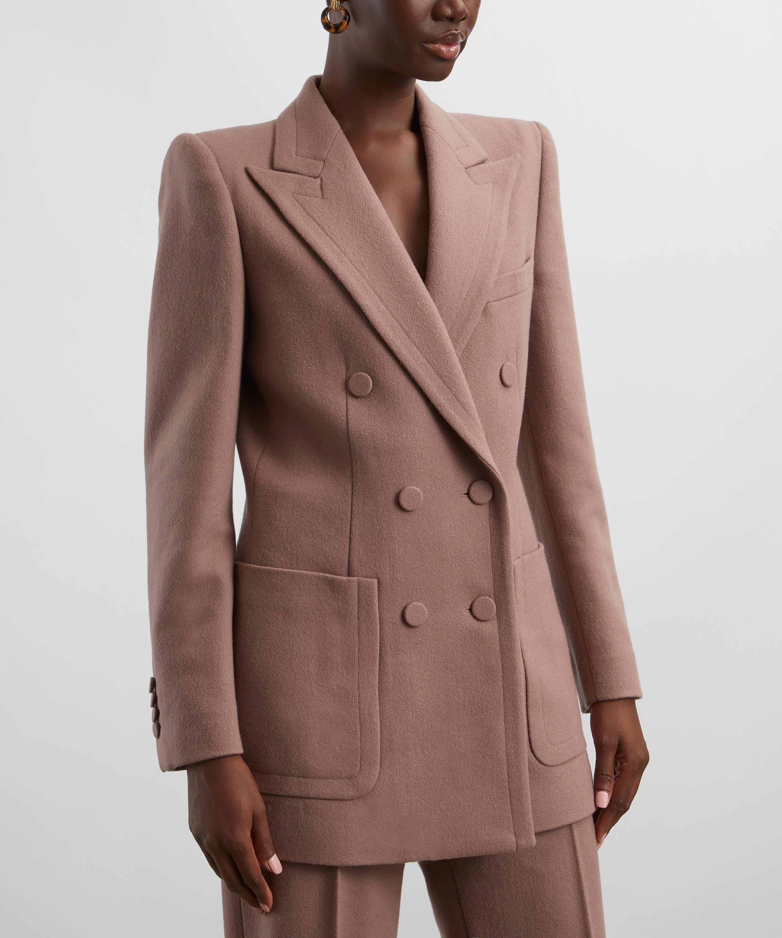 This premium wool blazer beautifully merges elegance with a contemporary edge, highlighted by its striking pink hue. With an oversized, boxy fit, structured shoulders, peak lapels, and two large patch pockets, the double-breasted front is secured with buttons for a polished finish.