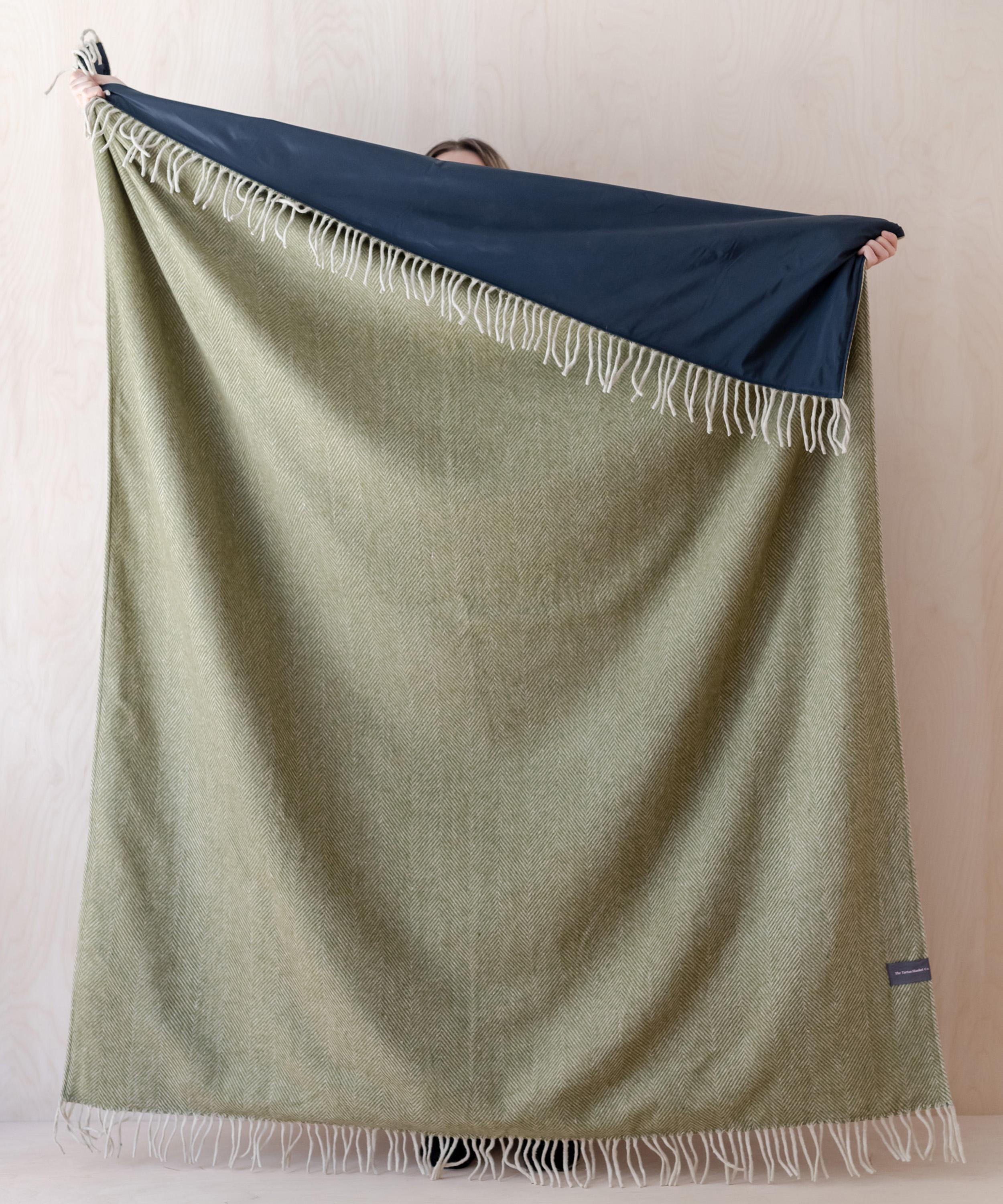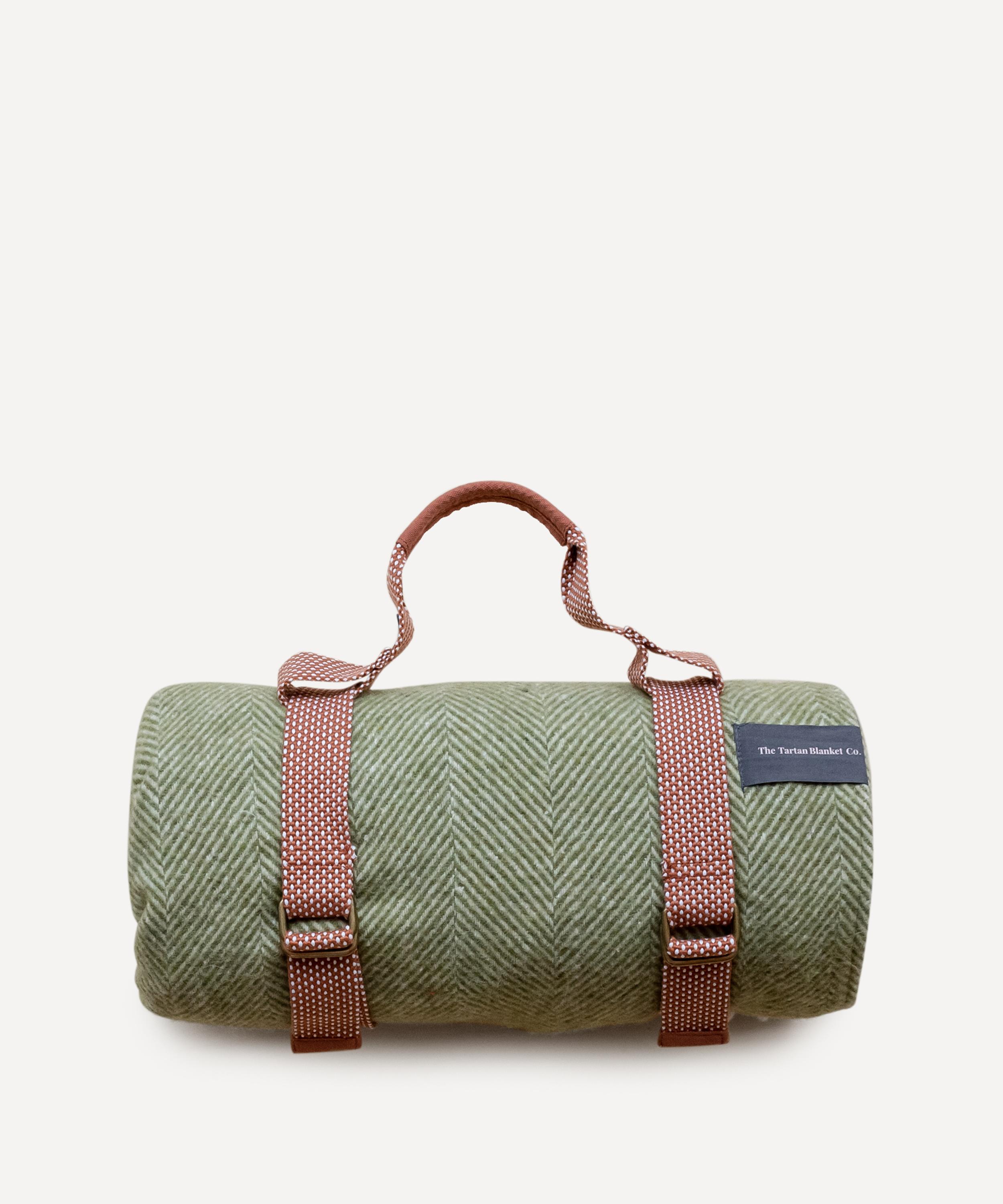 The Tartan Blanket Co.’s recycled wool picnic blanket in olive herringbone is the ideal base for an alfresco feast.