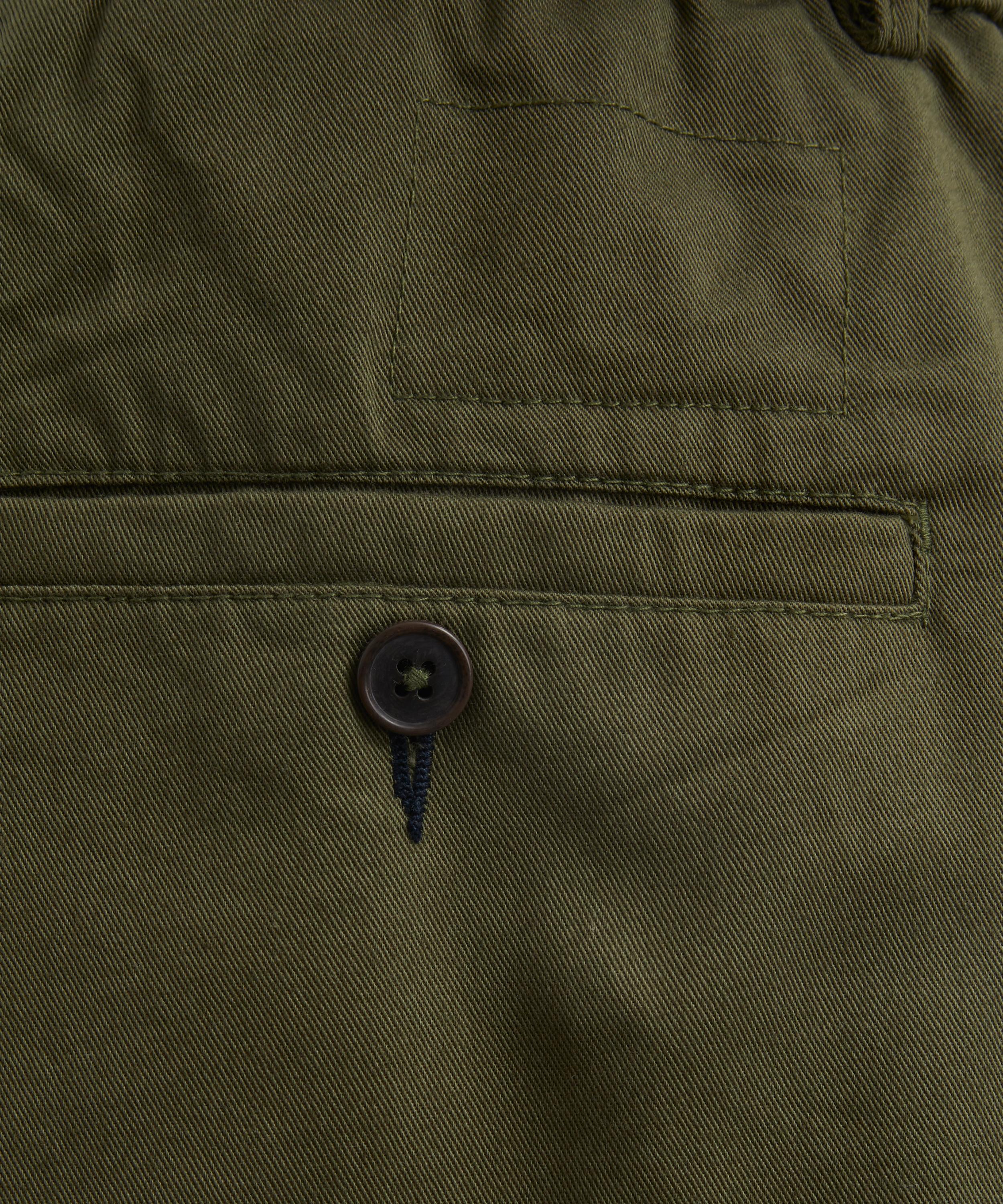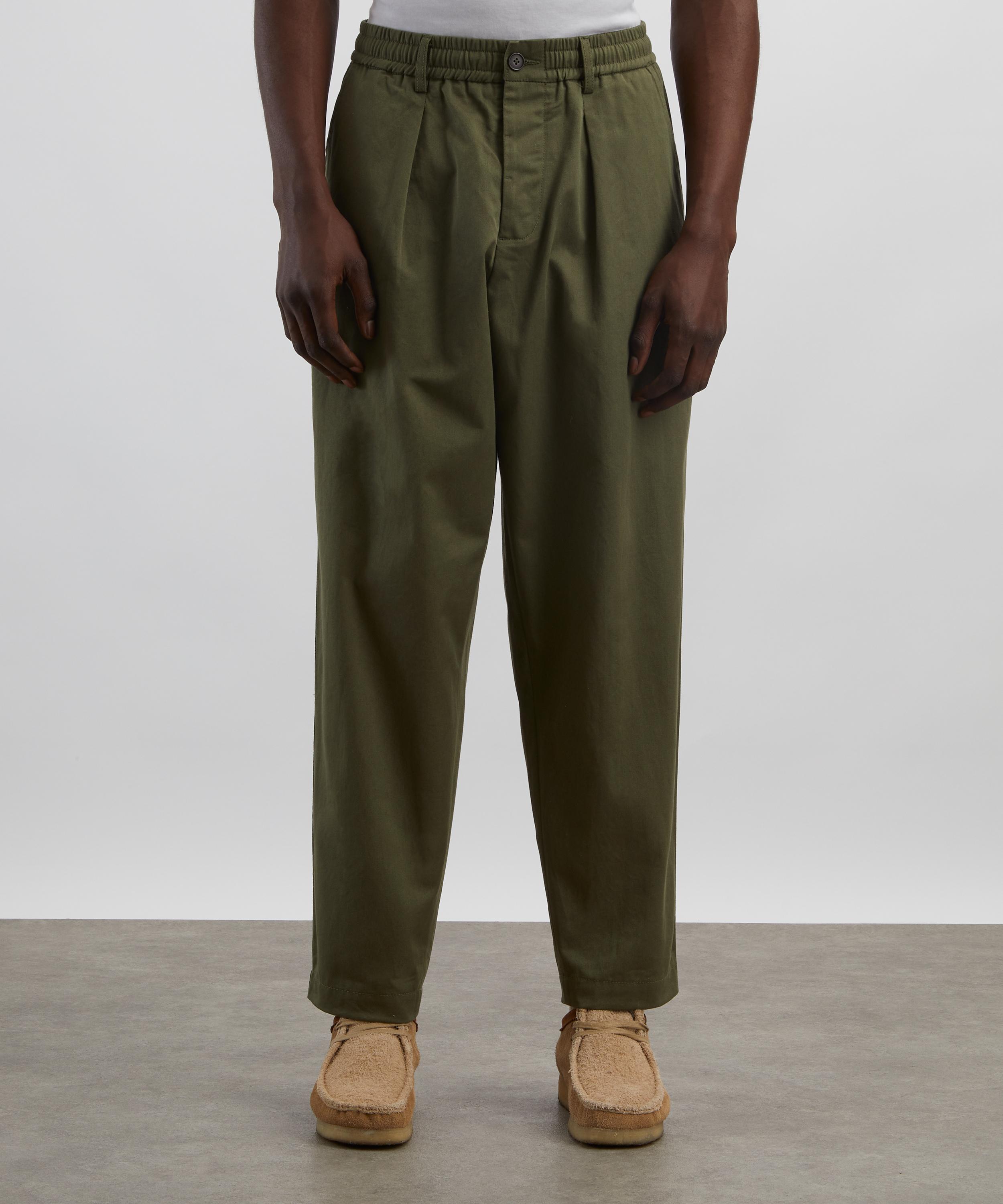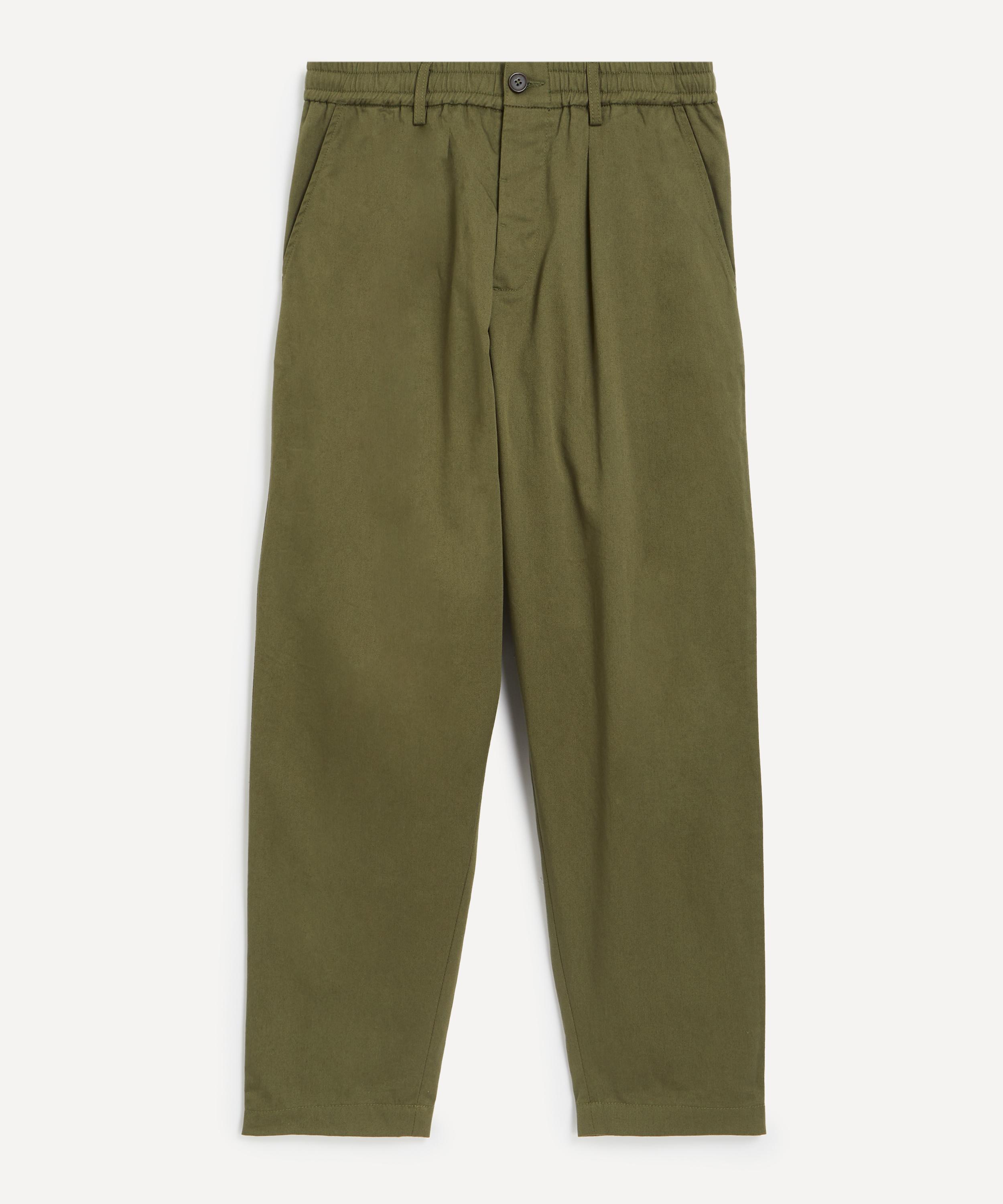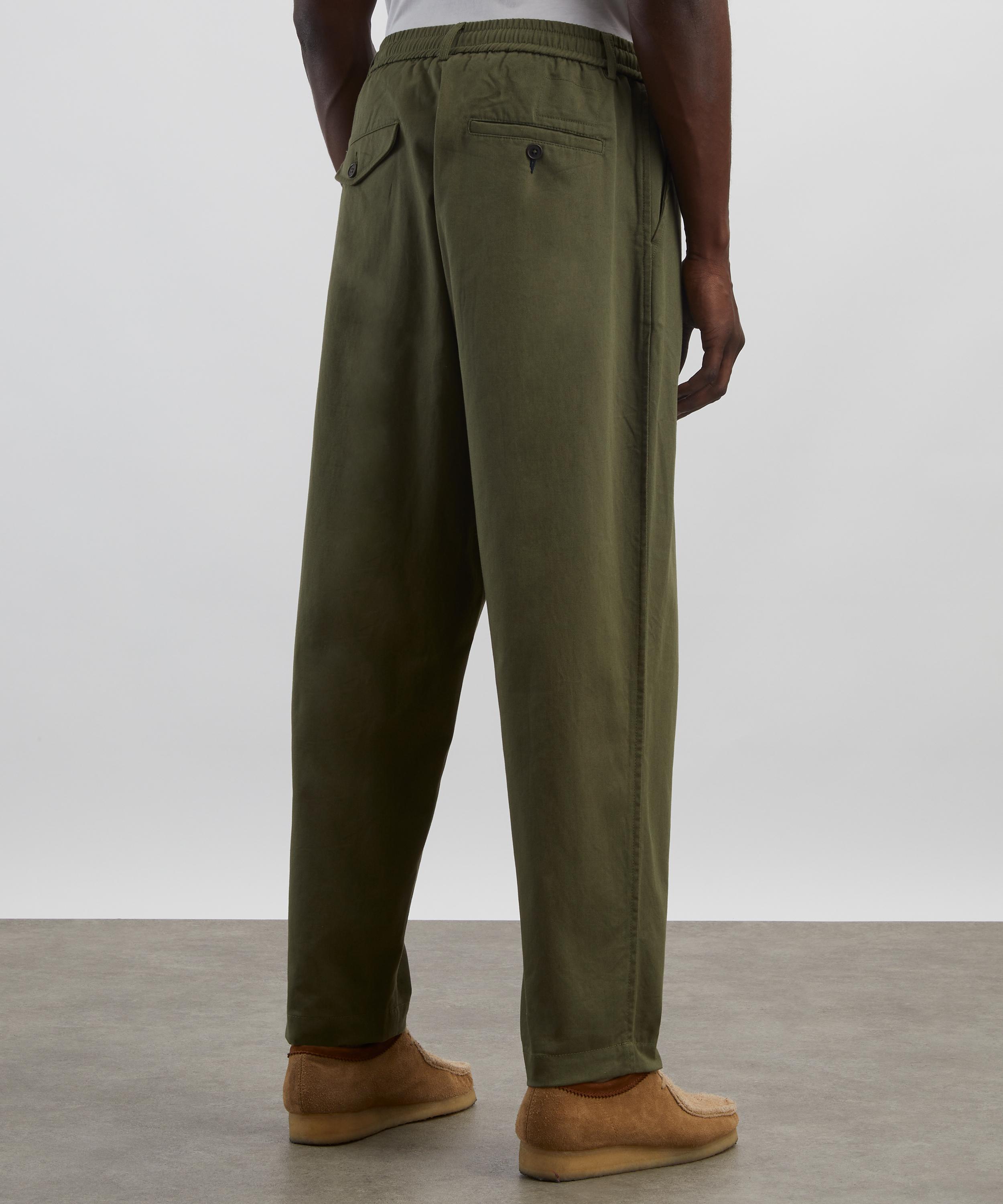 Crafted from a durable cotton-blend polytech fabric in an earthy khaki green, these pleated trousers blend utilitarian ease with subtle sophistication. The loose, tapered silhouette and slight cropped length lend a modern edge, while the elasticated drawstring waist ensures a flexible, comfortable fit. A single front pleat introduces just the right hint of structure for a polished yet laid-back aesthetic.