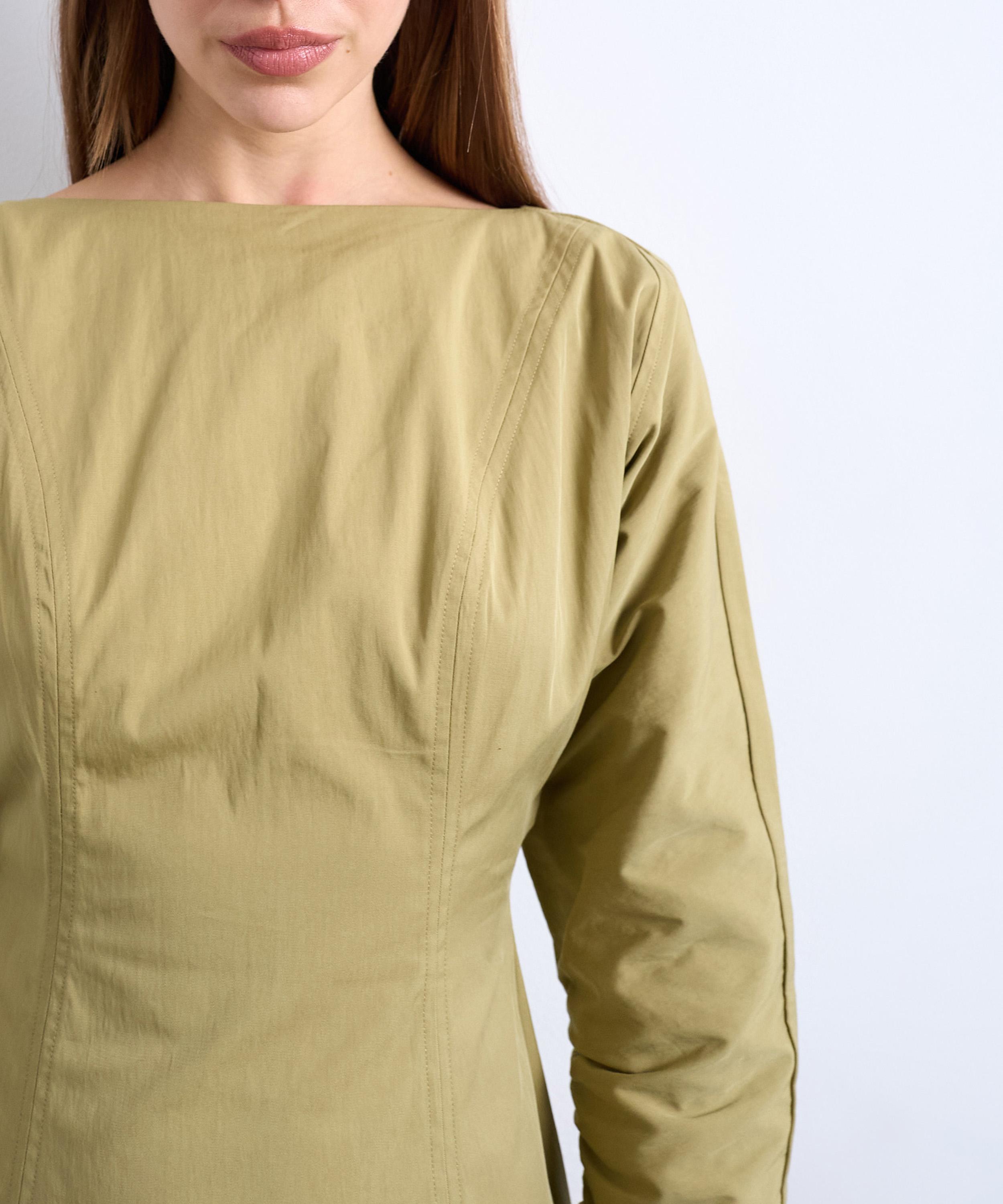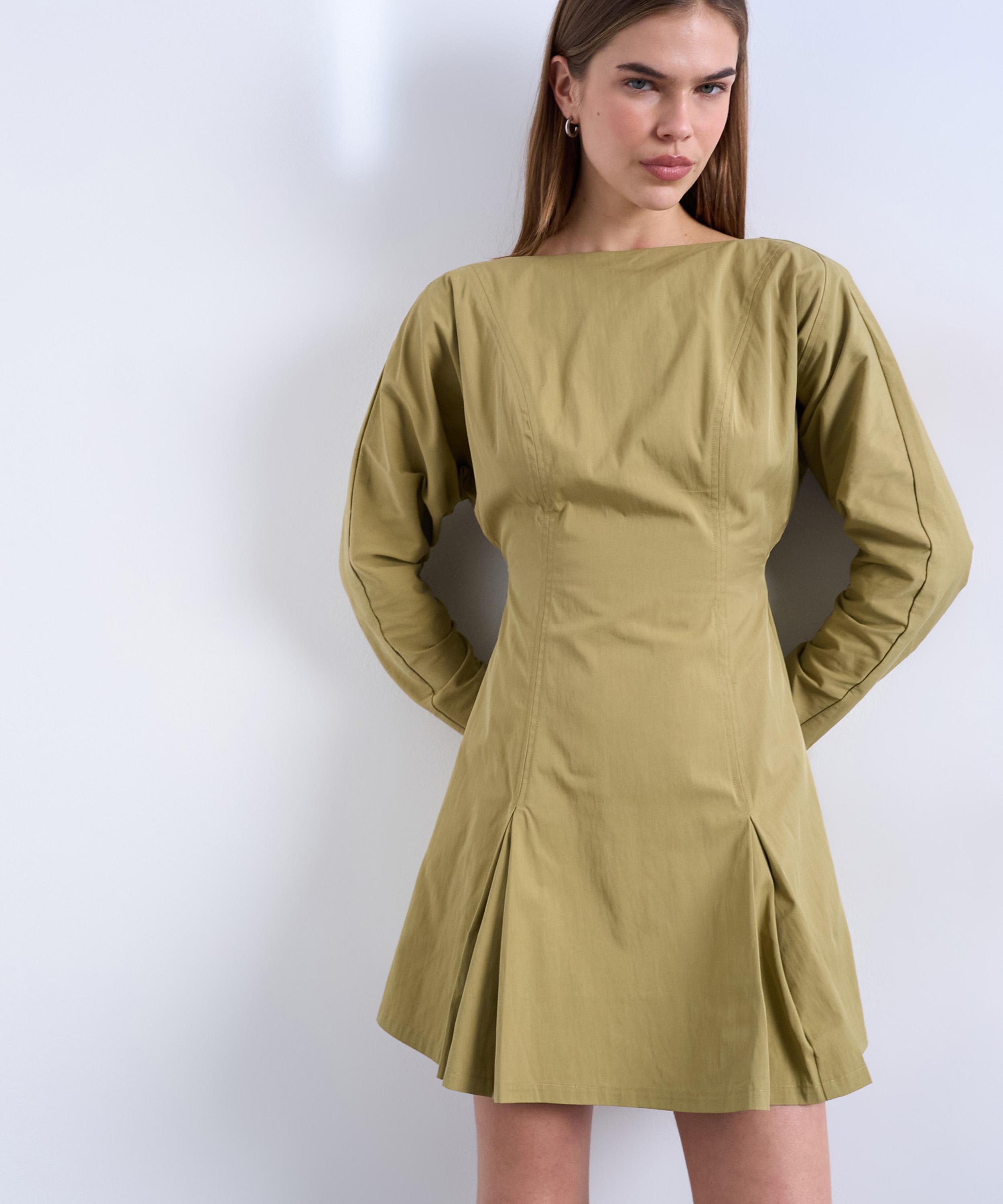 Softly structured, this olive mini dress features a slash neckline, long sleeves, and a cinched waist that falls into a flared, pleated hem, creating an elegant A-line silhouette.