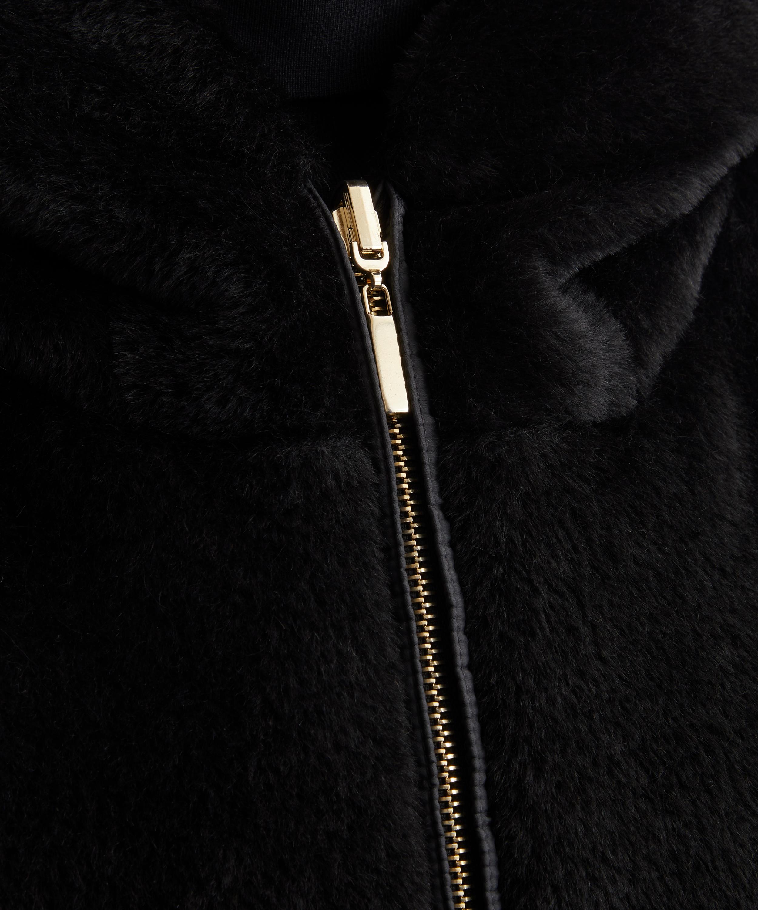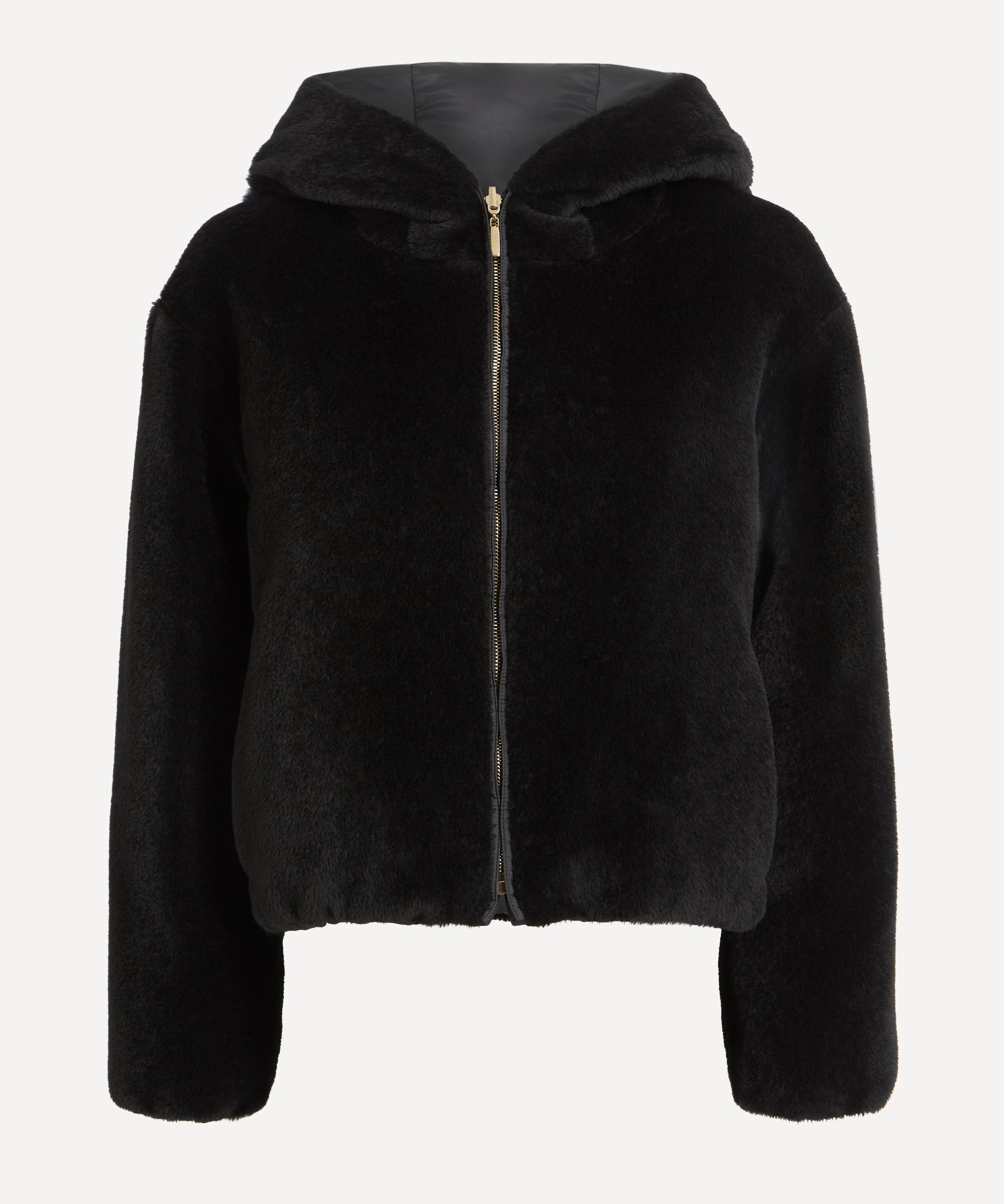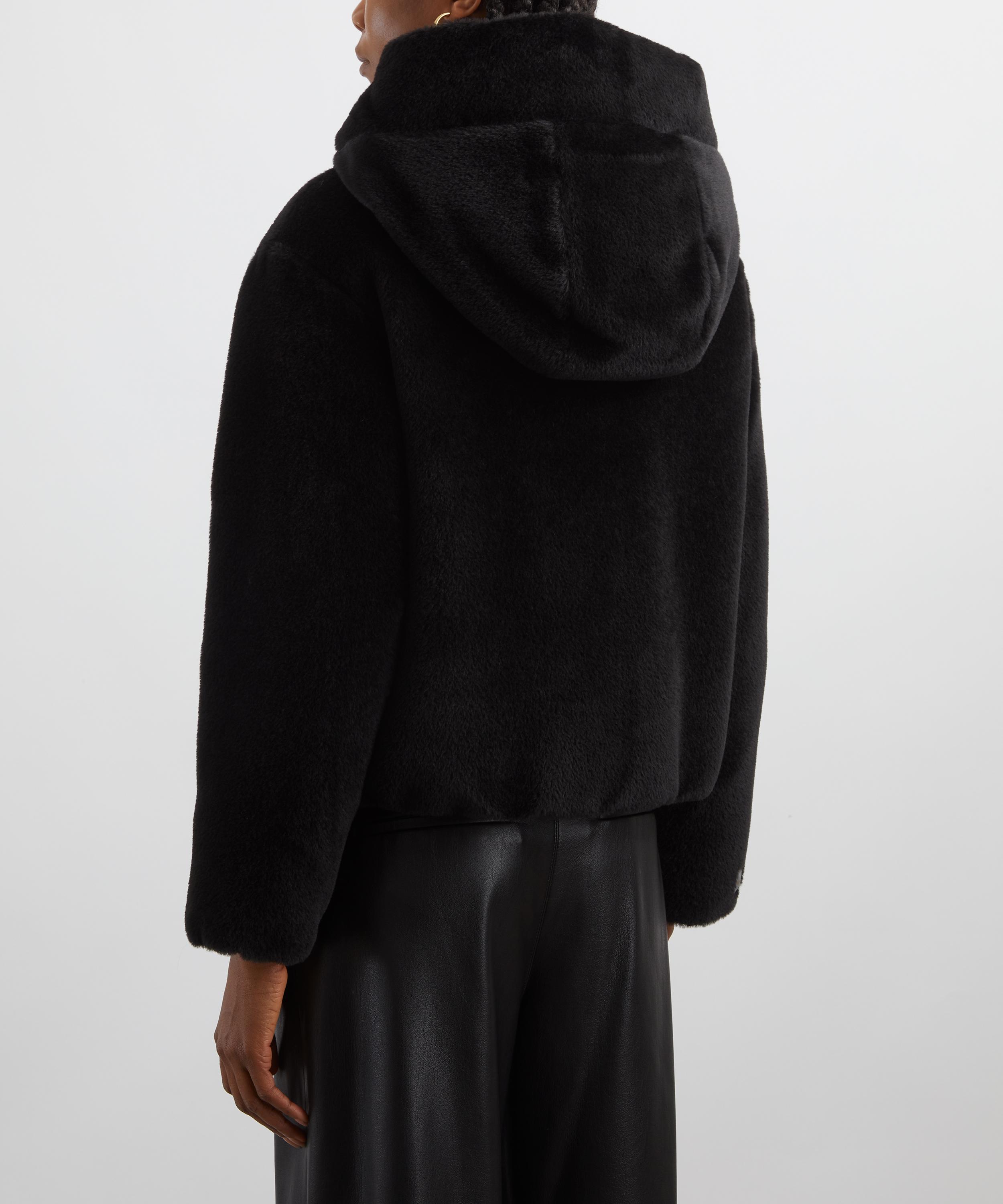 This short, padded, and reversible jacket combines standout style with practical design. Crafted from an alpaca-wool fabric with a faux-fur effect on one side and a water-repellent quilted canvas on the other, it features goose-down padding, dropped shoulders, long sleeves, a hood, and a zip closure for warmth and versatility.