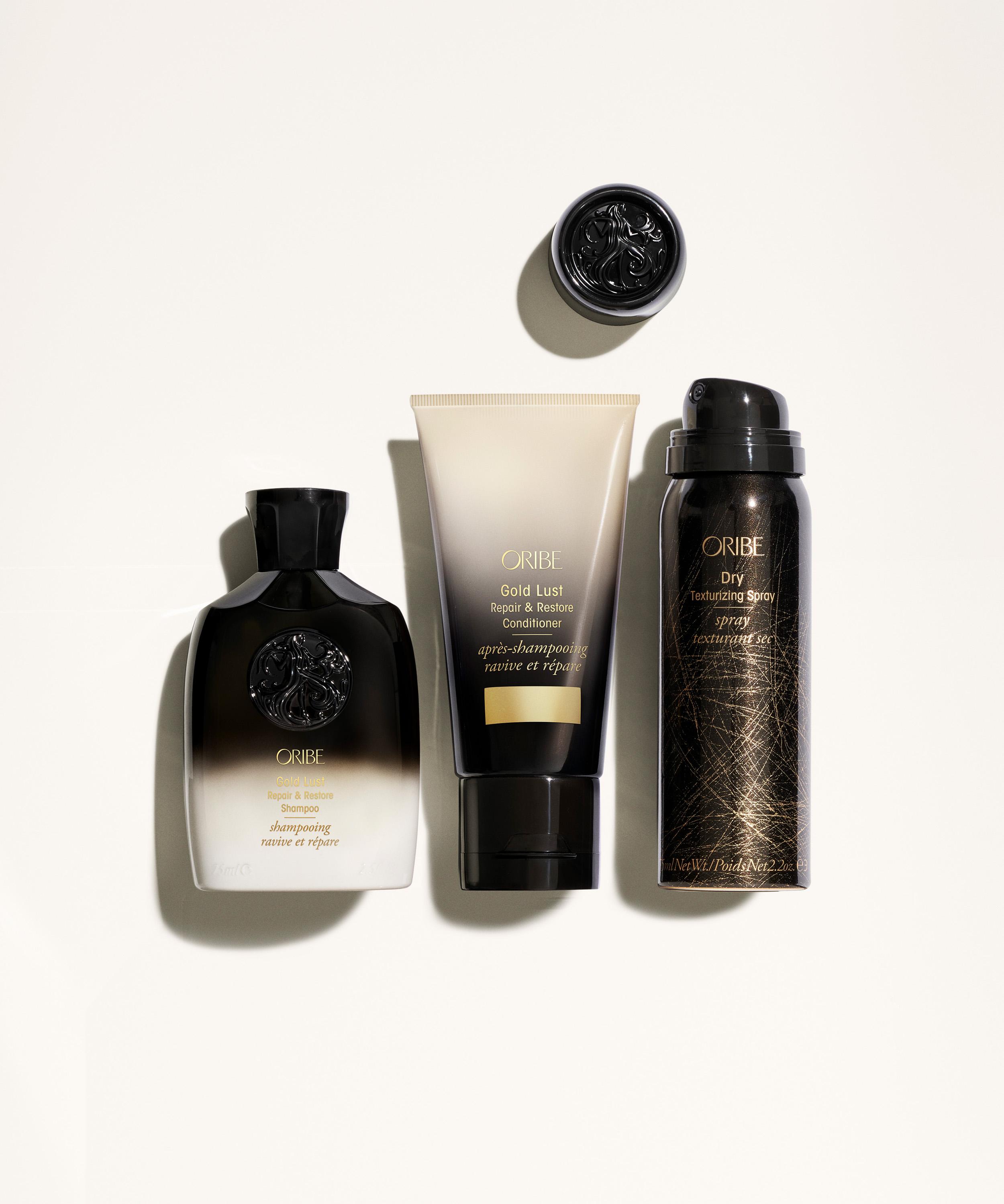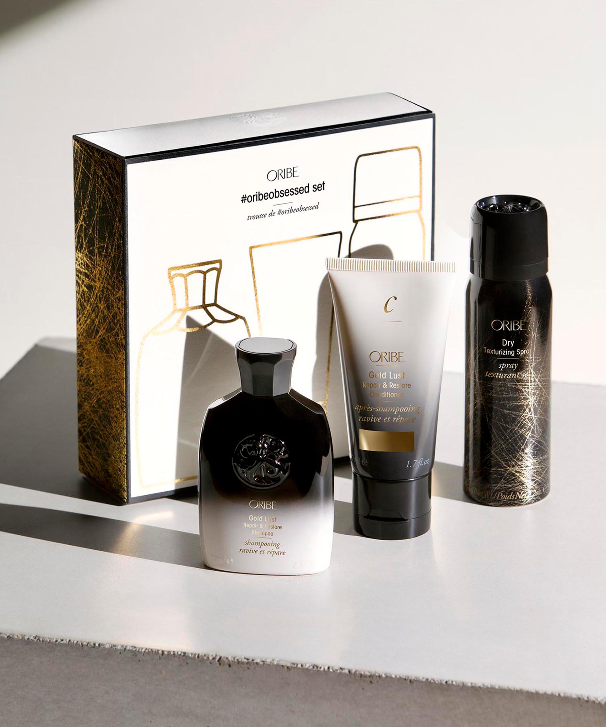 - #oribeobsessed Set includes: Gold Lust Repair and Restore Shampoo 75ml, Gold Lust Repair and Restore Conditioner 50ml and Dry Texturising Spray 61g