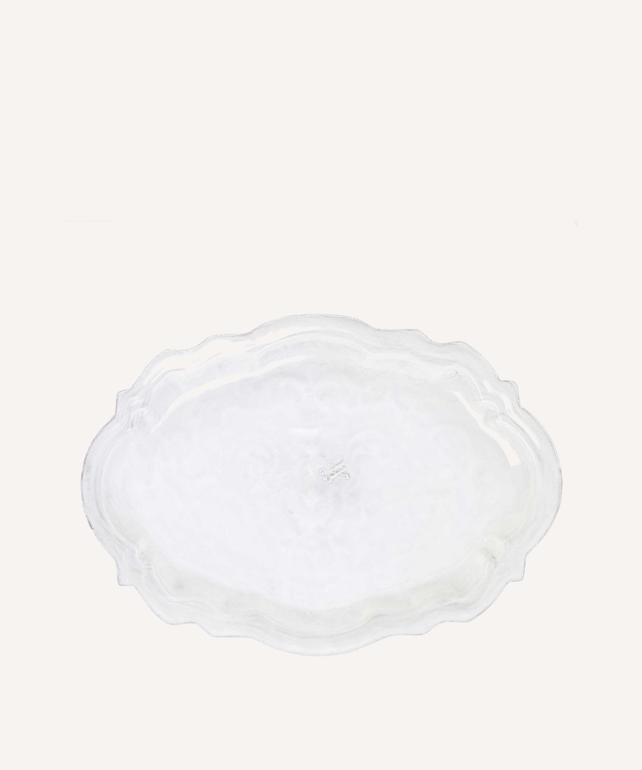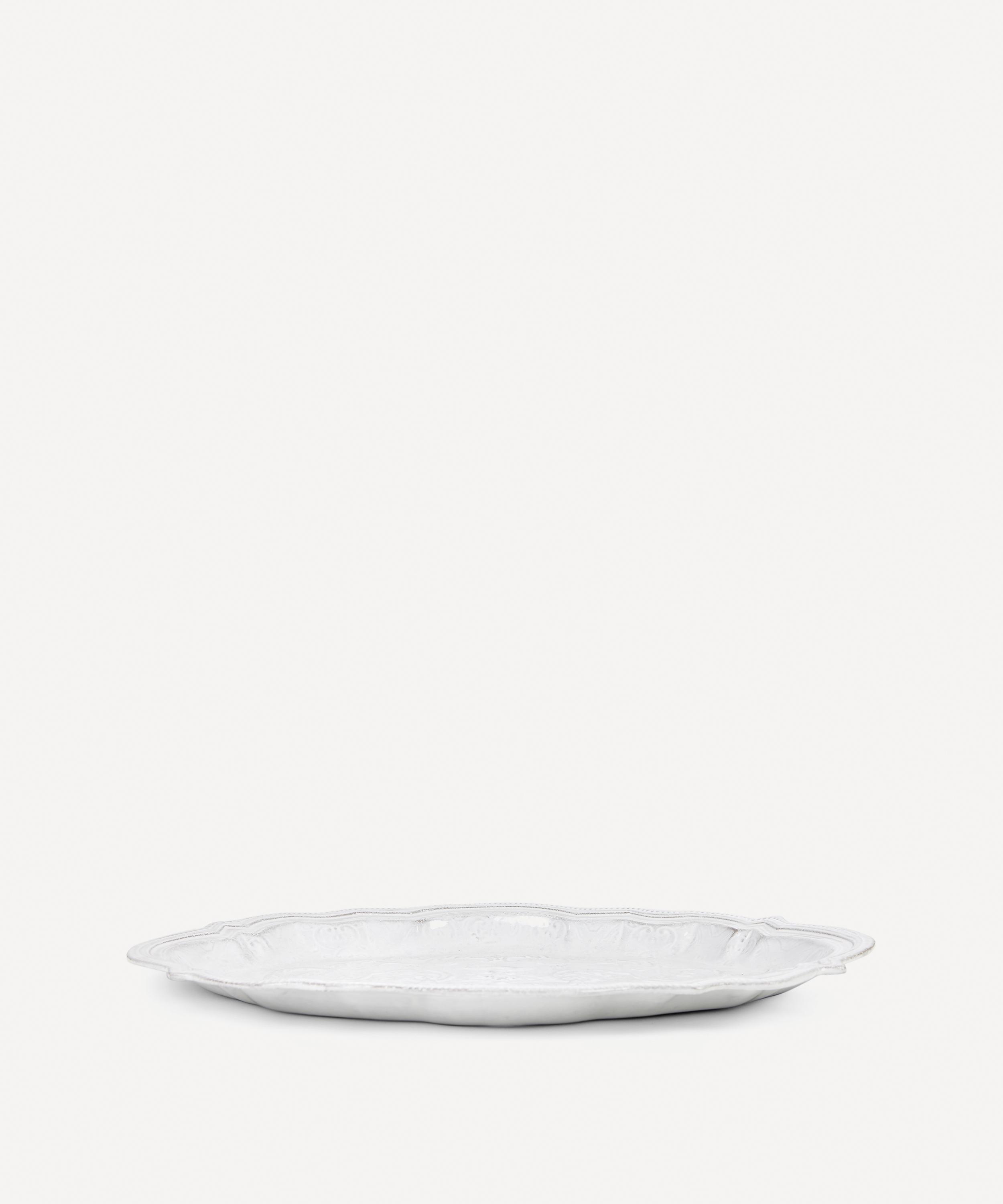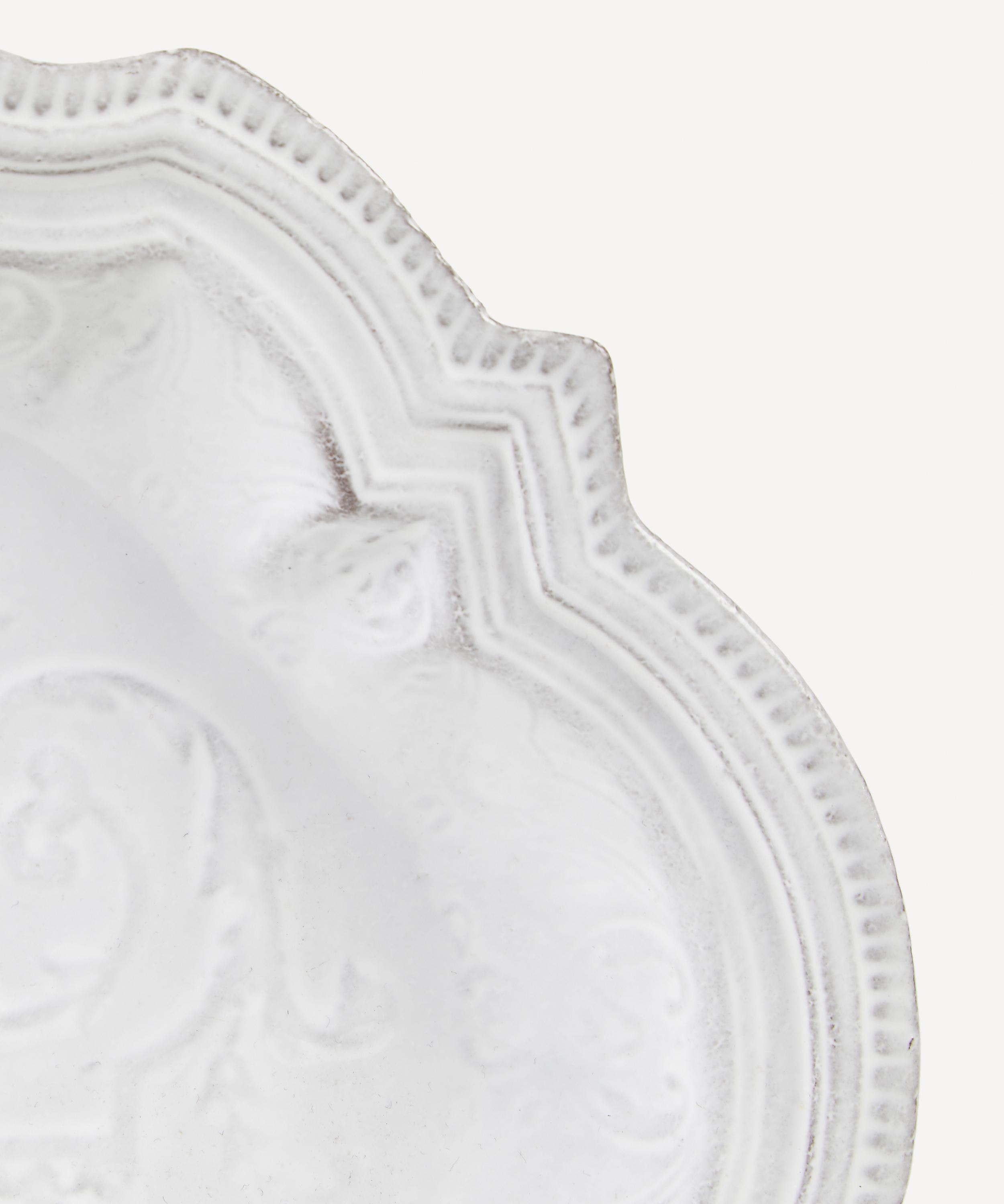 Votary of pre-industrial fabrication, Astier de Villatte is celebrated for being the one and only studio in Paris to hold and harbour the traditions of artisanal ceramic production. Restoring the ancestral systems of moulding and stamping, the ornamental platter is made using handcrafting techniques from the Middle Ages which involve moulding a handmade sheet of clay, double firing the ‘biscuit’ piece and glazing the product in white enamel – a lengthy process that involves a drying time of up to one month. Characterised by a decadently shaped rim and subtle indentations, the ornamental platter is engraved with the brand’s signature crest - depicting an interlacing A & V - alongside the initials of one of the 40 master artisans who created it. Each handmade piece tells a beautiful story, it romances and imparts a sense of nostalgia into its owner. Arrange with other ornate platters and plates in the collection to breathe an air of authenticity into your dining collection.