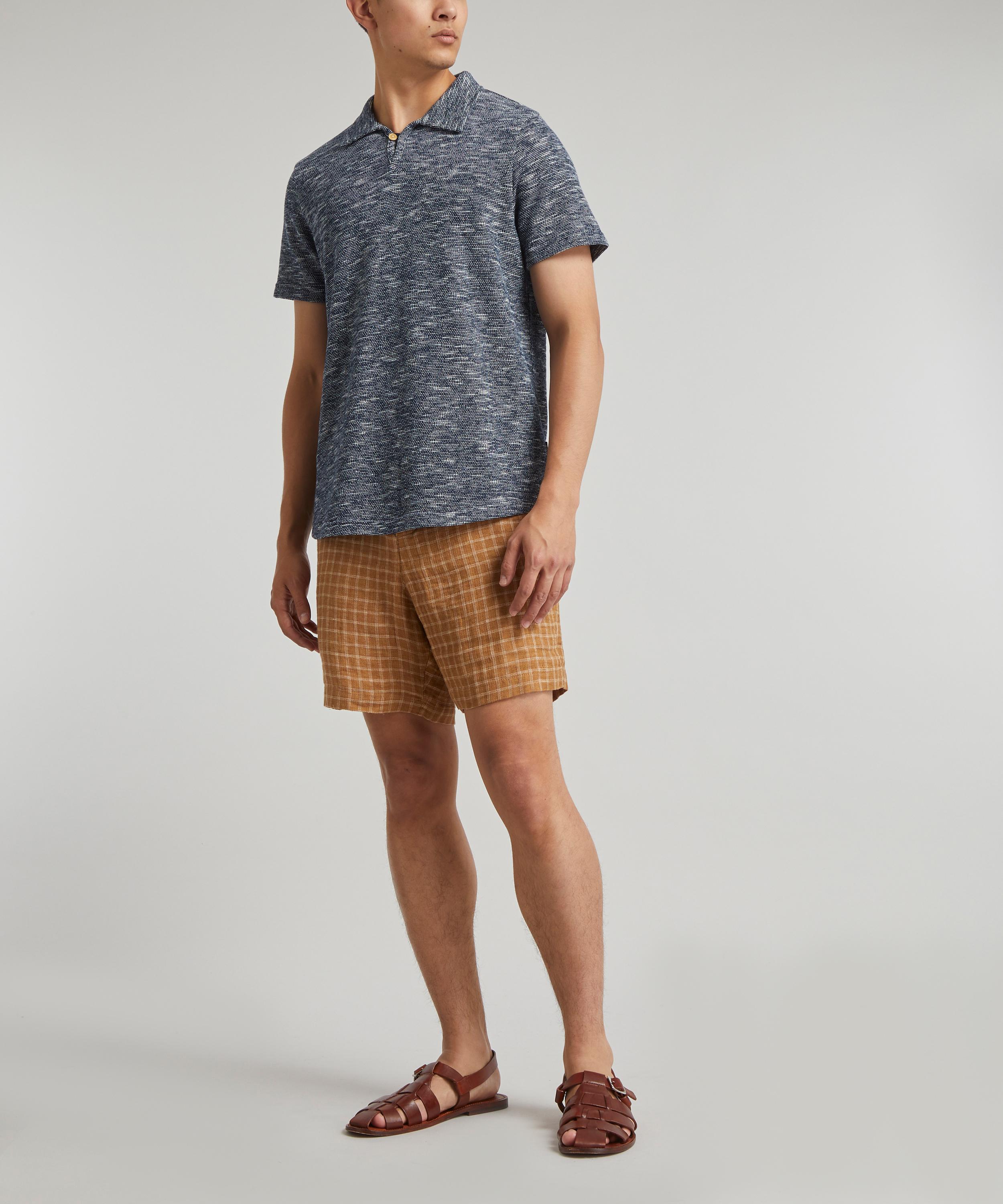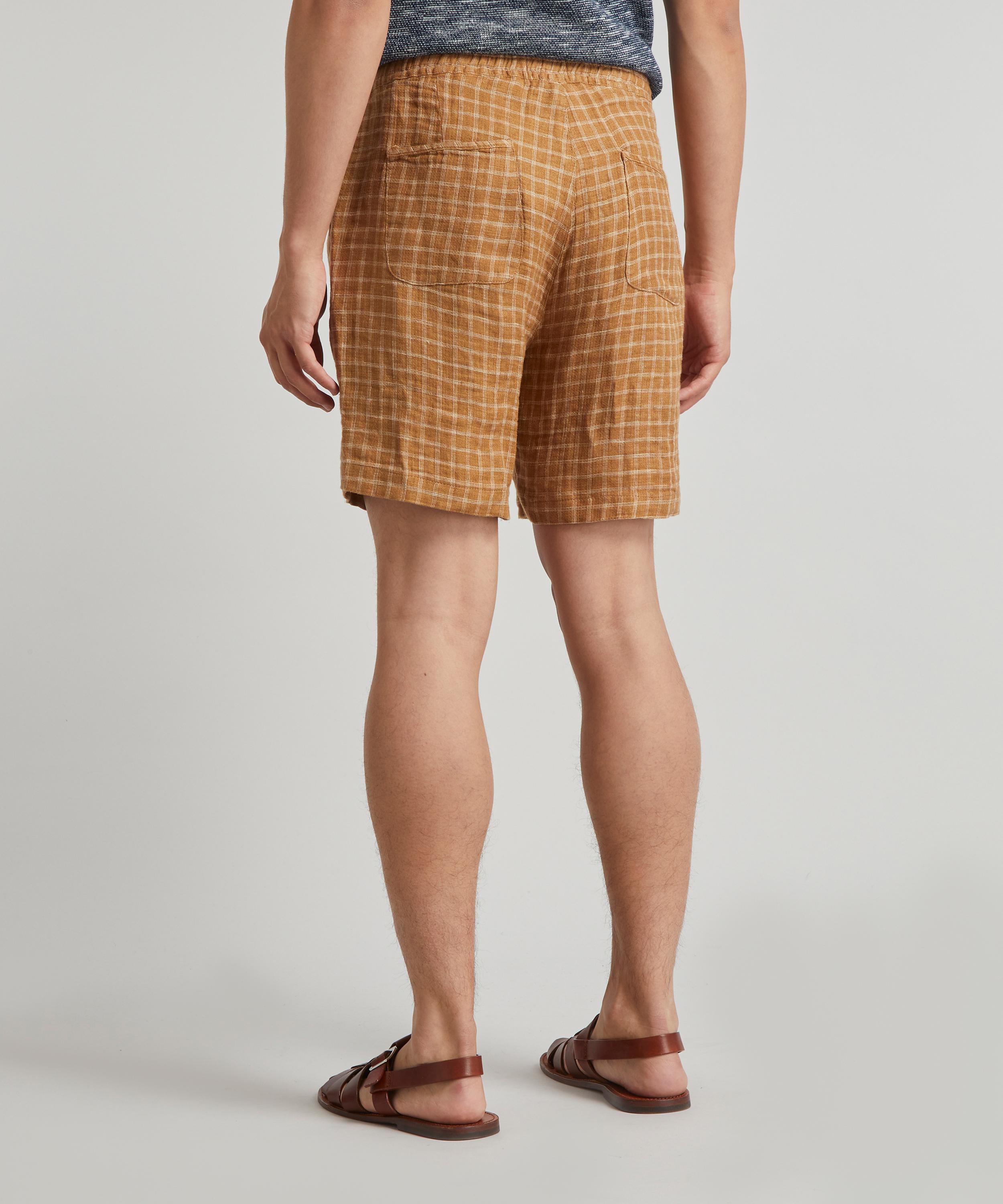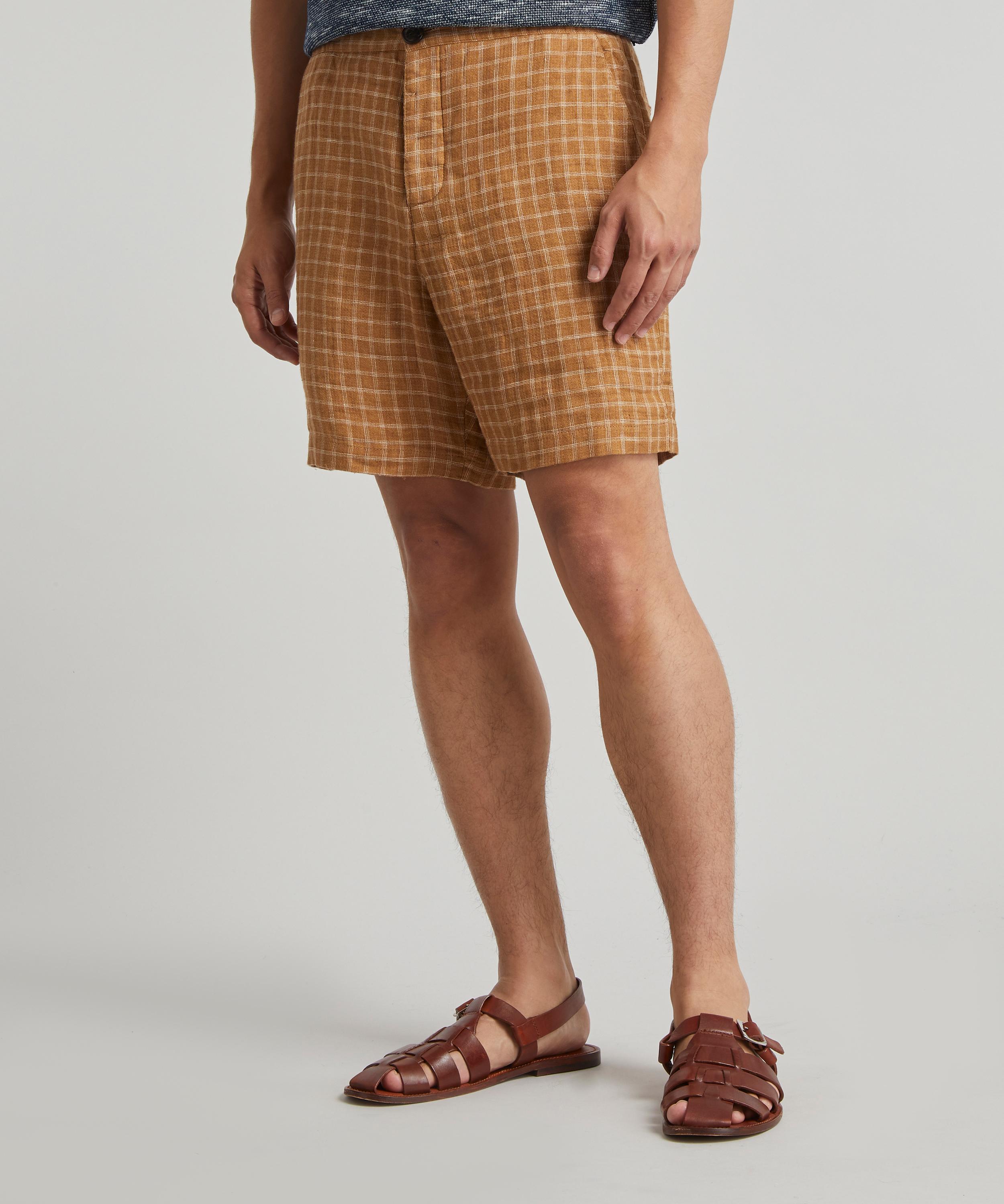 Crafted in lightweight linen cloth in a charming ochre check, these tailored shorts are cut to a relaxed fit that finish above the knee. Featuring an elasticated waistband complete with a concealed drawstring fastening, they’re a supremely comfortable fit. A functional and stylish addition to your summer capsule, simple team them with a polo-neck top and strappy leather sandals.