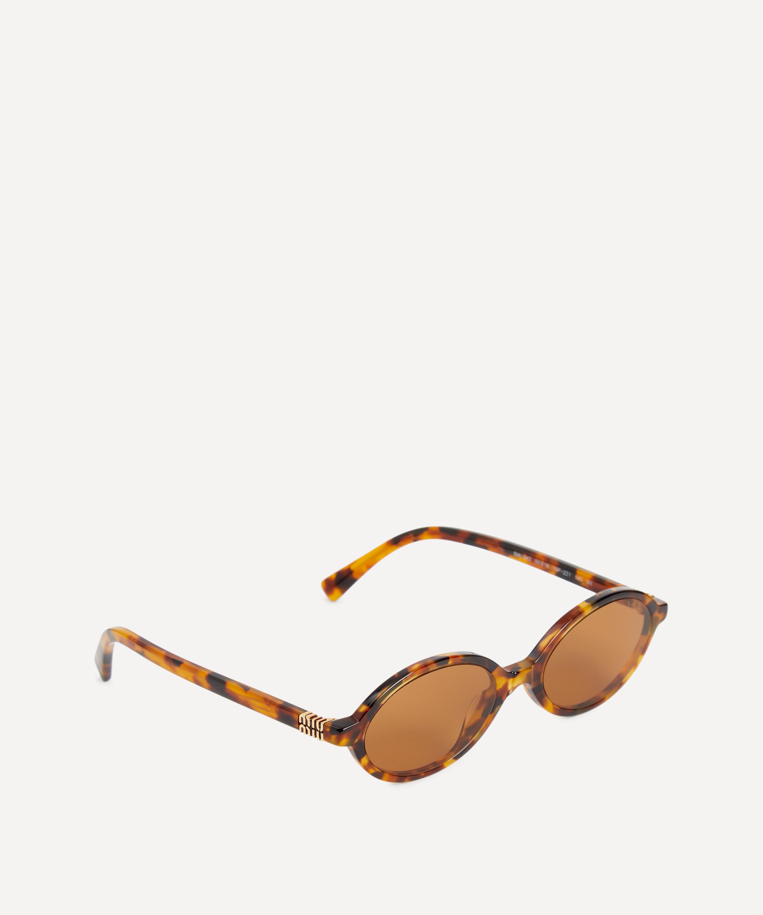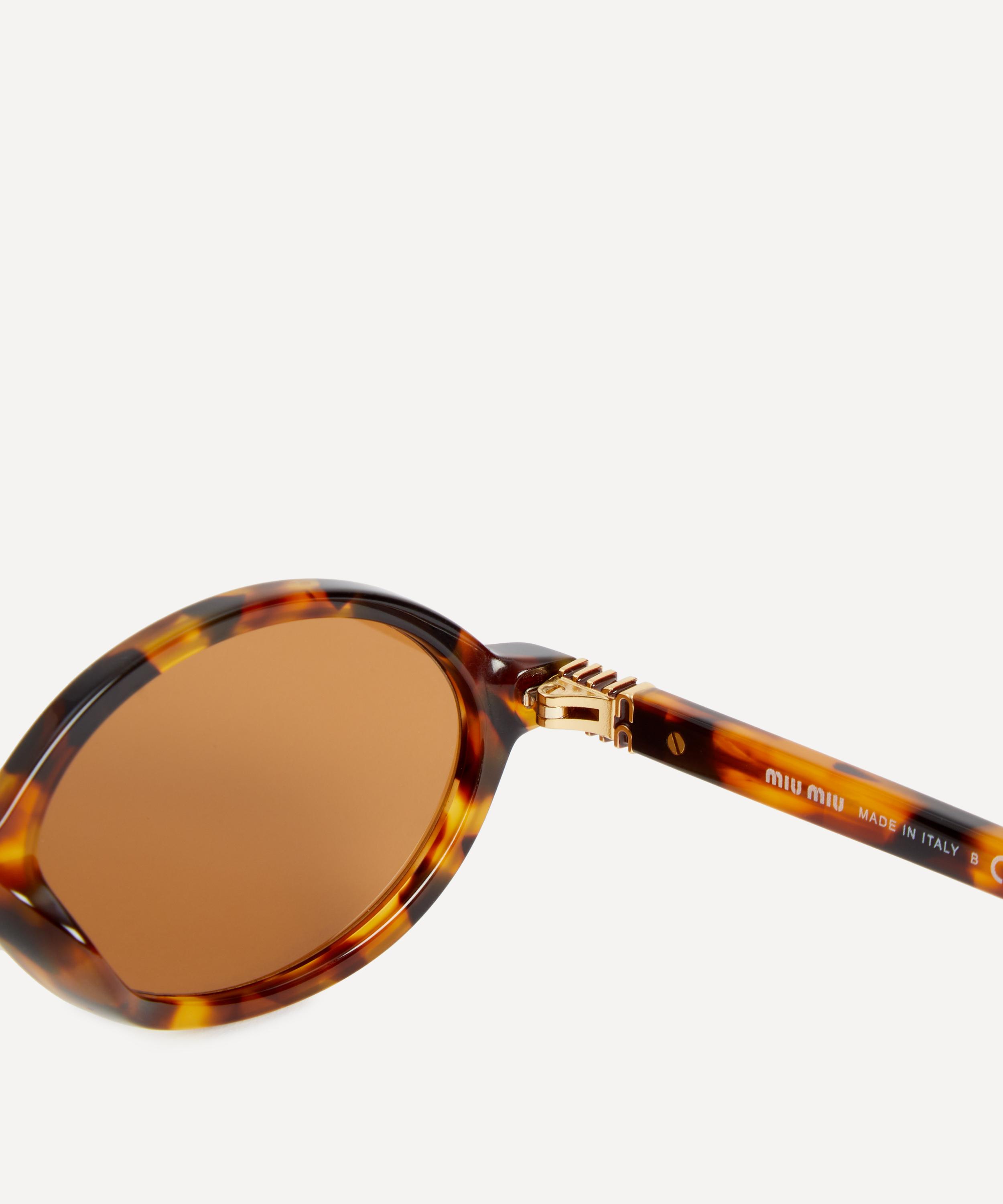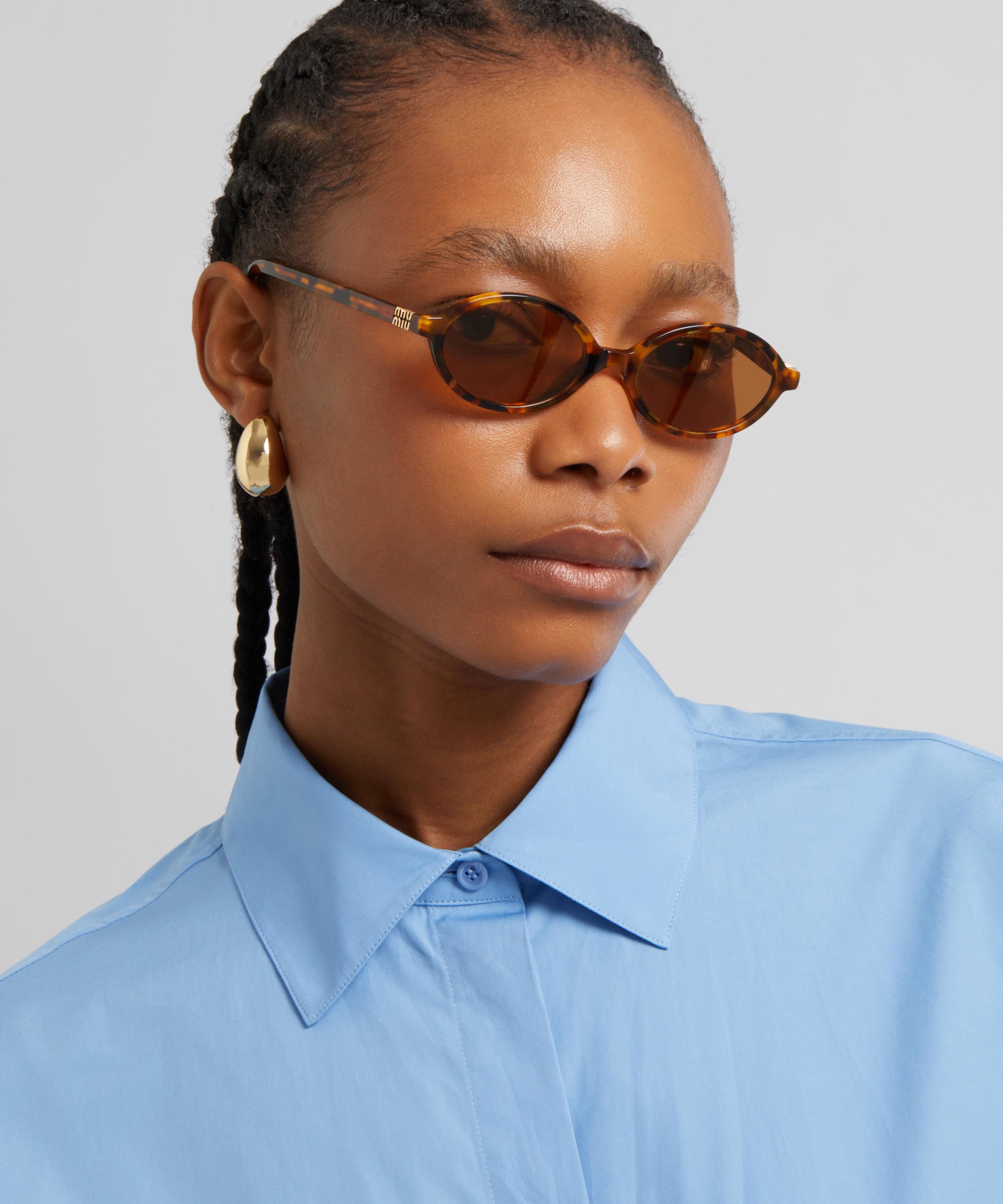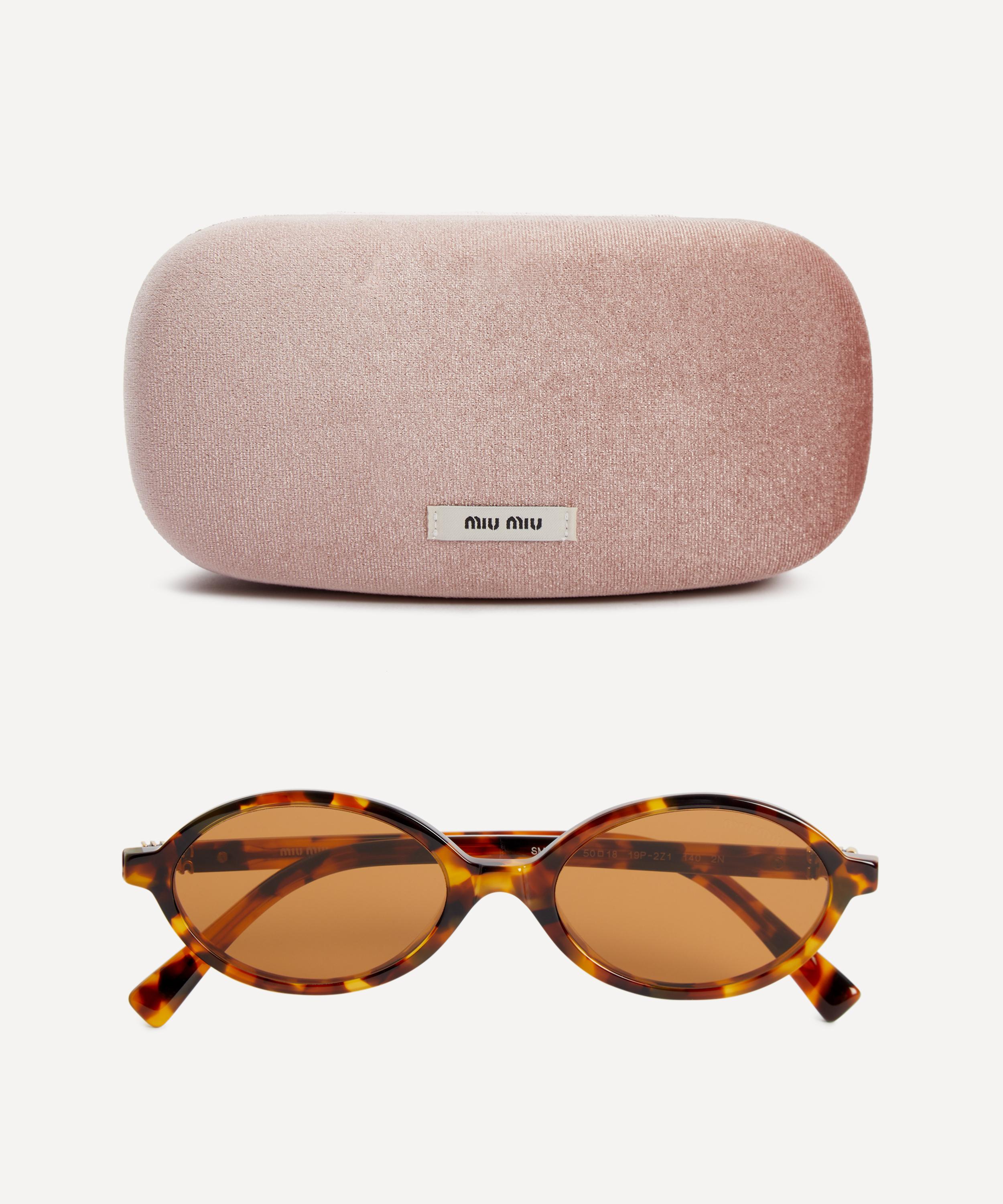 Heighten the impact of any attire with these oval sunglasses from Miu Miu. Expertly crafted from durable acetate in a light Havana colourway, to create a statement pair that instantly draws the eye, these sunnies feature a narrow silhouette fitted with a classic saddle nose bridge and brown-tinted lenses to shade and protect your eyes from UV light. Complete with the signature branding at the temples, they make for an ultra-chic finish.