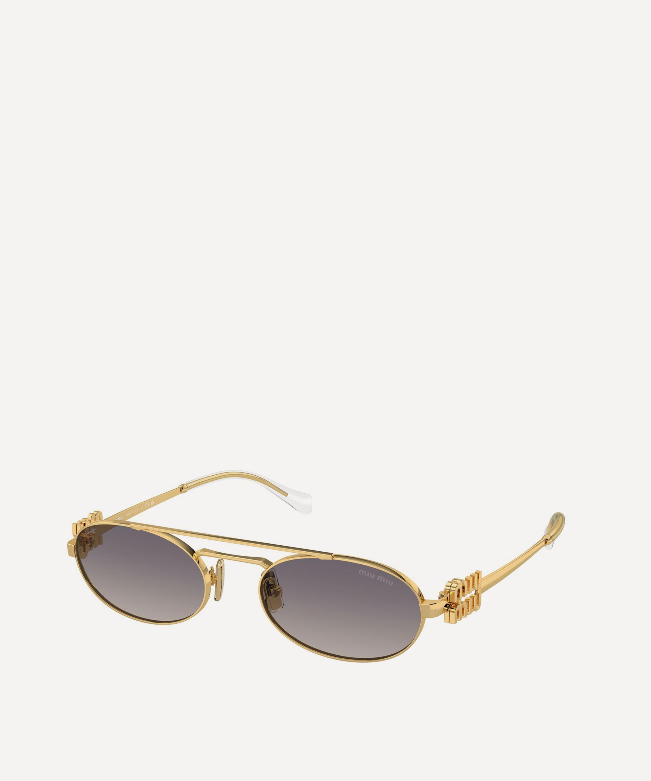 Heighten the impact of any attire with these oval sunglasses from Miu Miu. Expertly crafted from durable metal in a gold-tone colourway, to create a statement pair that instantly draws the eye, these sunnies feature a narrow silhouette fitted with adjustable nose pads, a top bar and grey tinted lenses to shade and protect your eyes from UV light. Complete with the signature branding at the temples, they make for an ultra-chic finish.