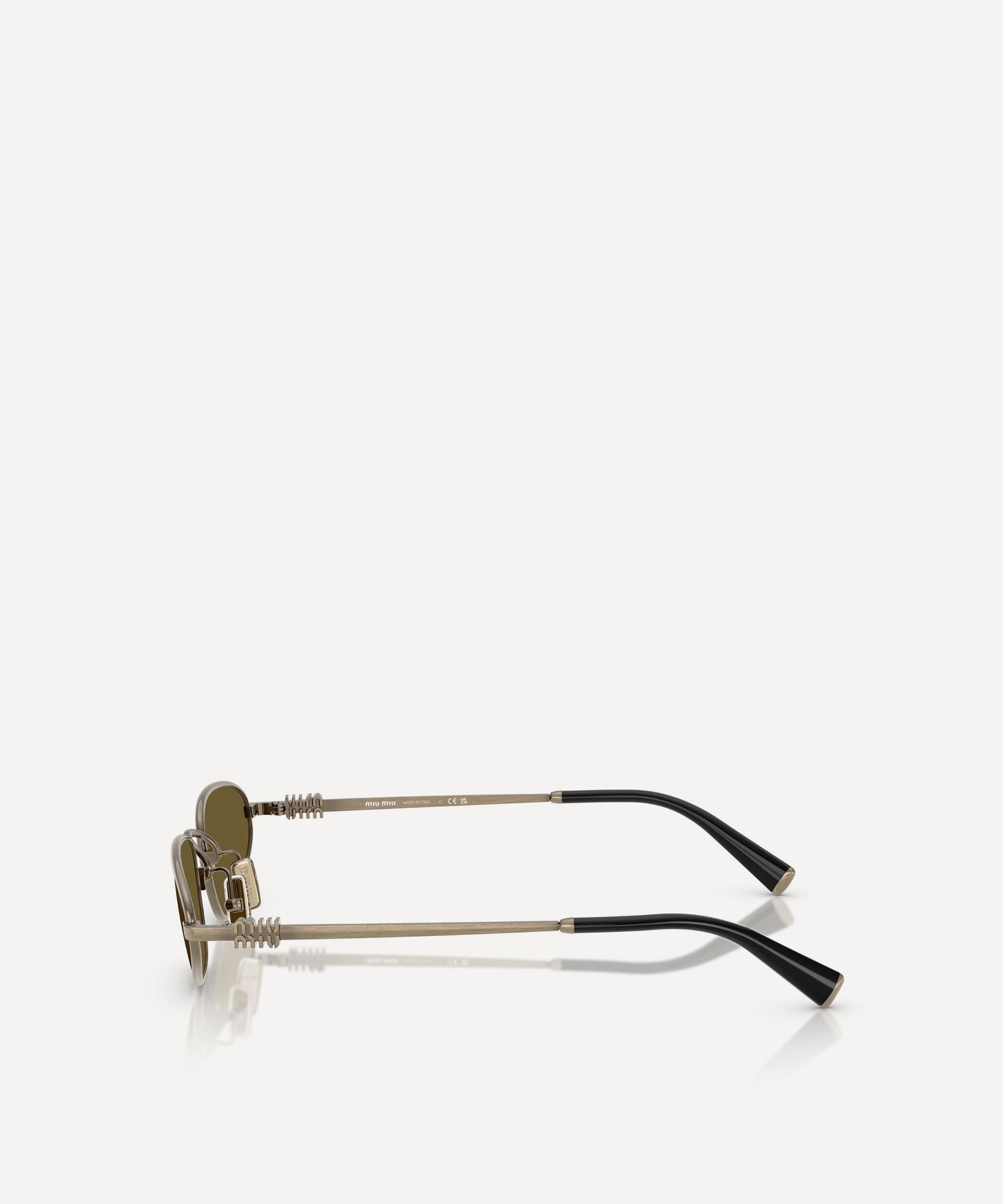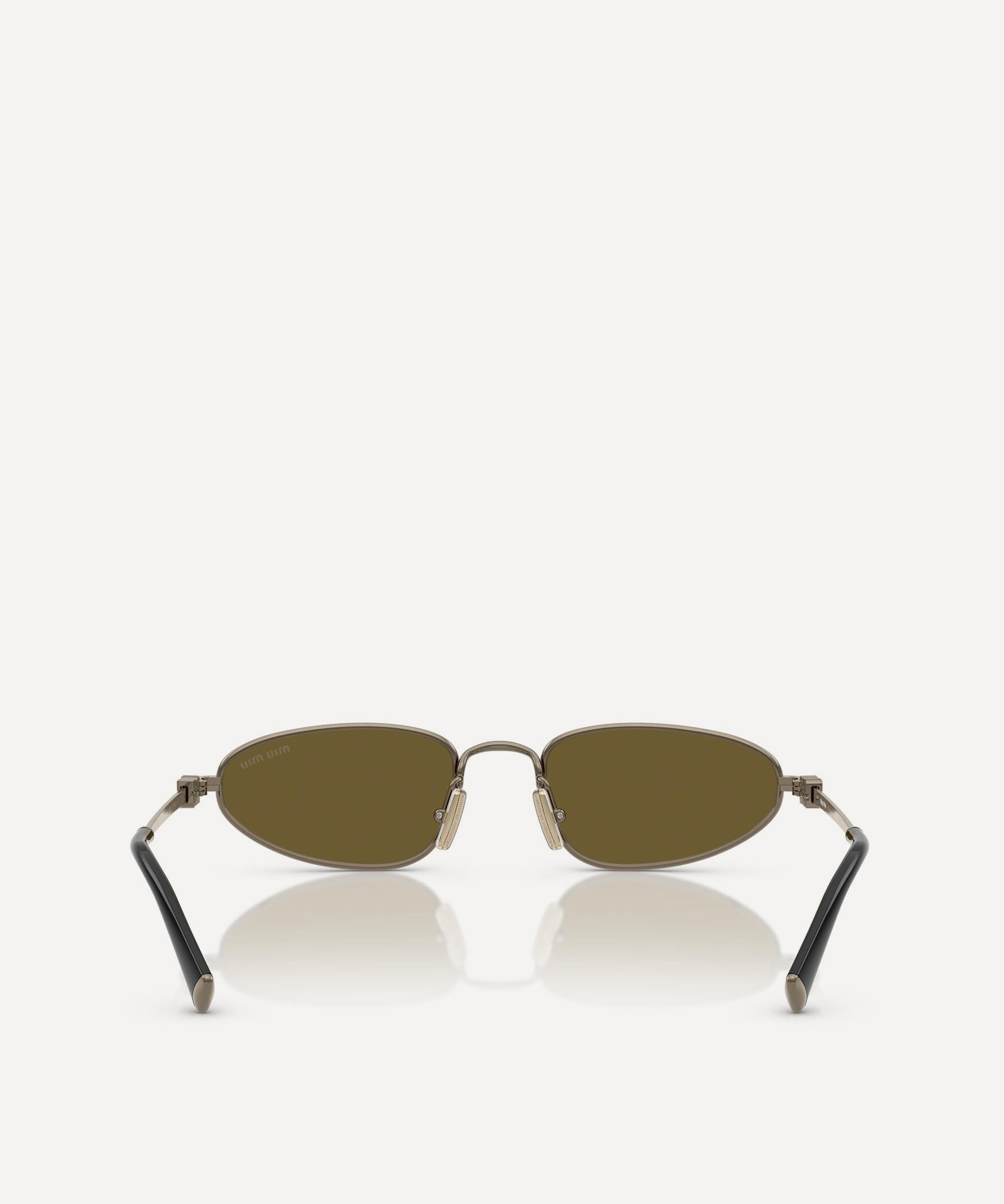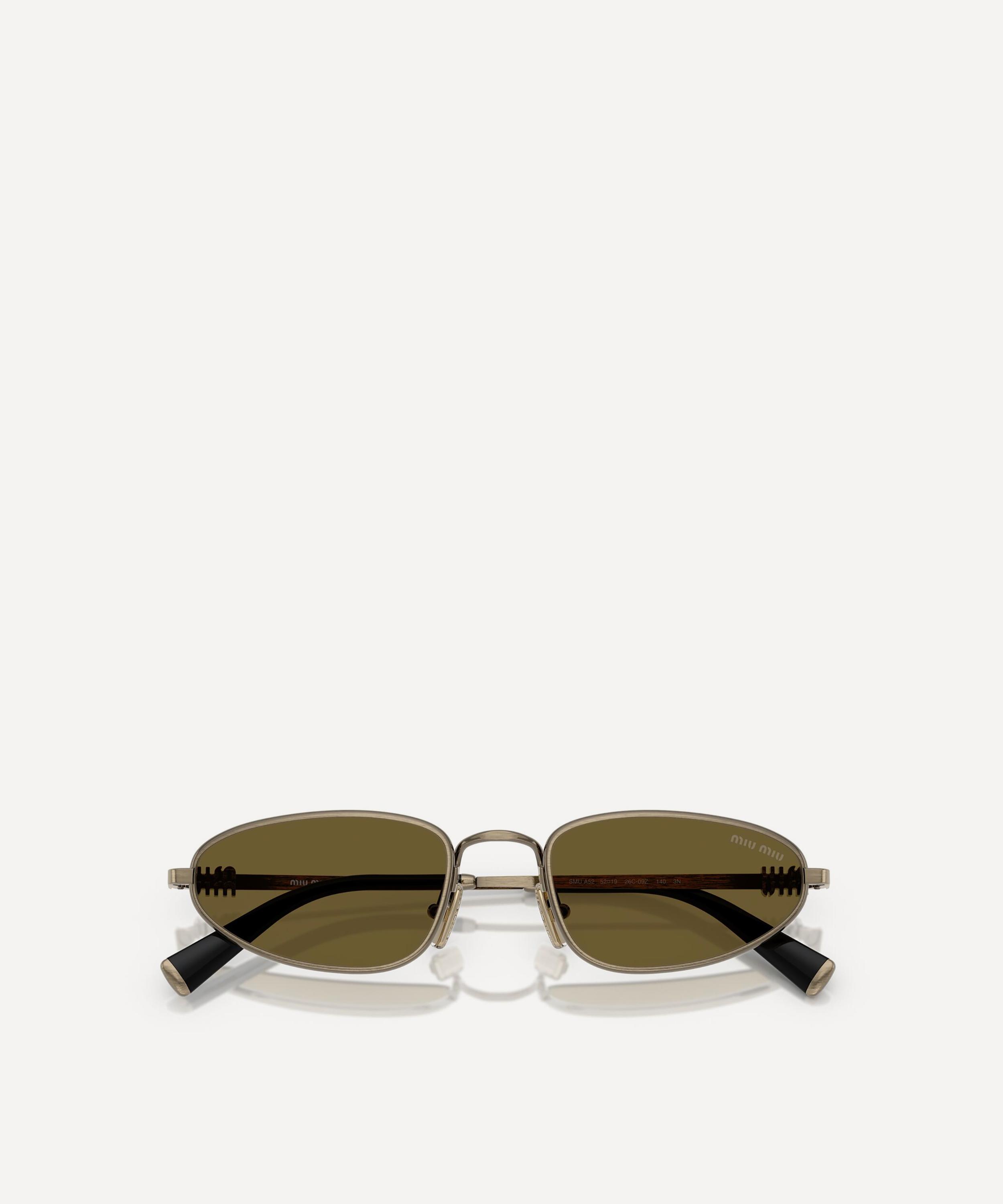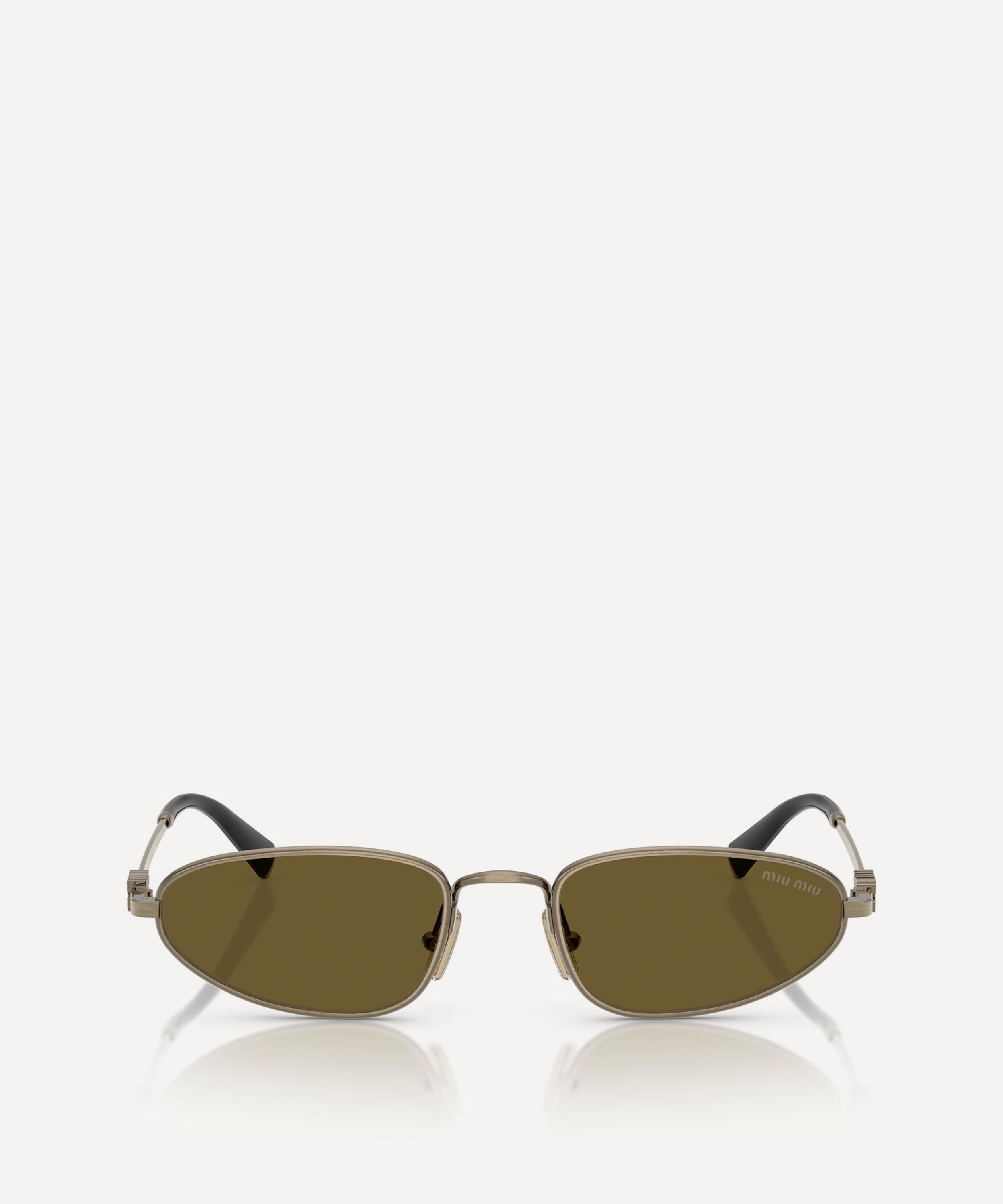 Heighten the impact of any attire with these oval sunglasses from Miu Miu. Expertly crafted from silver-tone metal, to create a statement pair that instantly draws the eye, these sunnies are fitted with adjustable nose pads and brown-tinted lenses to shade and protect your eyes from UV light. Complete with acetate temple tips and the signature branding at the temples, they make for an ultra-chic finish to your curated looks.