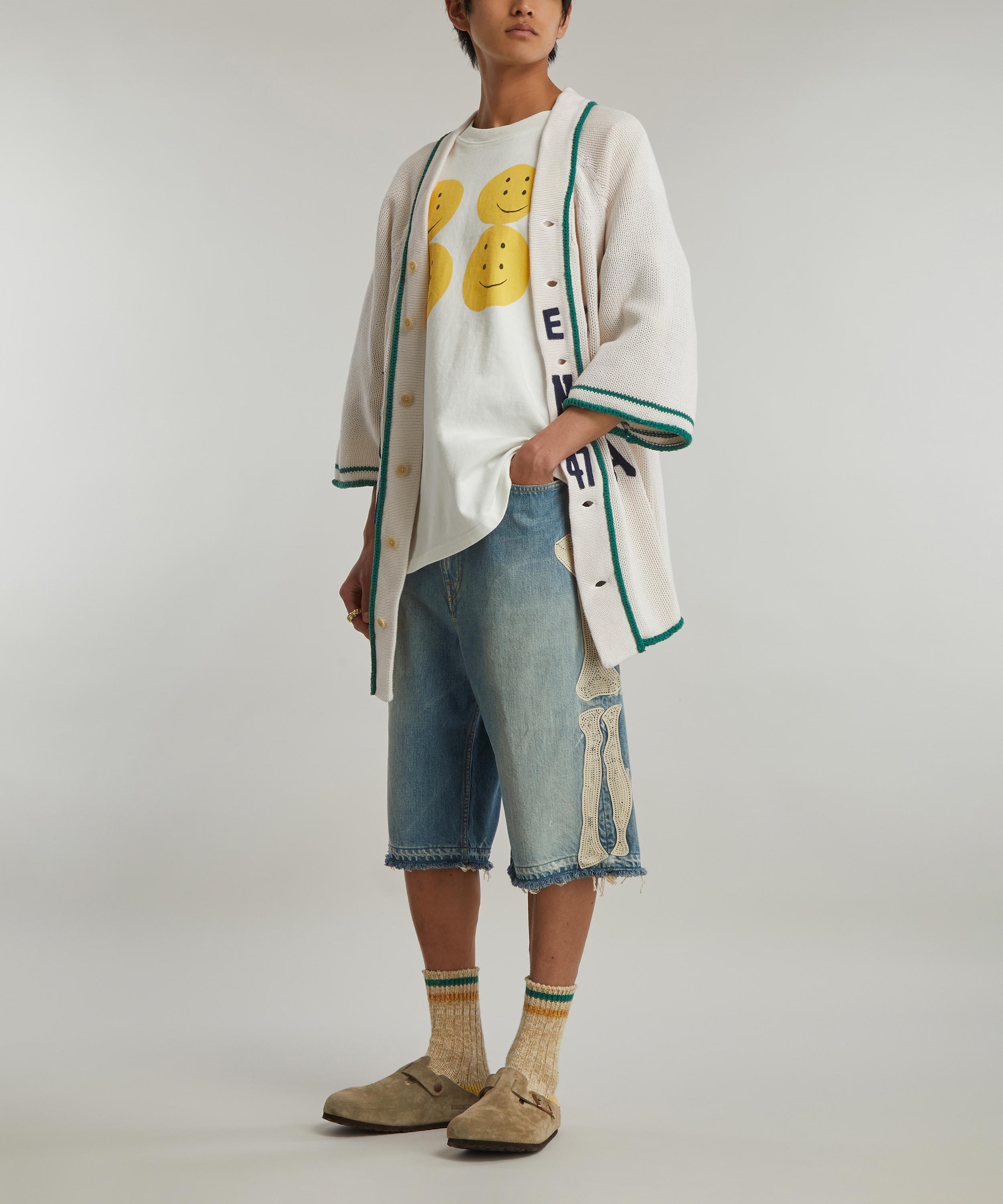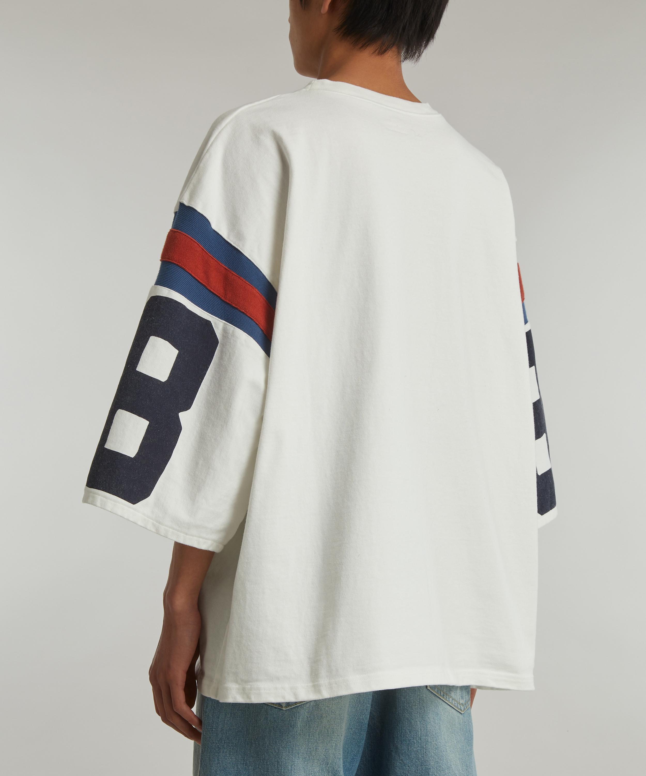 Designed with a modern, streetwear aesthetic, this oversized football t-shirt from cult Japanese label KAPITAL is a casual take on the classic American football jersey. Crafted from cotton jersey for a relaxed fit with signature ‘Smileys’ embossed across the front, its wide-cut dolman sleeves are emblazoned with printed squad numbers and sporty striped panels on the side.