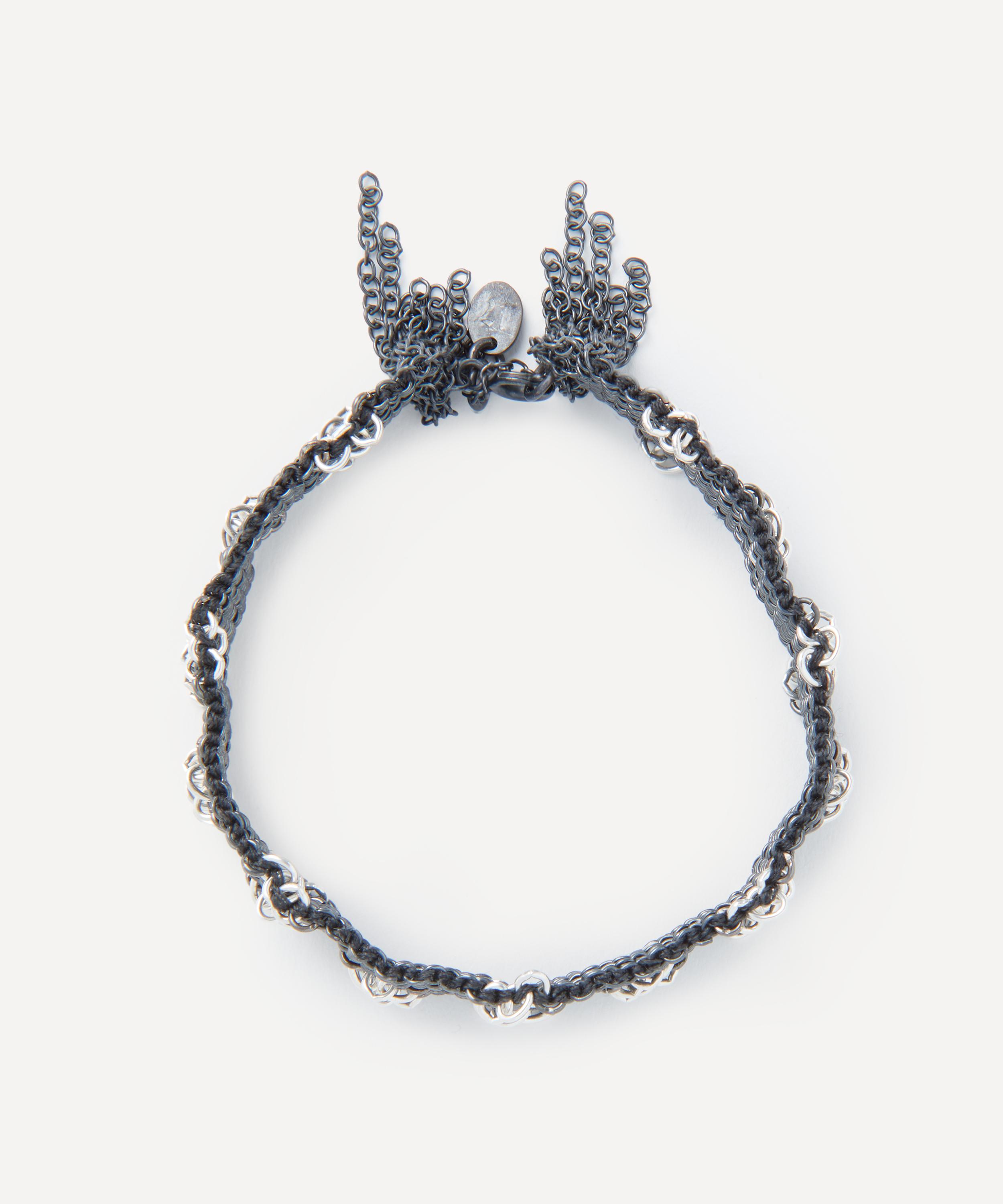 Boasting an edgy addition to your edit, this chain bracelet by Stephanie Schneider showcases the designer’s distinctive chainwork. Handcrafted from oxidised silver, it features a cluster of fine trace chains, threader together to create a chainmail cuff with fringed edging and interwoven silk thread for a tonal effect. Team it with a pair of earrings or a bracelet from the brand’s extensive collection for a co-ordinating finish.