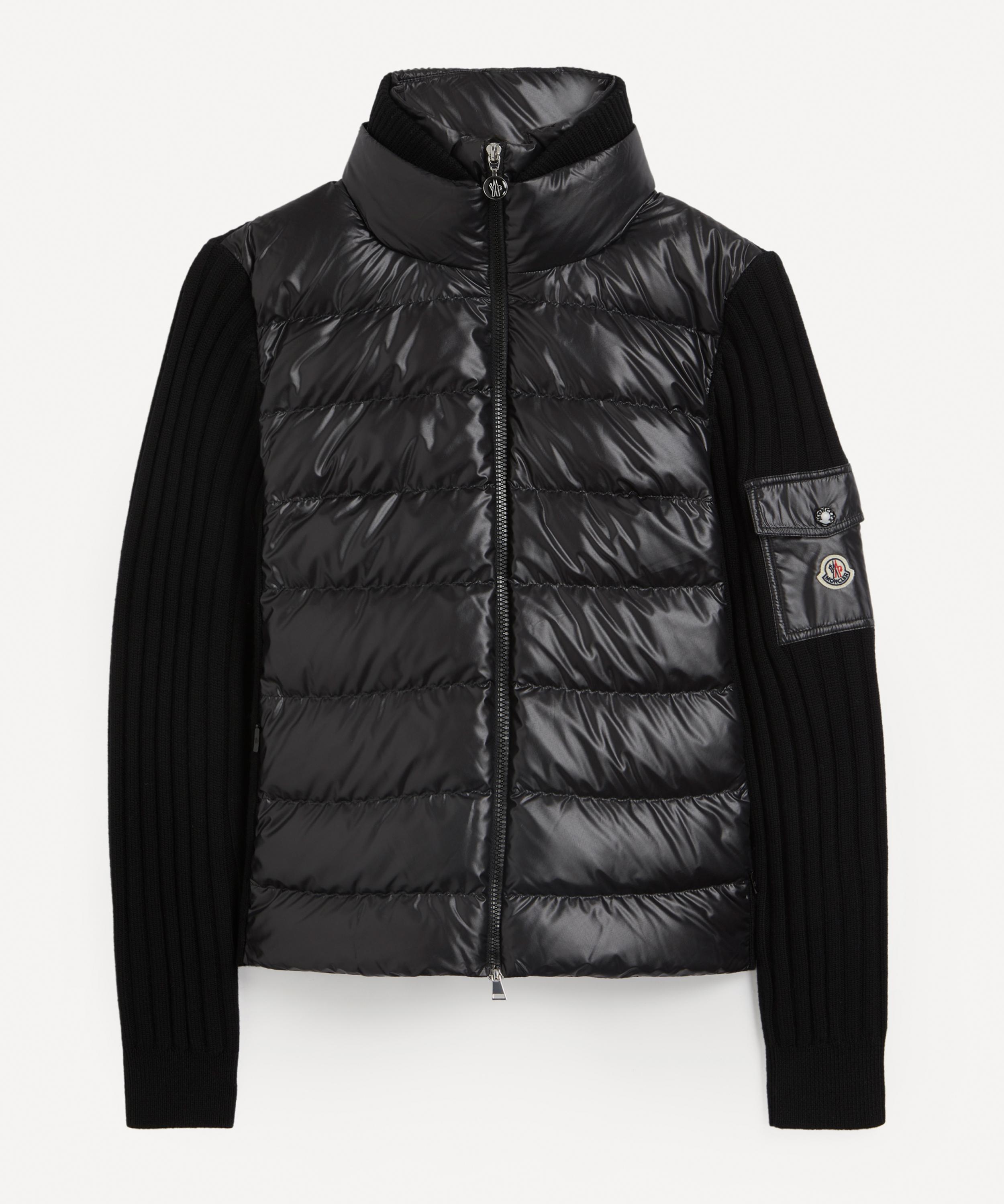 Keeping the chill at bay with its down-filled front, this padded cardigan provides ultimate insulation with its Merino wool ribbed-knit collar, sleeves, and back. Secured with a zip closure, it features kangaroo pockets at the front, and a signature flap pocket on its left sleeve.
