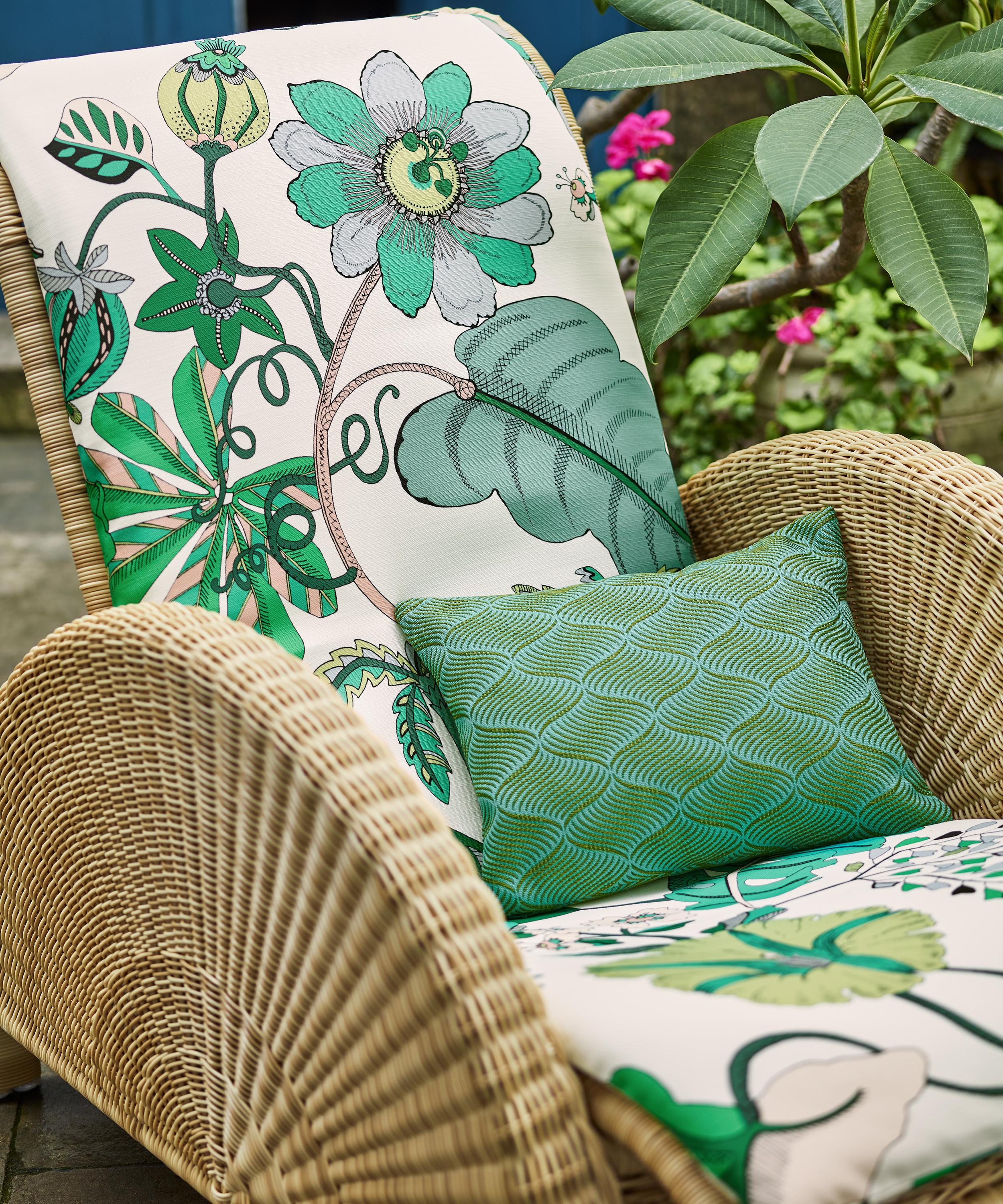 Developed from a silk jacquard in archive, the design is translated into a tone-on-tone, yarn-dyed mid-scale geometric that’s expertly woven onto Westbrook – a beautiful textural fabric, made in Italy using leading performance fibres for outdoor use. The furnishing fabric has superior abrasion, light fastness and water resistance alongside a rich textural effect with excellent depth of colour.